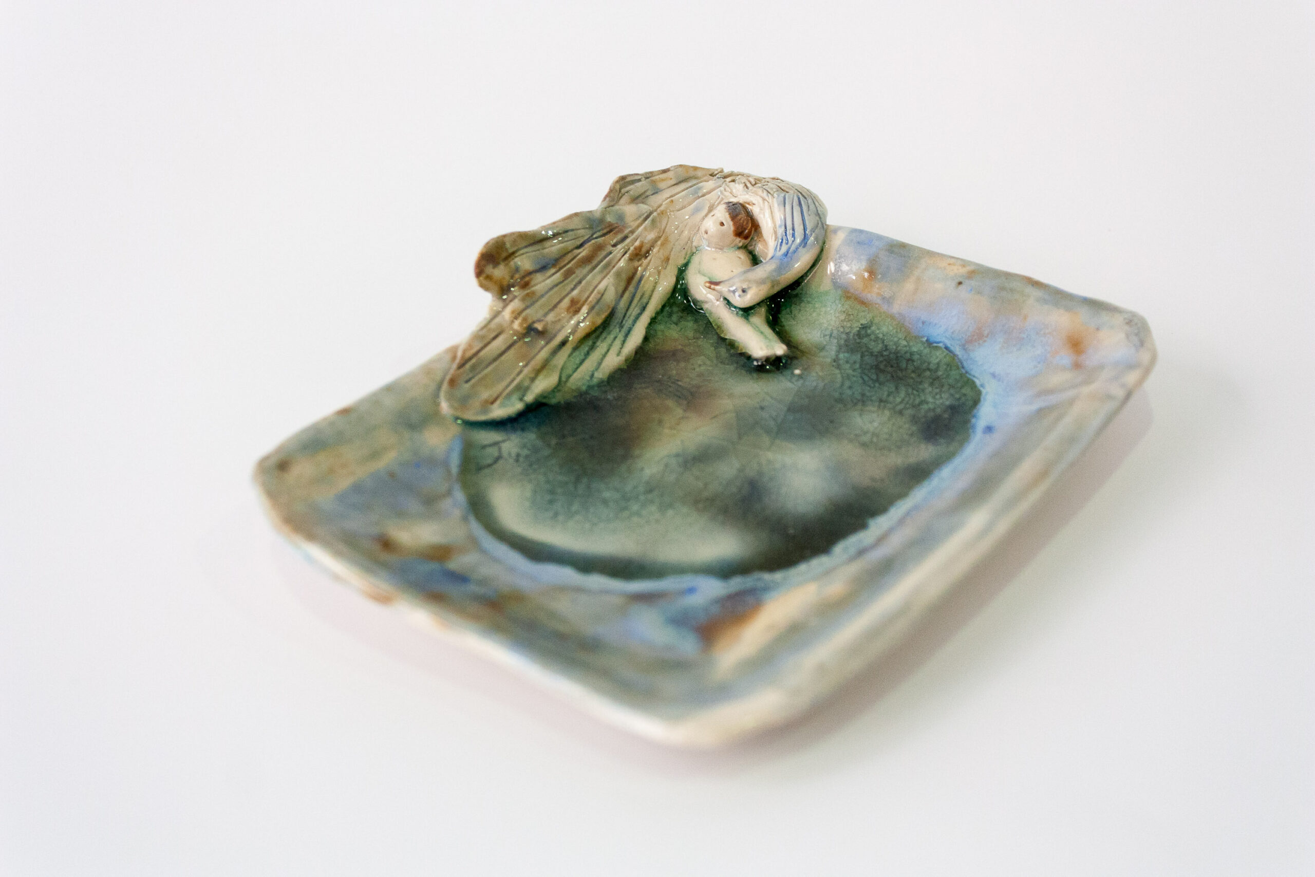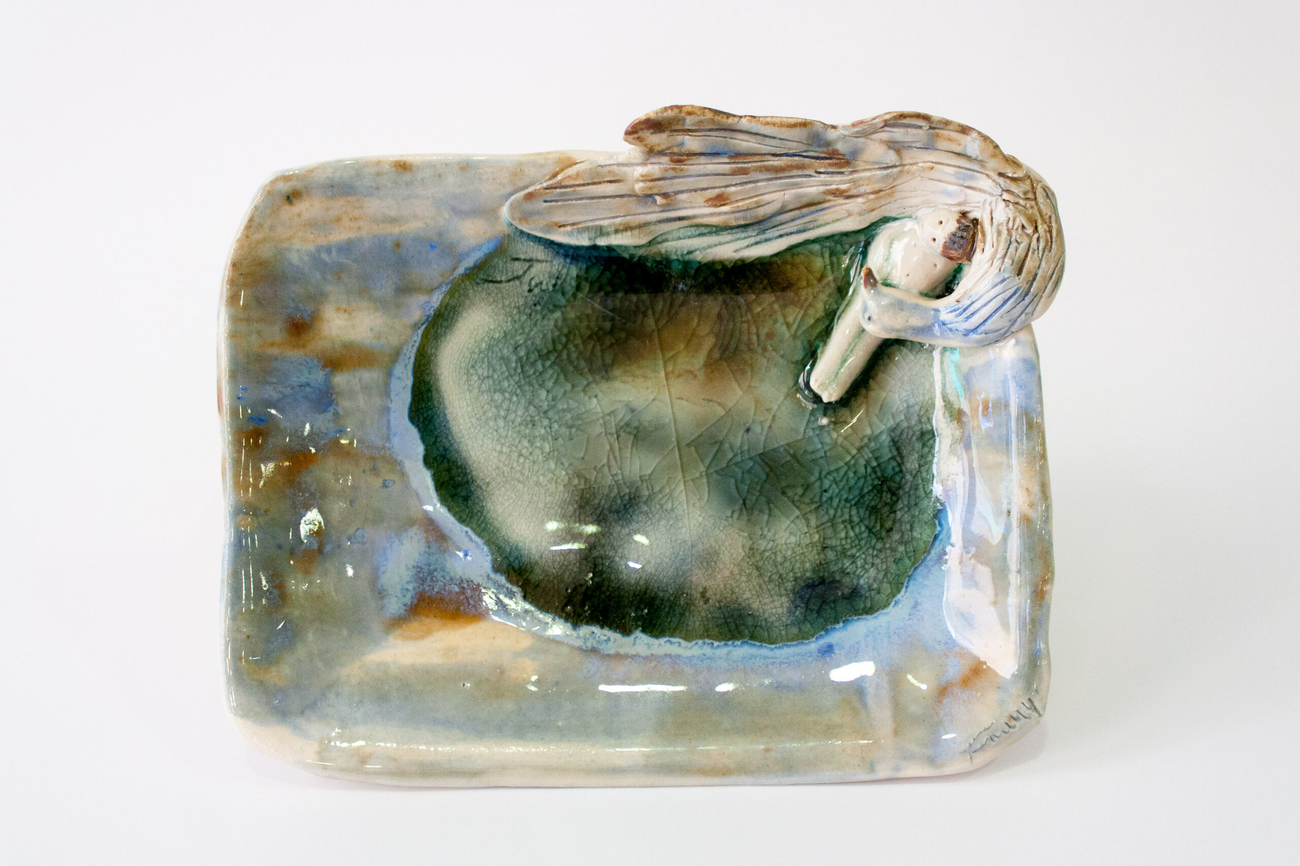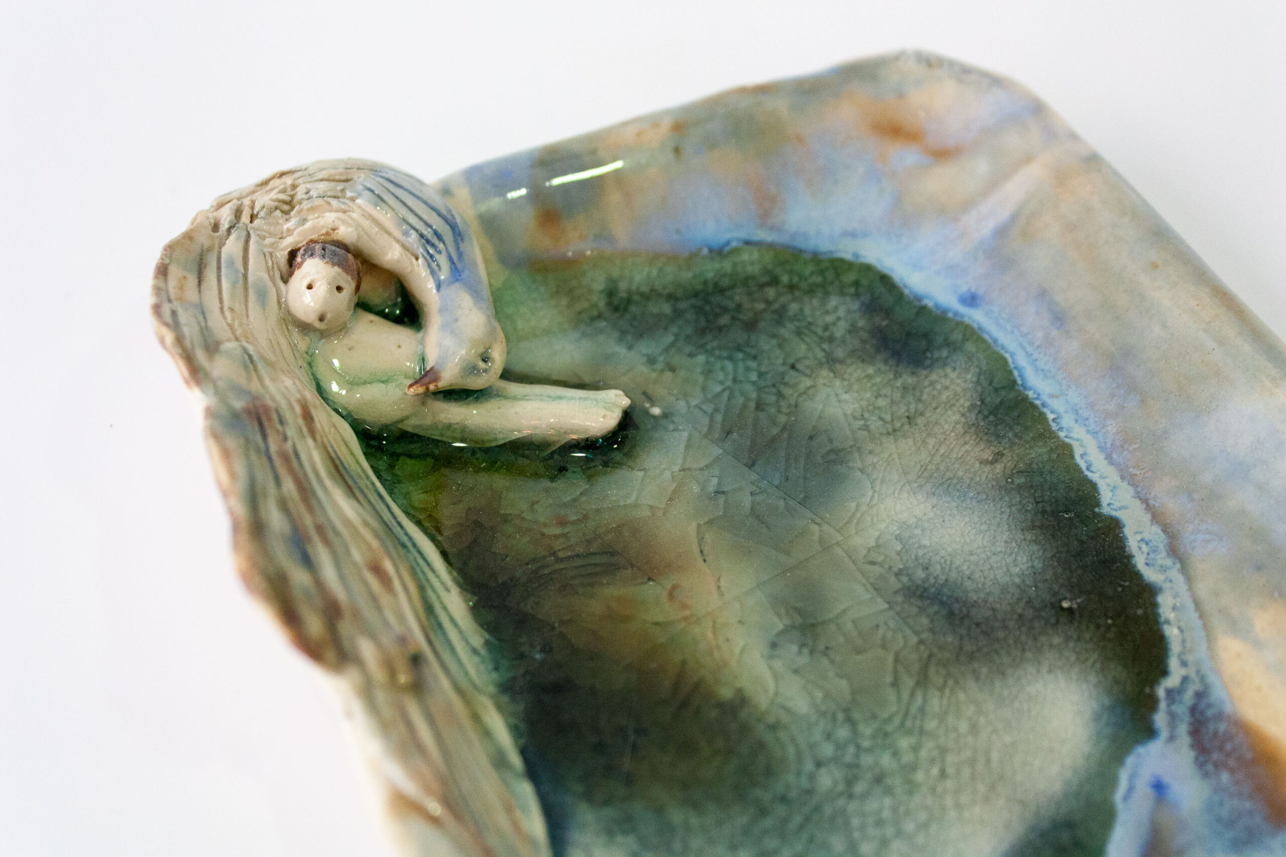 Bandeja de cerámica gres con figuras de niño recostado sobre un cisne esmaltado en alta temperatura y vidrio fundido. Para uso como vaciabolsillos o para depositar tus joyas.
