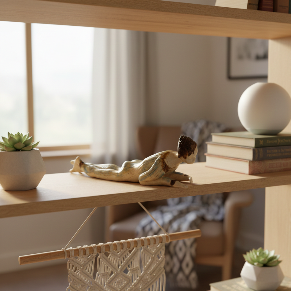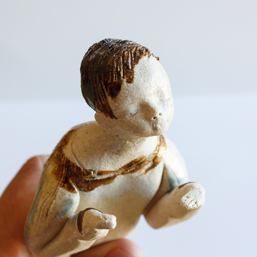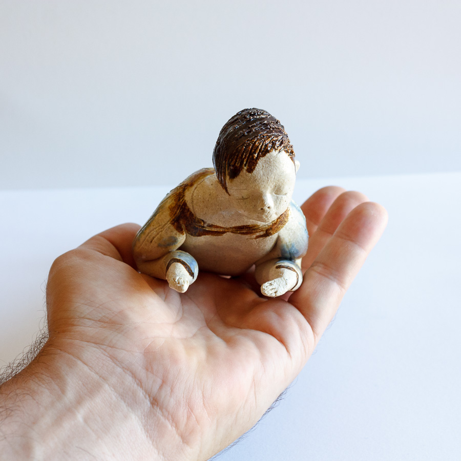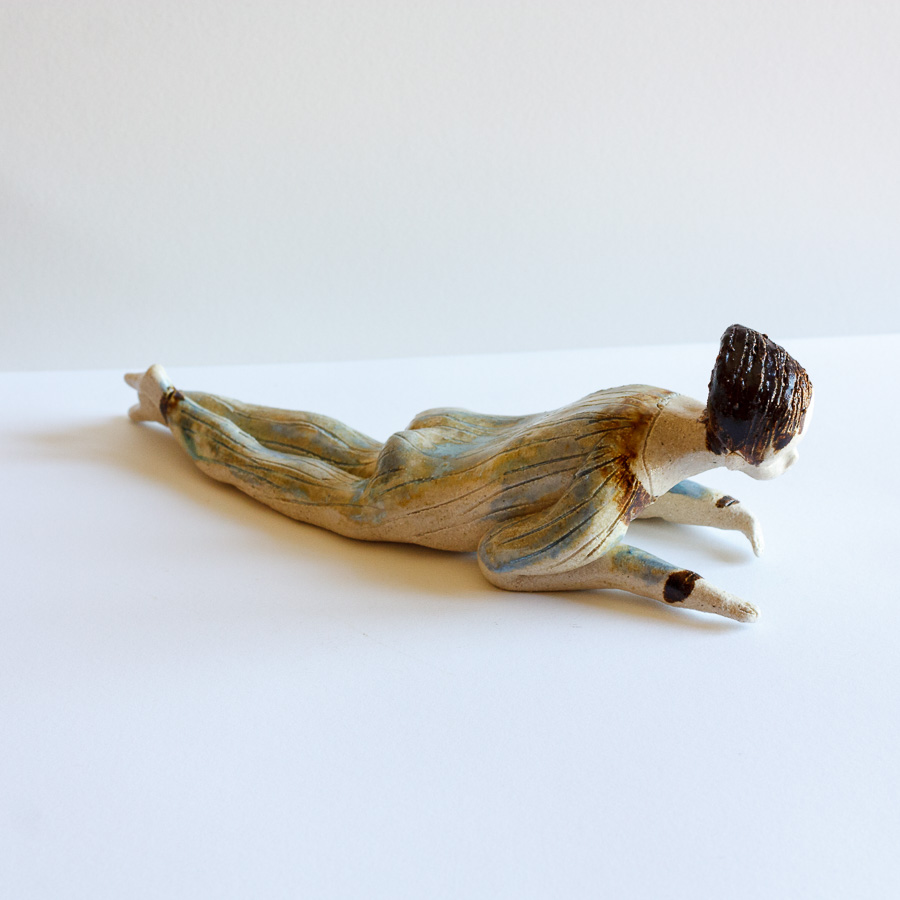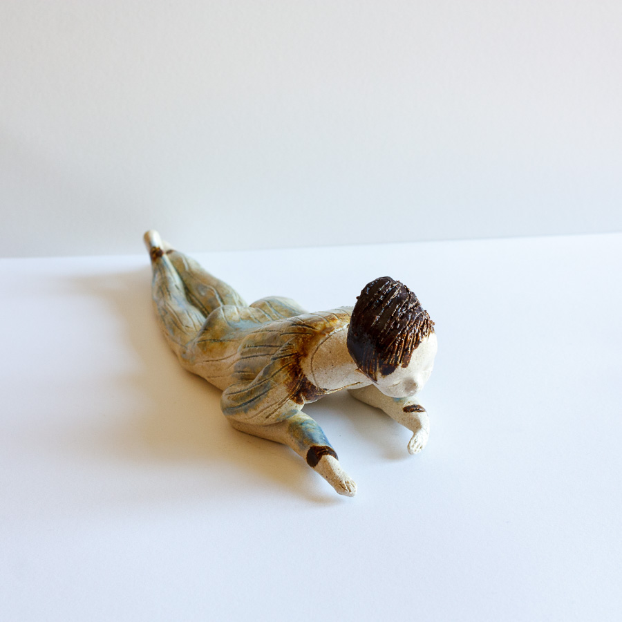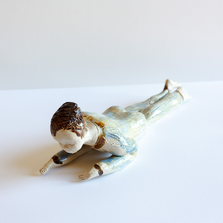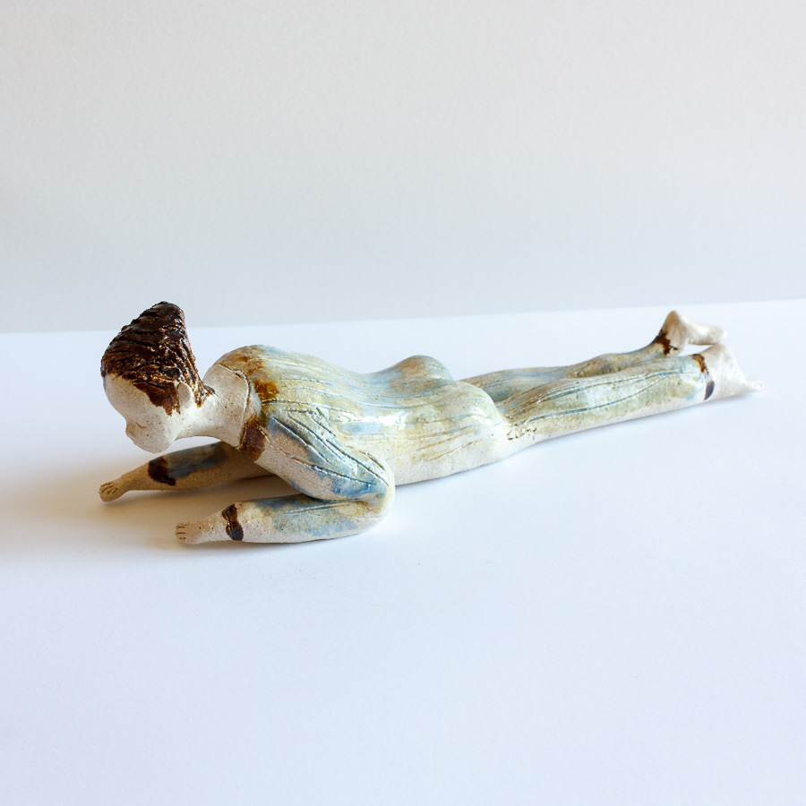 Escultura cerámica de chico tumbado modelado a mano en gres. Decora tu espacio con esta bonita figura colocándola sobre el borde de una balda de estantería, un libro, mesa o cualquier soporte.