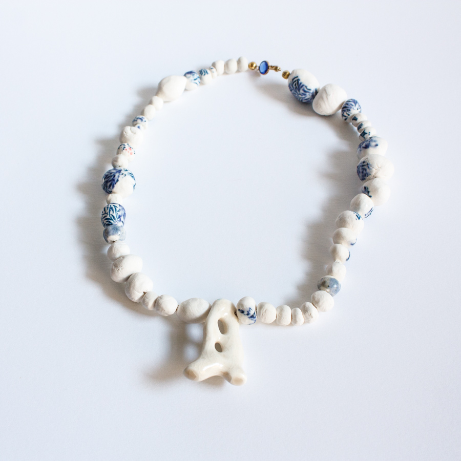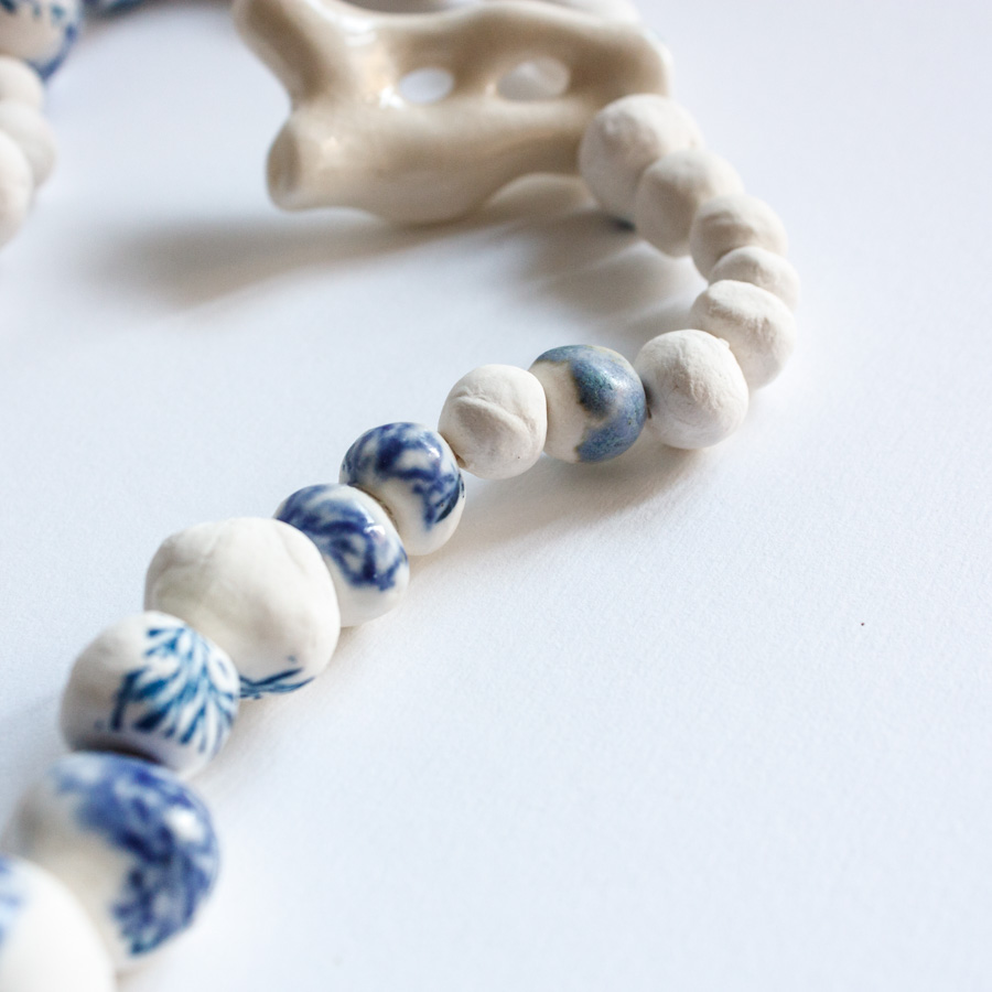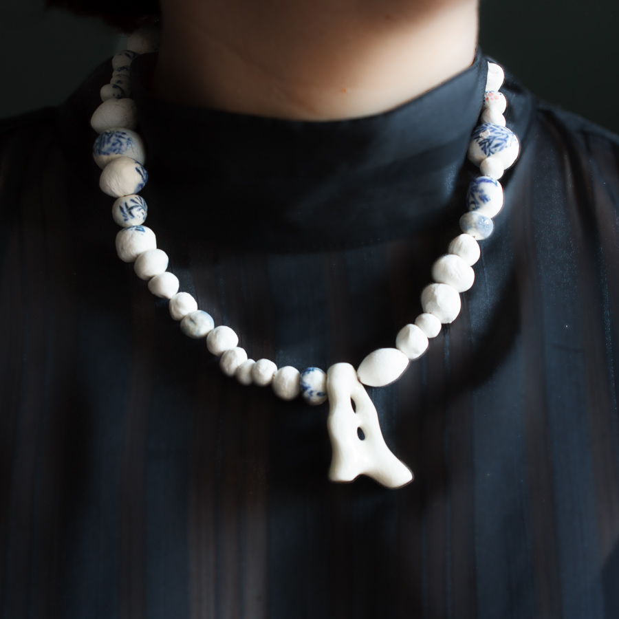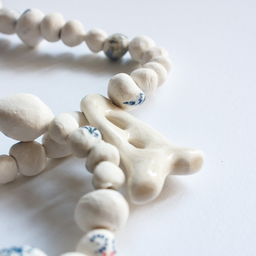Collar compuesto por varias cuentas de porcelana moldeadas a mano, algunas serigrafiadas. La pieza principal representa un colar esmaltado en blanco craquelado.