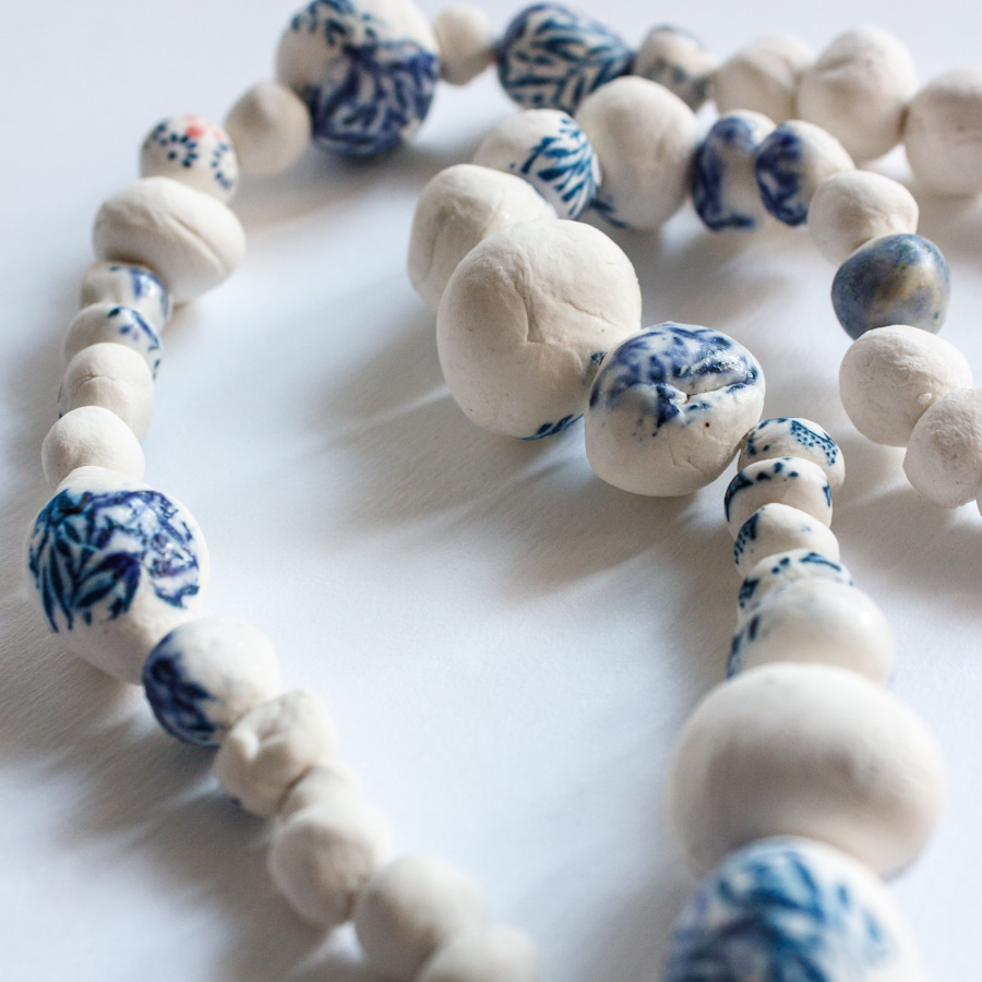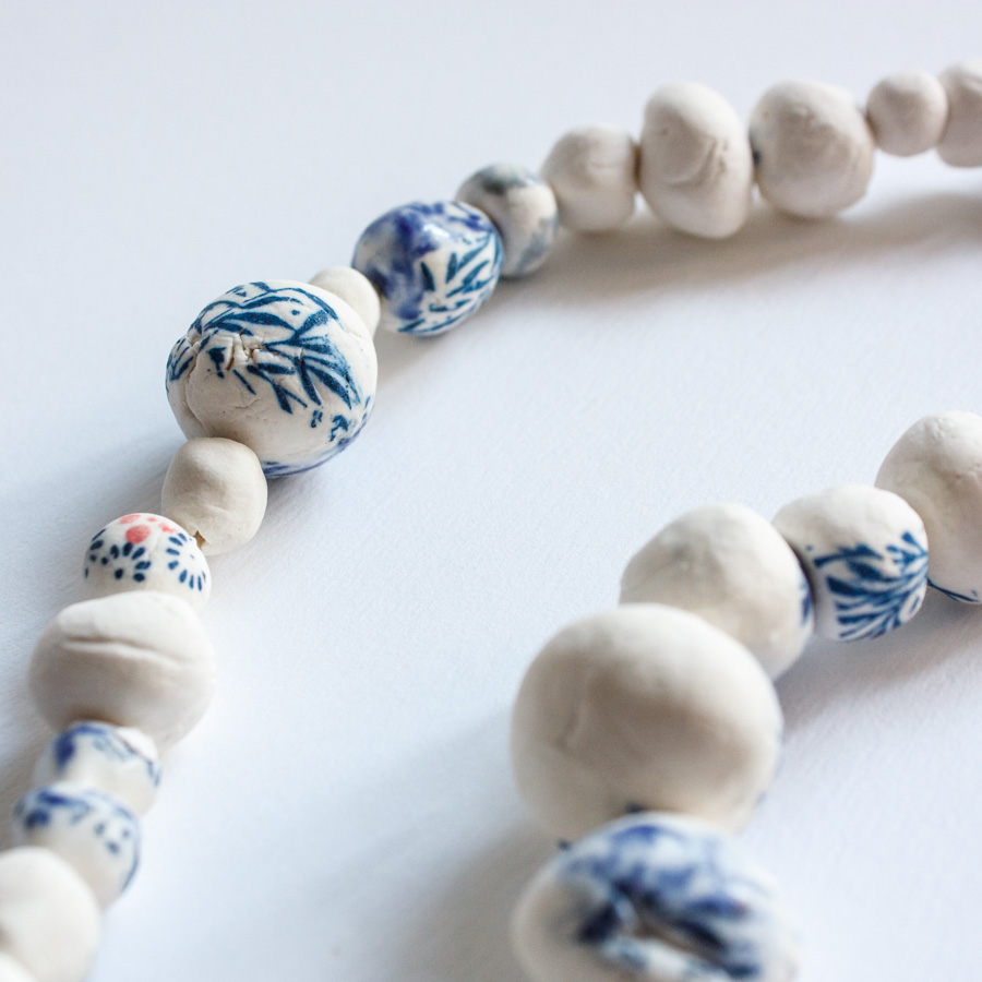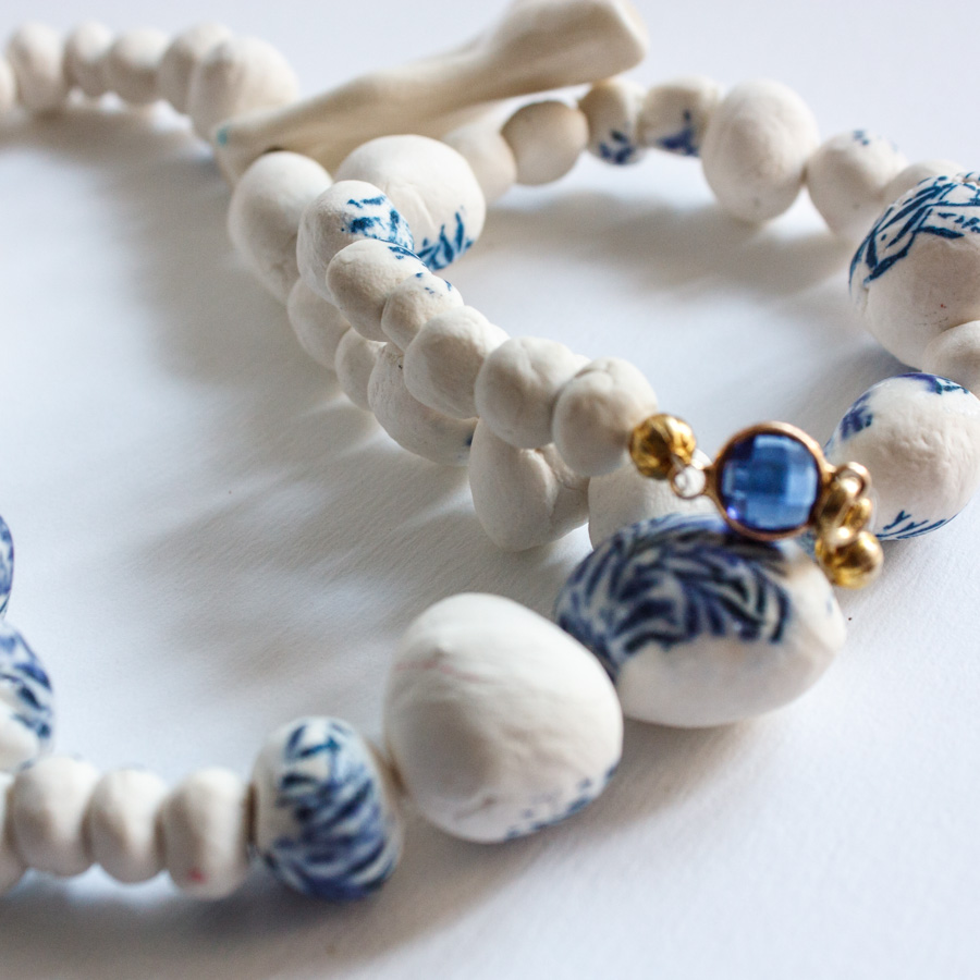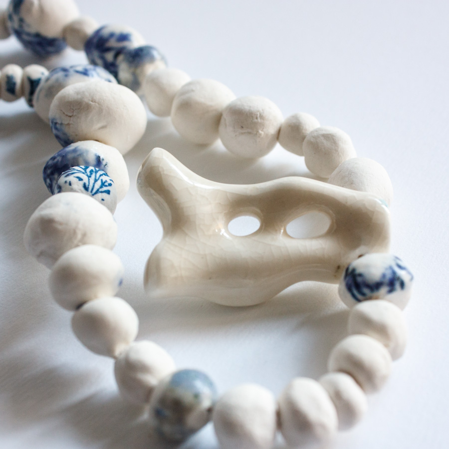 Collar compuesto por varias cuentas de porcelana moldeadas a mano, algunas serigrafiadas. La pieza principal representa un colar esmaltado en blanco craquelado.