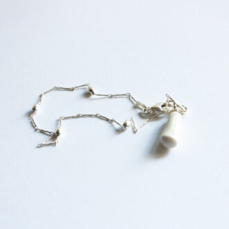 Collar compuesto por varias cuentas de porcelana moldeadas a mano, algunas serigrafiadas. La pieza principal está representada por la figura de un pájaro también en porcelana serigrafiada.