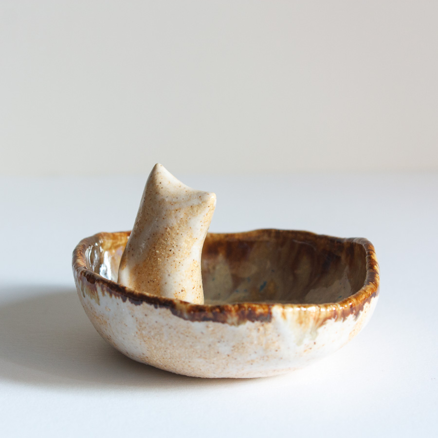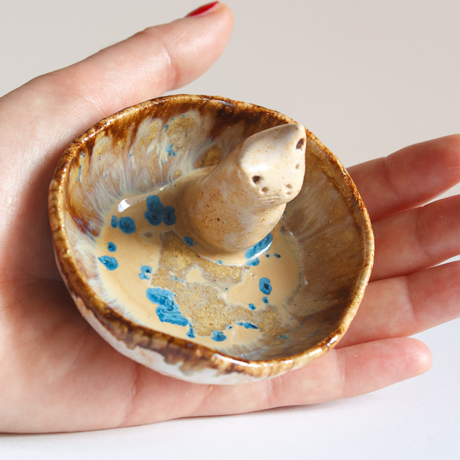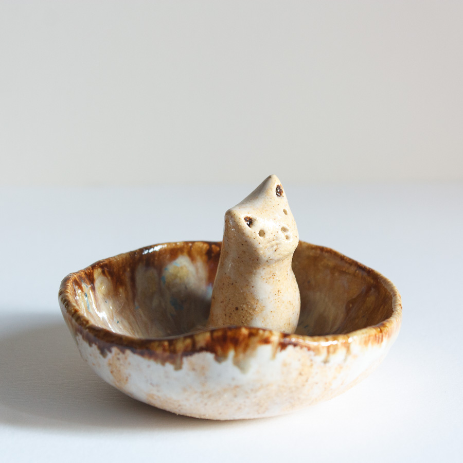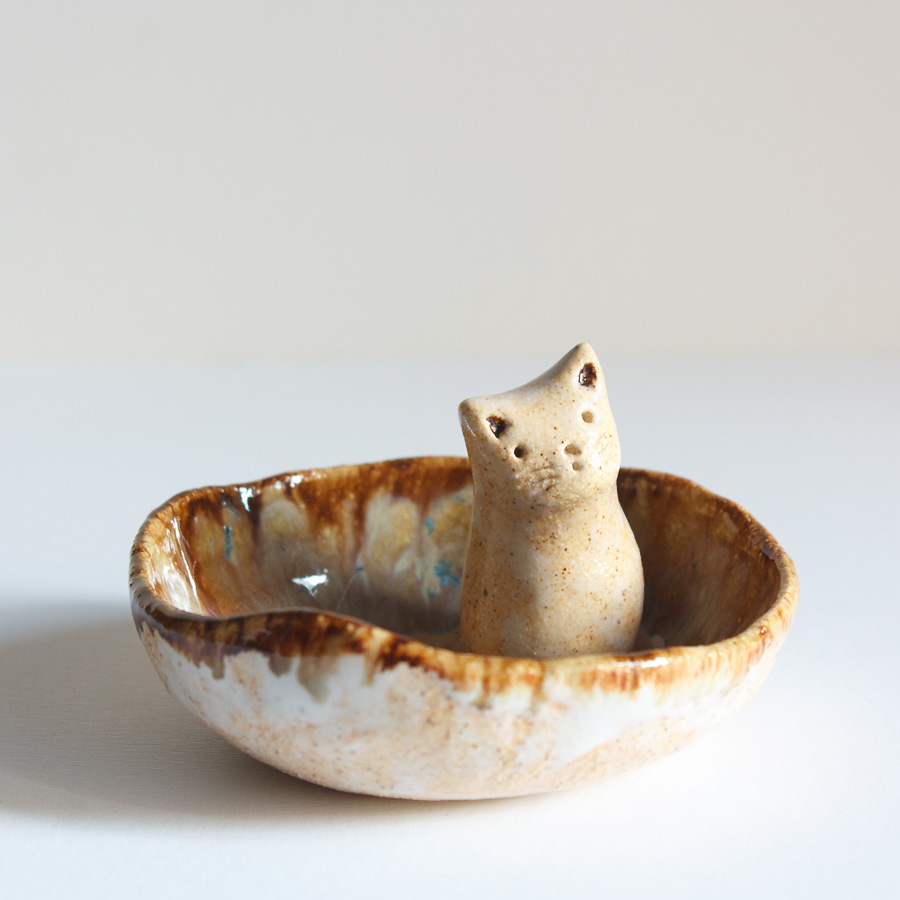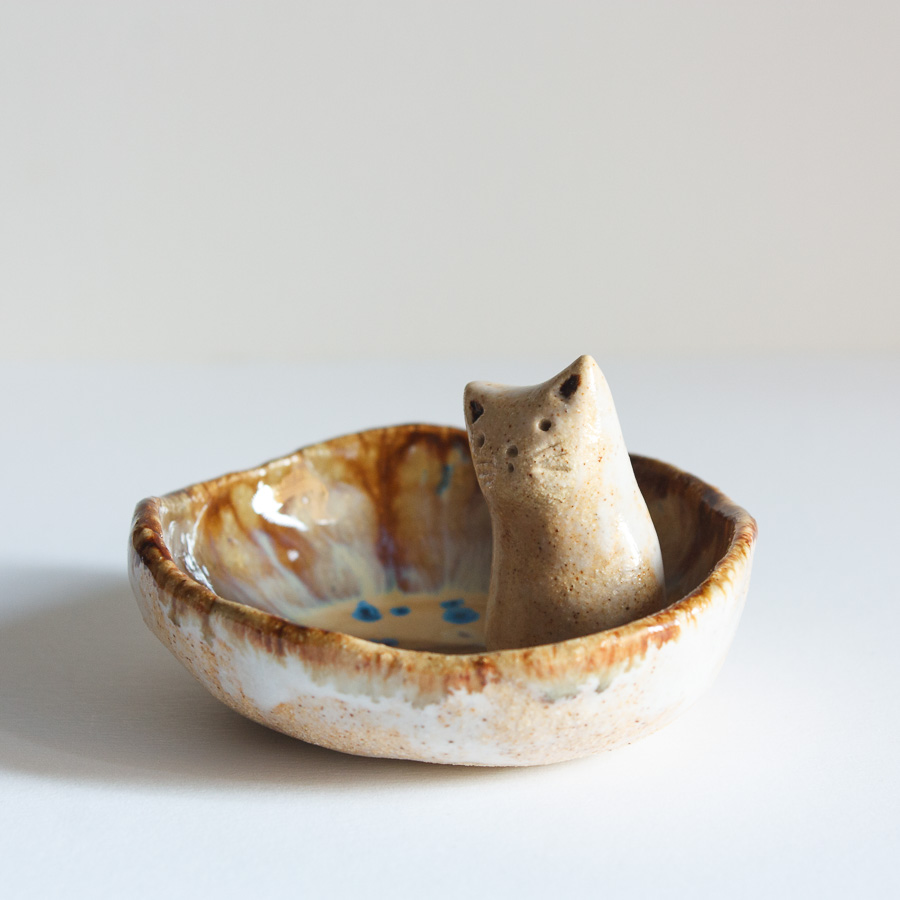 Cuenco con gatito, realizado en gres y decorado con esmaltes de alta temperatura con hermosas cristalizaciones azules. De material resistente, es ideal para colocar joyas (anillos, pendientes, collares) y otros usos que quieras darle.
