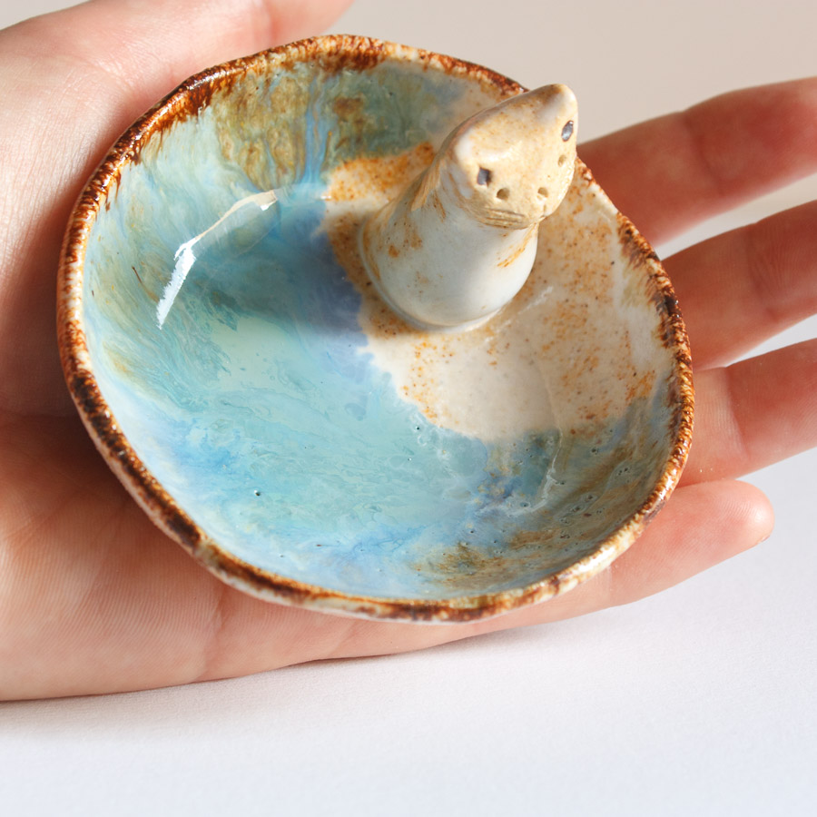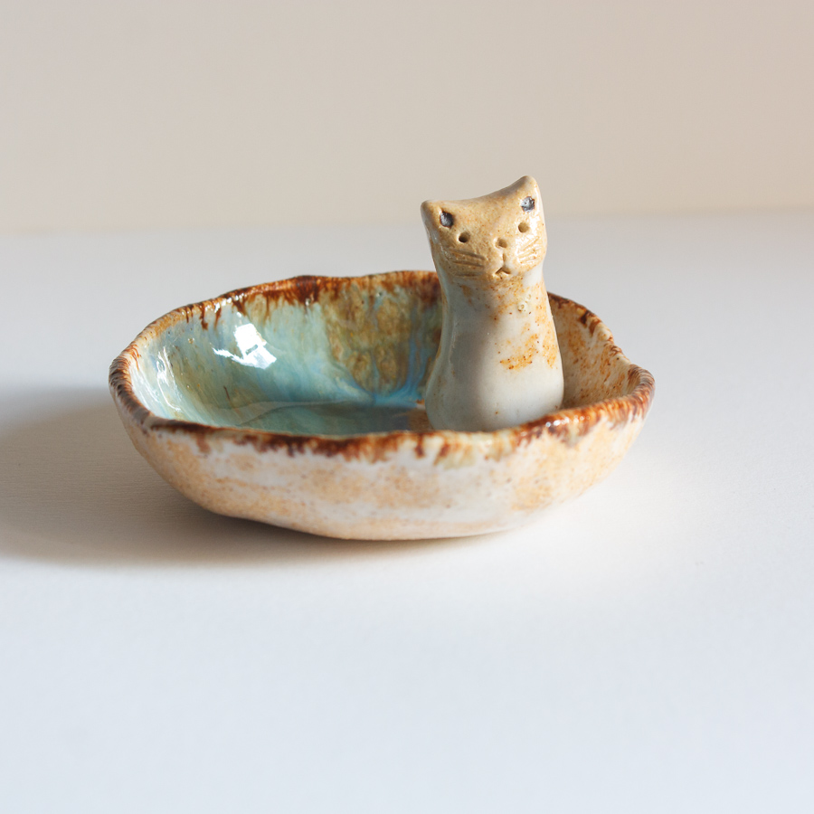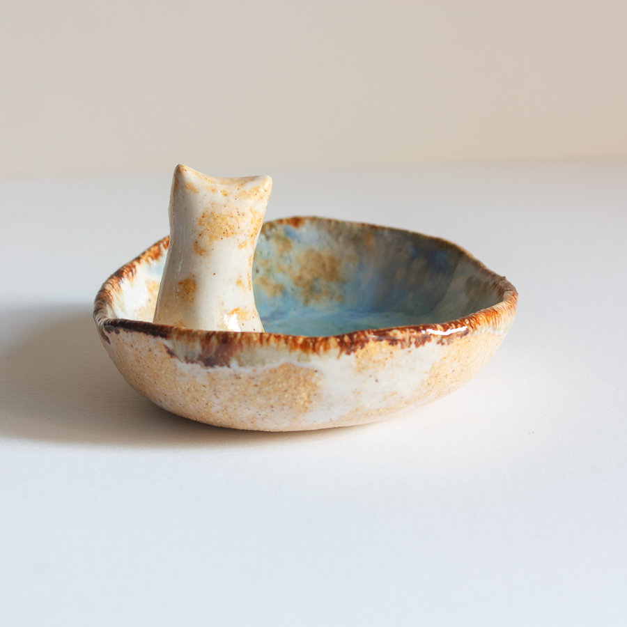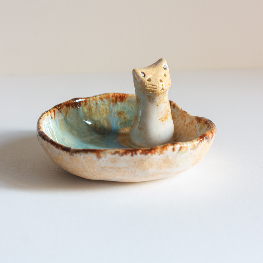 Cuenco con gatito, realizado en gres y decorado con esmaltes de alta temperatura con hermosas cristalizaciones azules. De material resistente, es ideal para colocar joyas (anillos, pendientes, collares) y otros usos que quieras darle.