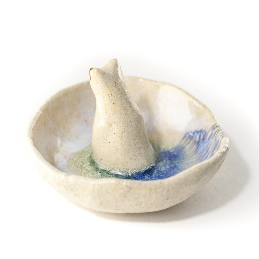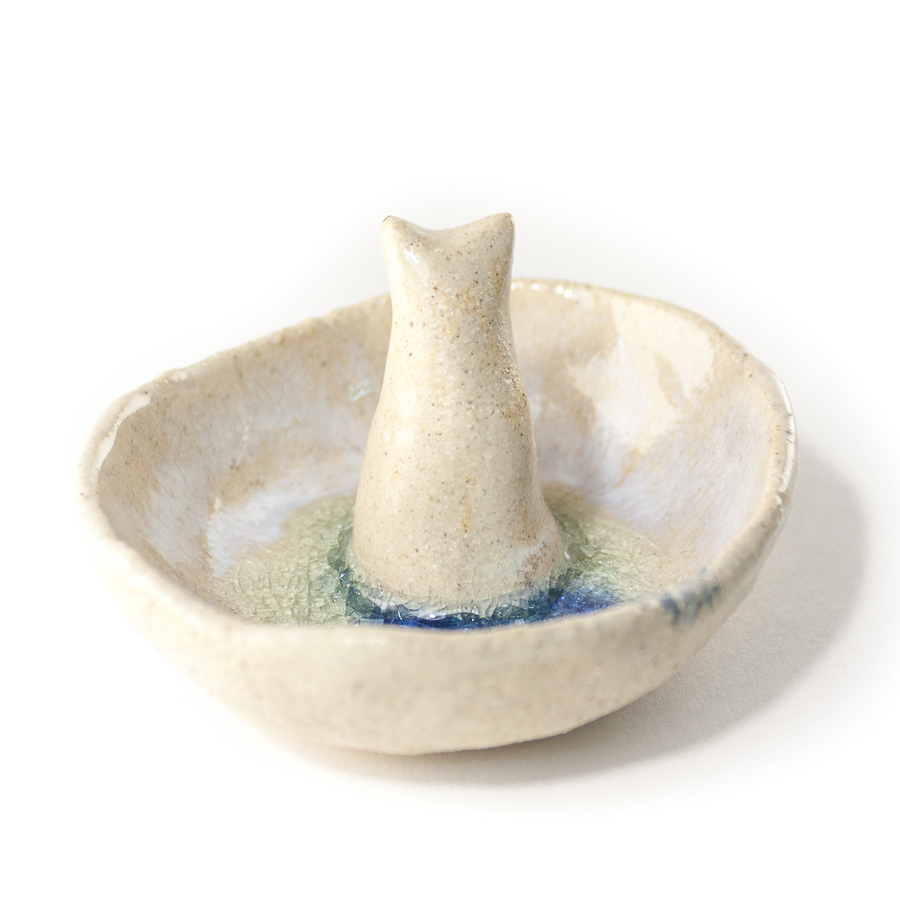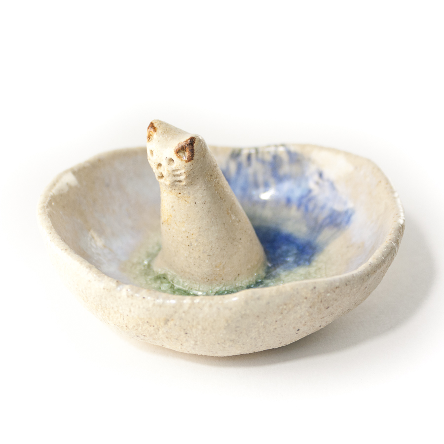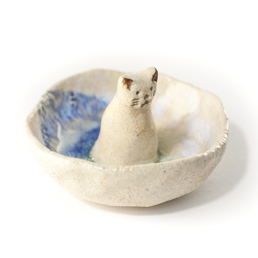 Cuenco con gato sentado. Realizado en gres y decorado con esmaltes de alta temperatura en tonos beige y azul. Lleva cristal fundido verde claro.