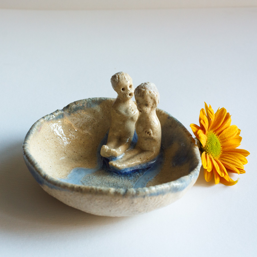 Cuenco hermanos realizado a mano y pintado con esmaltes de alta temperatura. El interior está esmaltado y lleva cristal fundido.