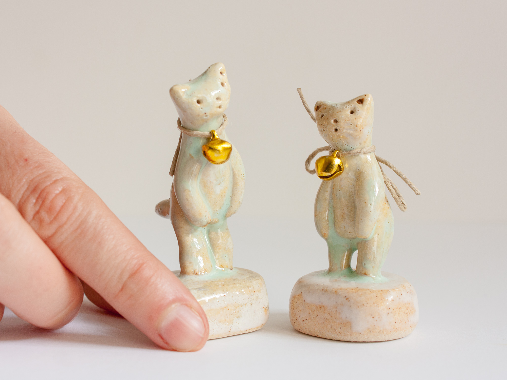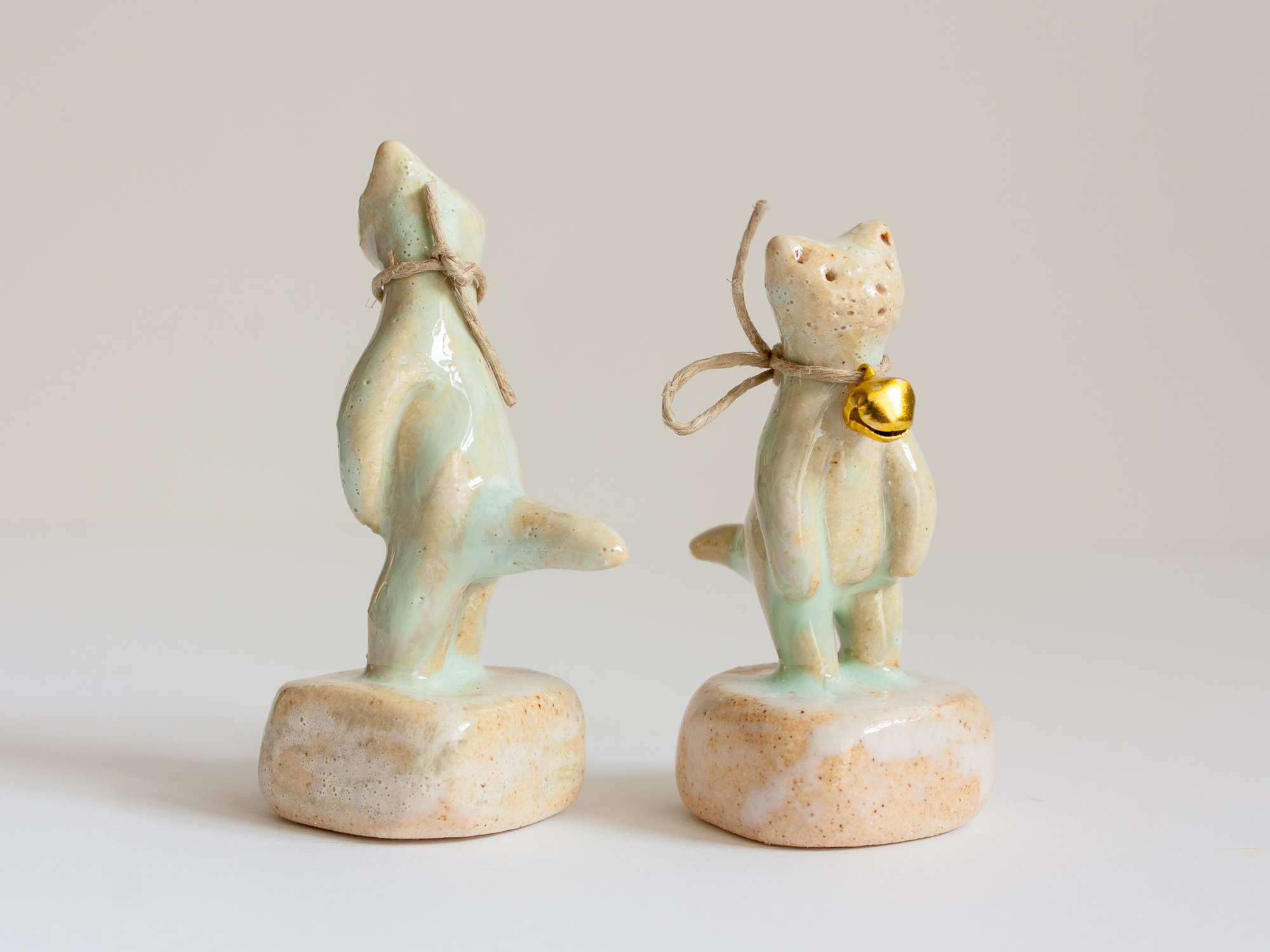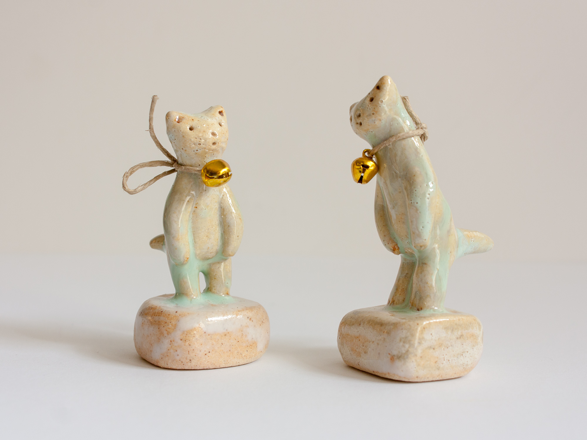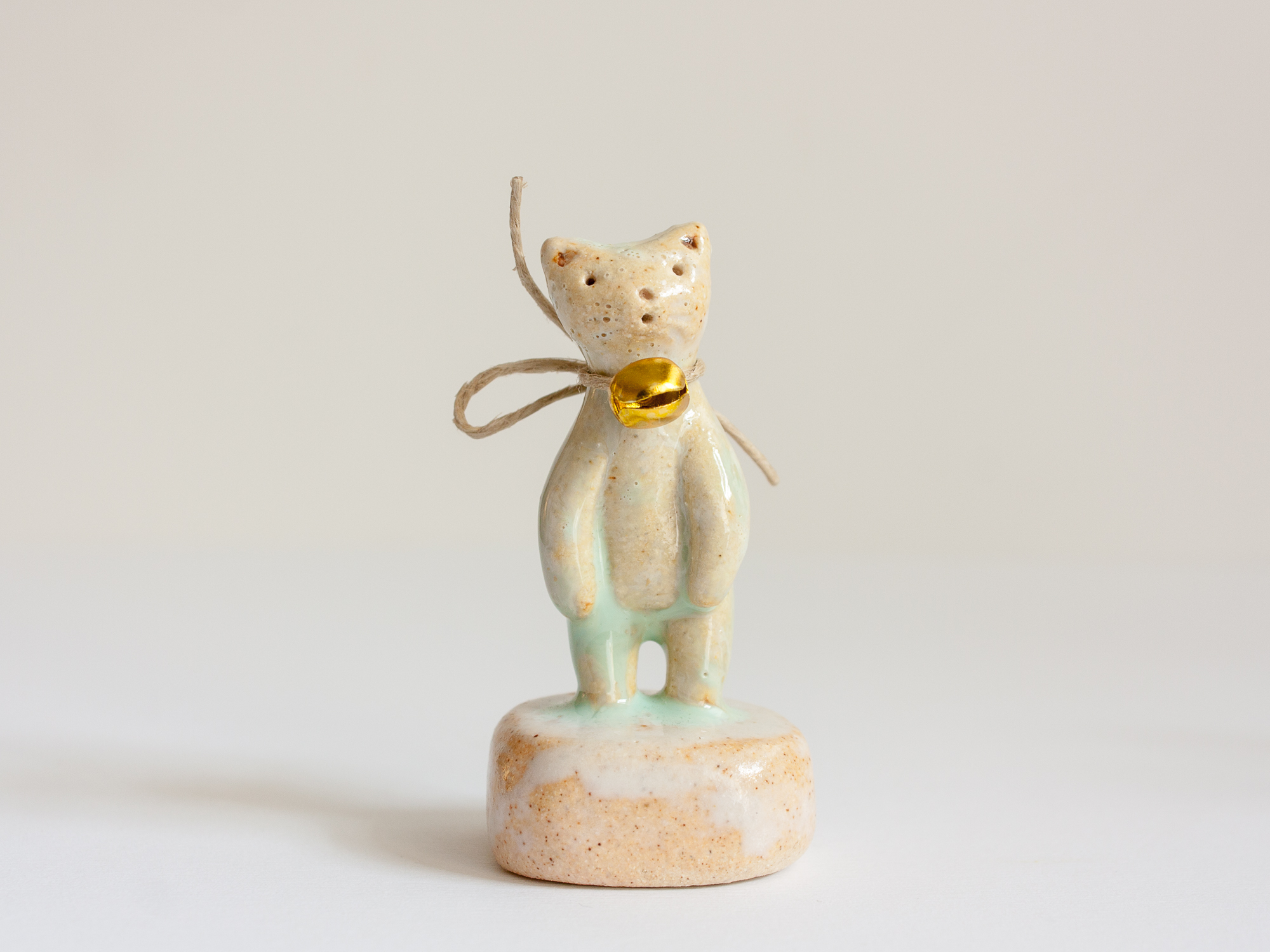 Miniatura de gato con cascabel de metal dorado trenzado con cuerda arpillera (se puede quitar o cambiar la cuerda otro cordón o lazada). La peana está modelada a mano también y es parte de la pieza.