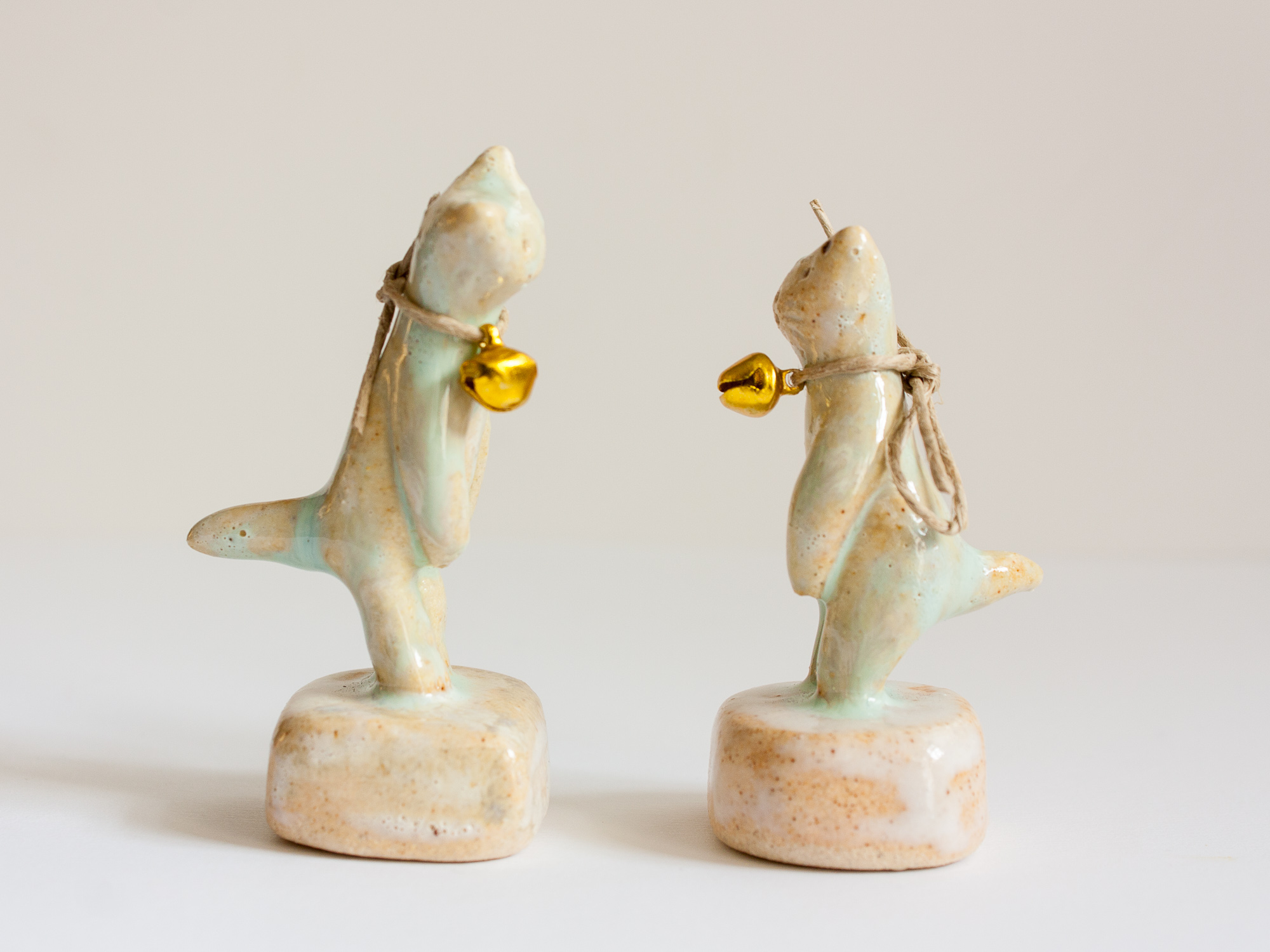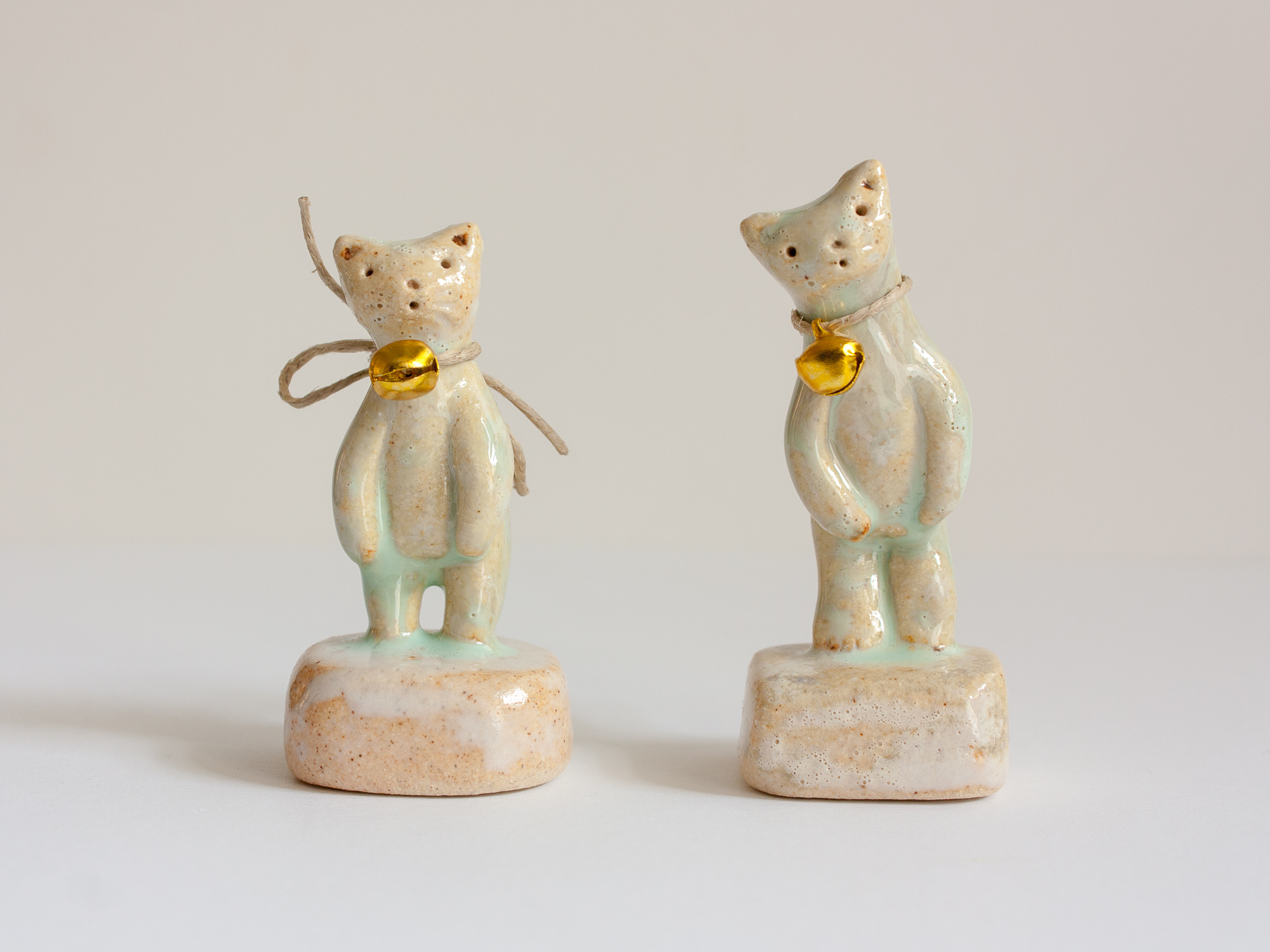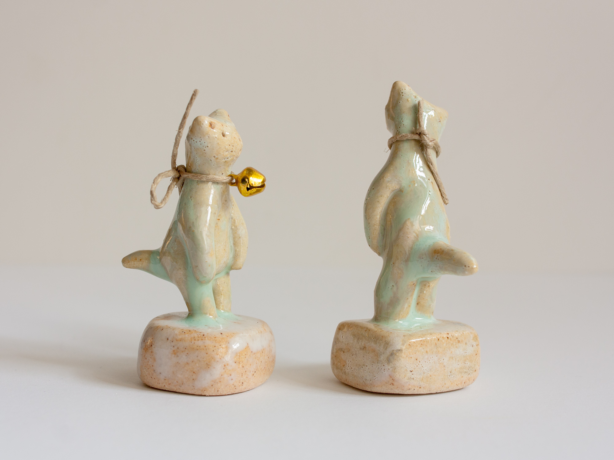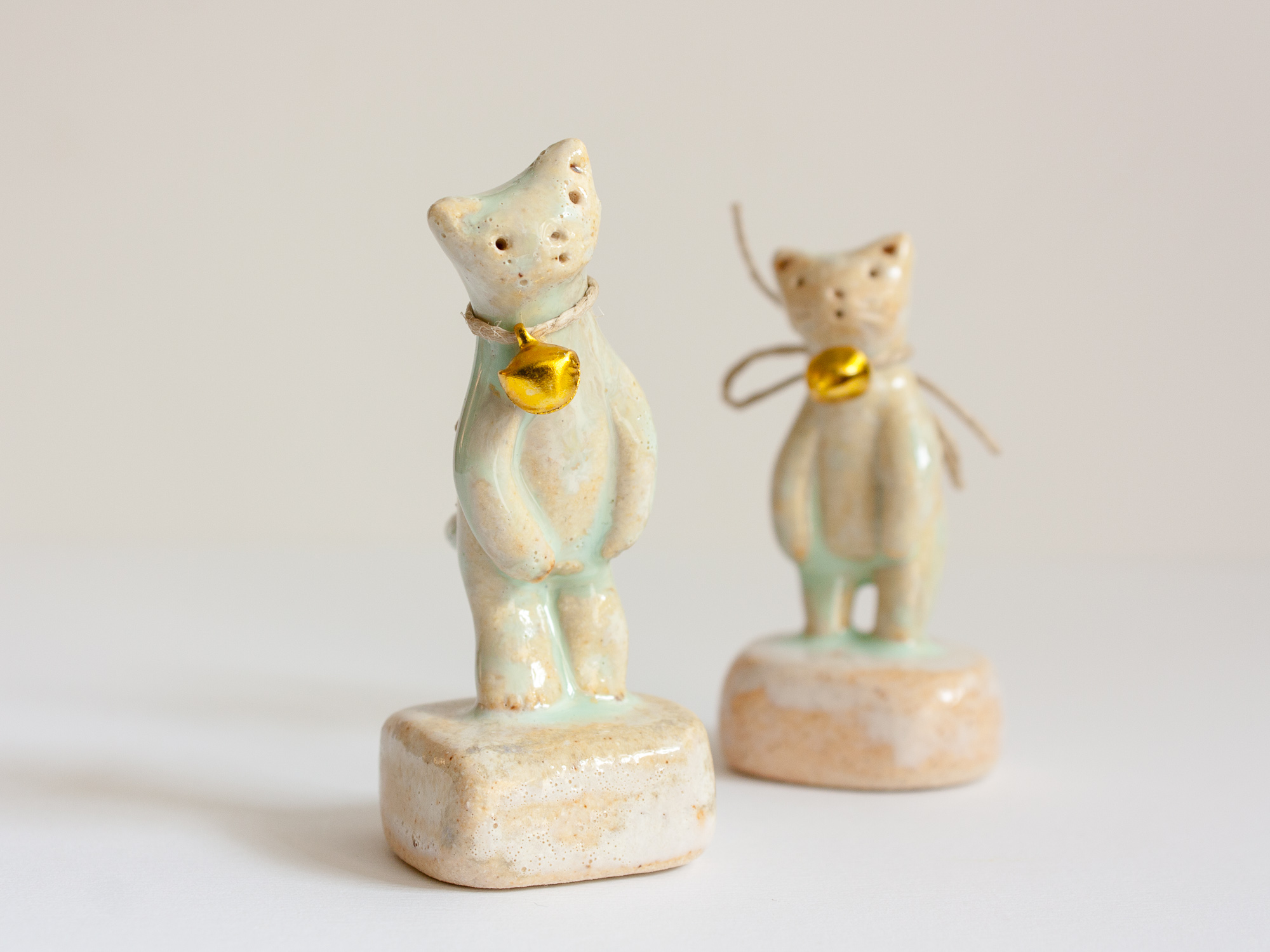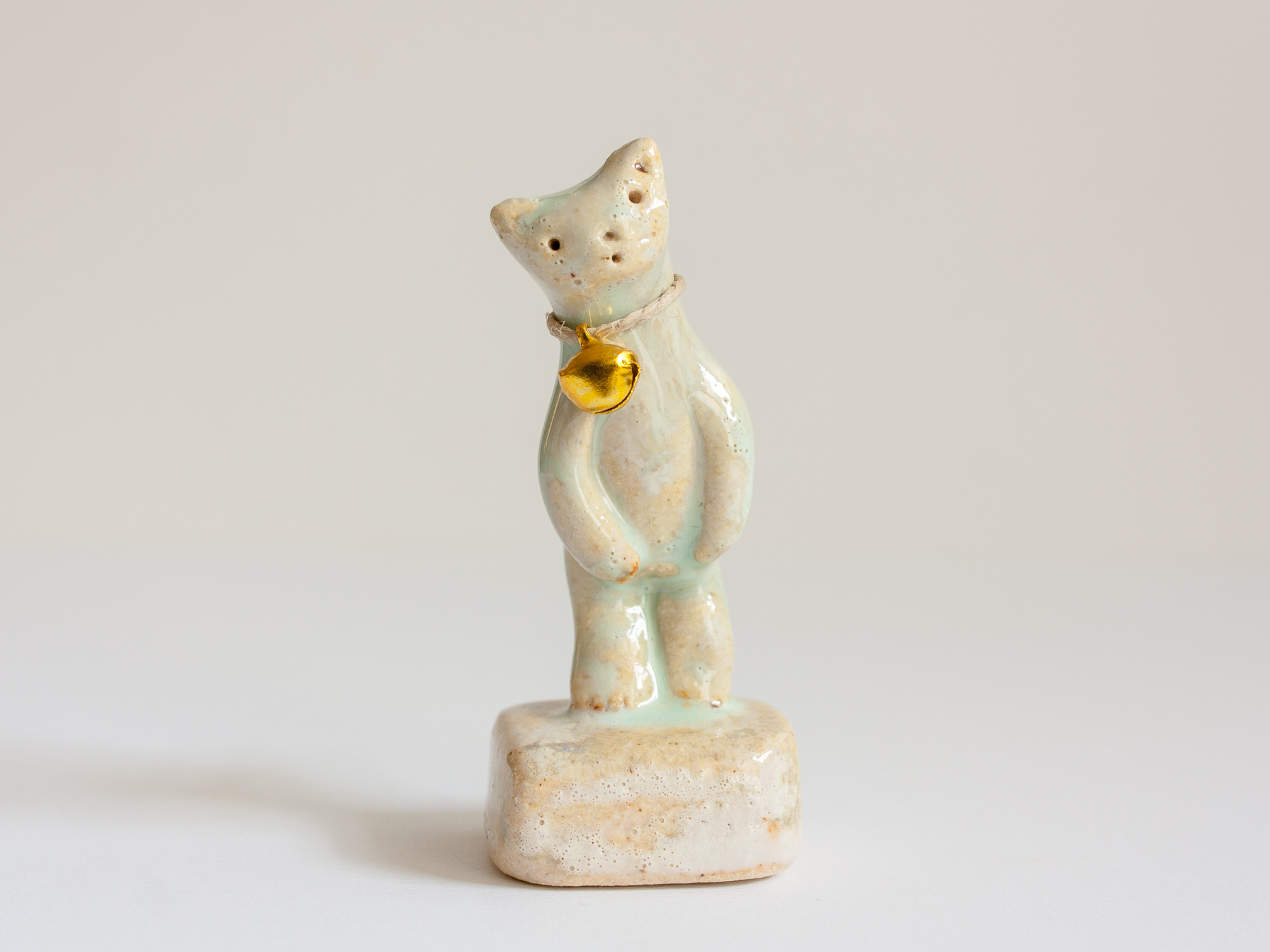 Miniatura de gato con cascabel de metal dorado trenzado con cuerda arpillera (se puede quitar o cambiar la cuerda otro cordón o lazada). La peana está modelada a mano también y es parte de la pieza.