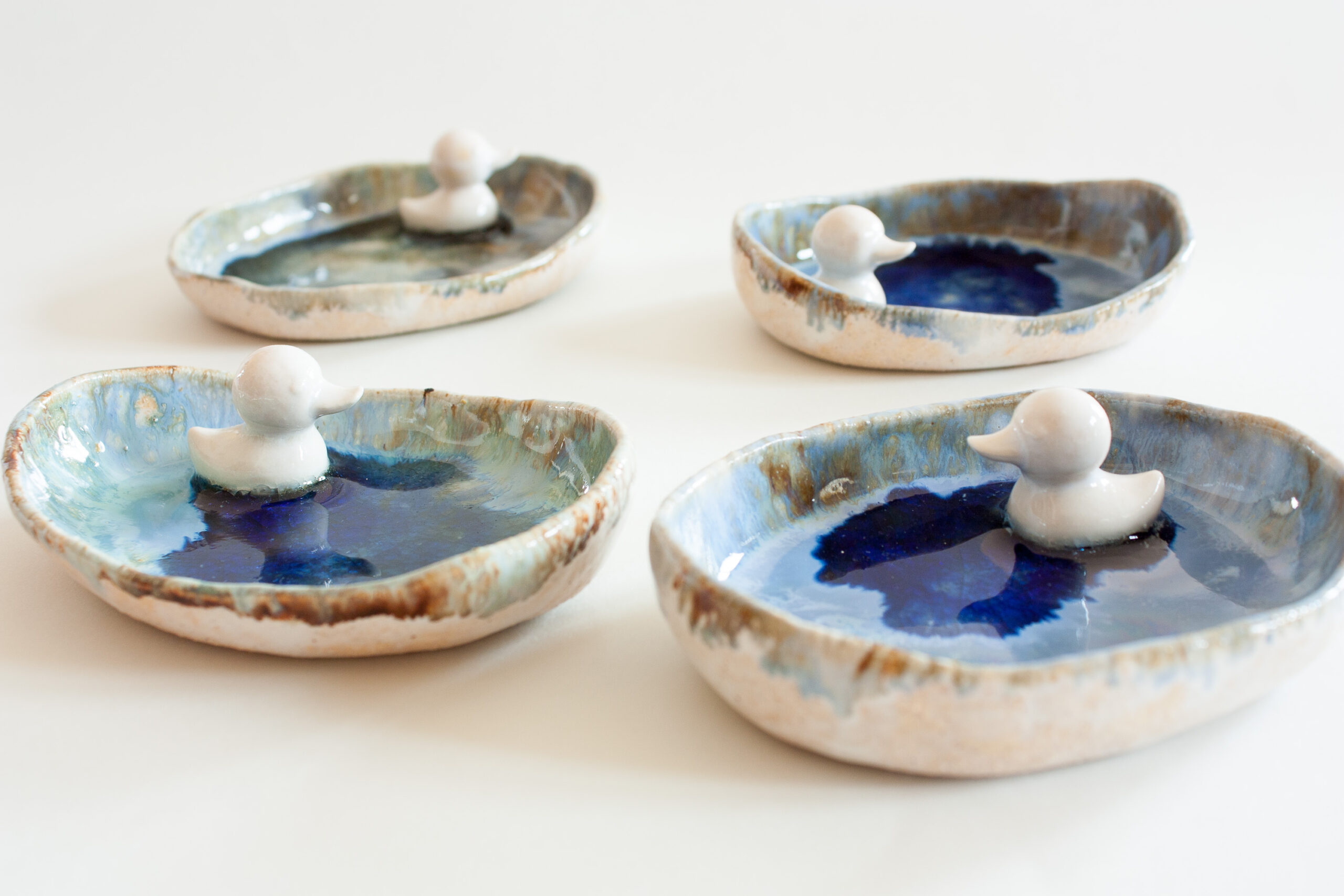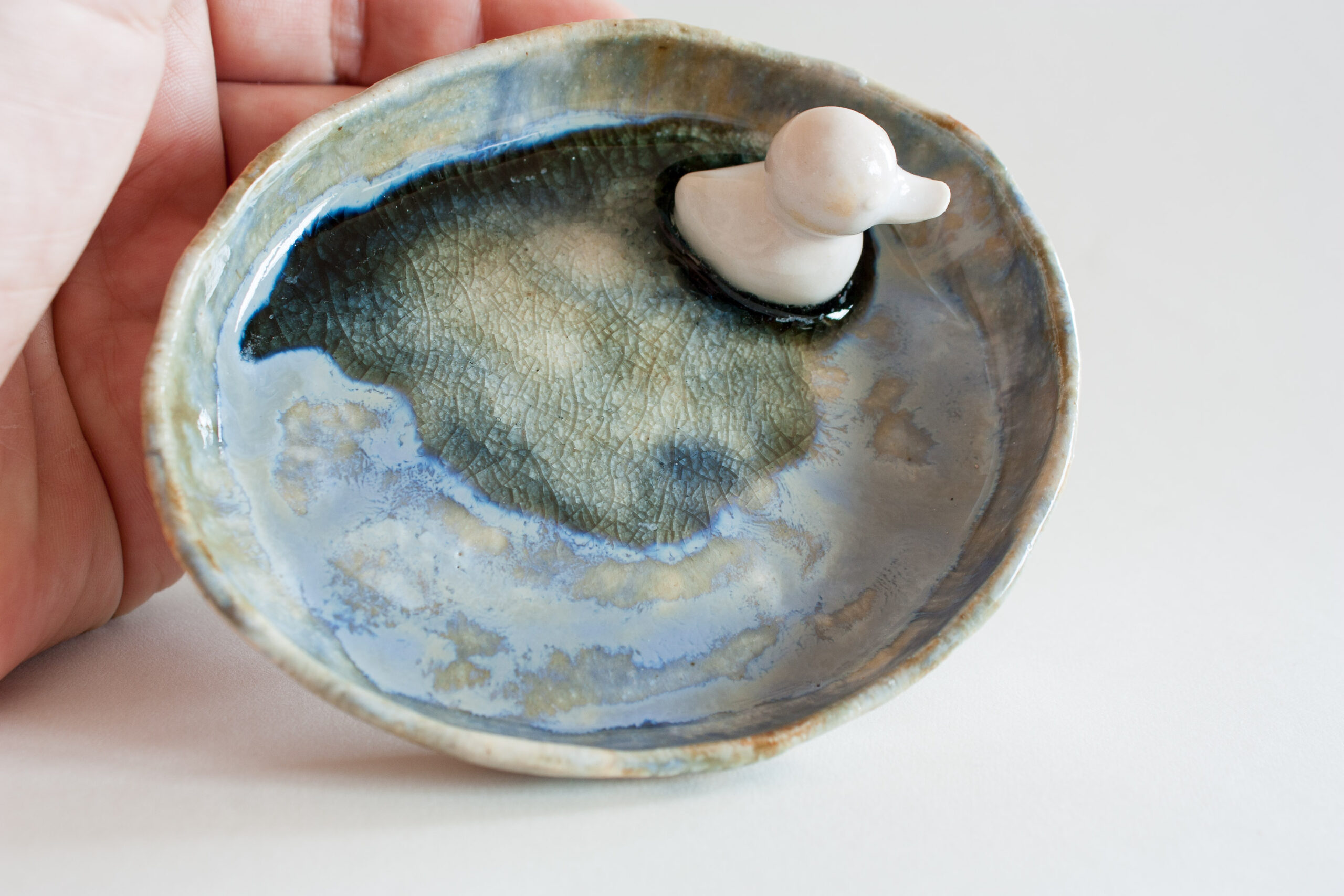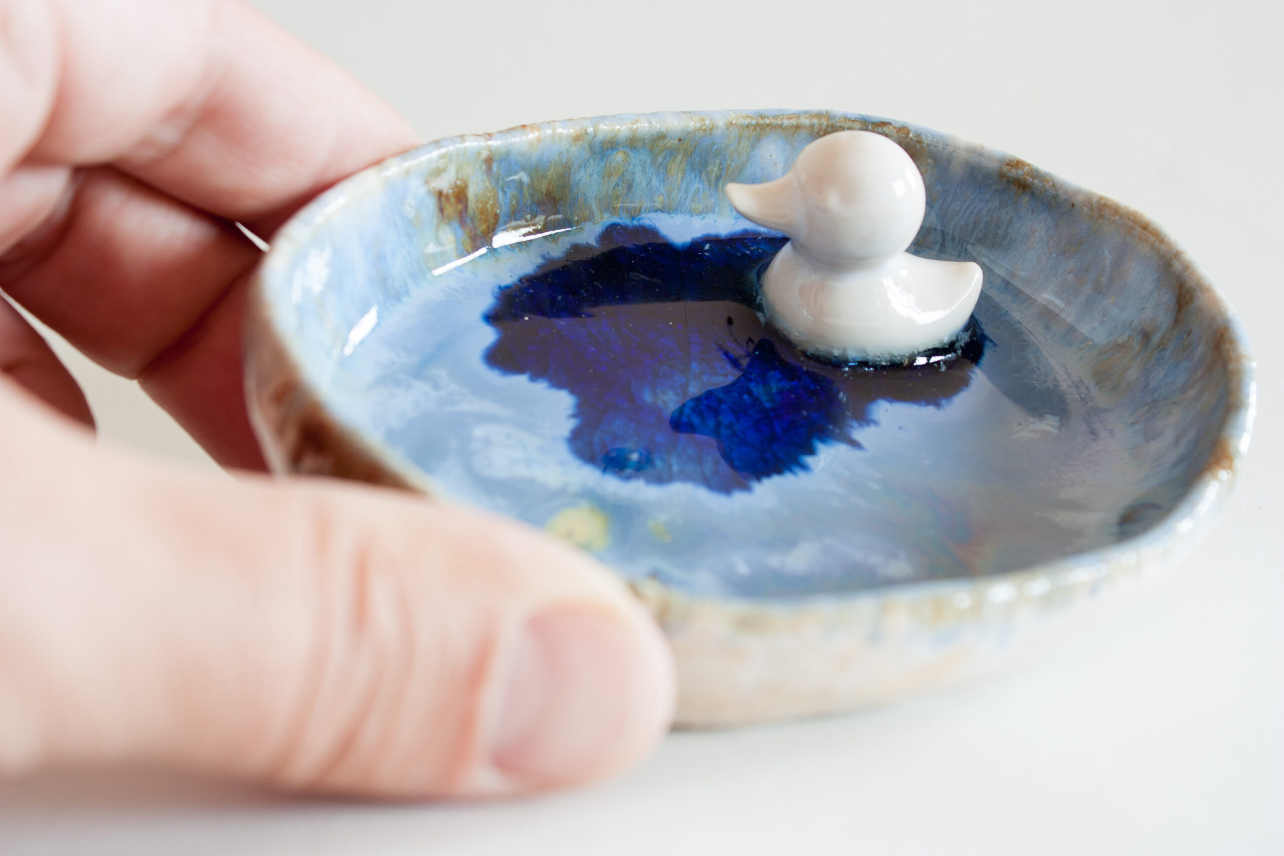 Este pequeño plato o jabonera con patito de goma realizado en cerámica le ayudará a mantener sus joyas en orden y al mismo tiempo decorará cualquier parte de la casa.