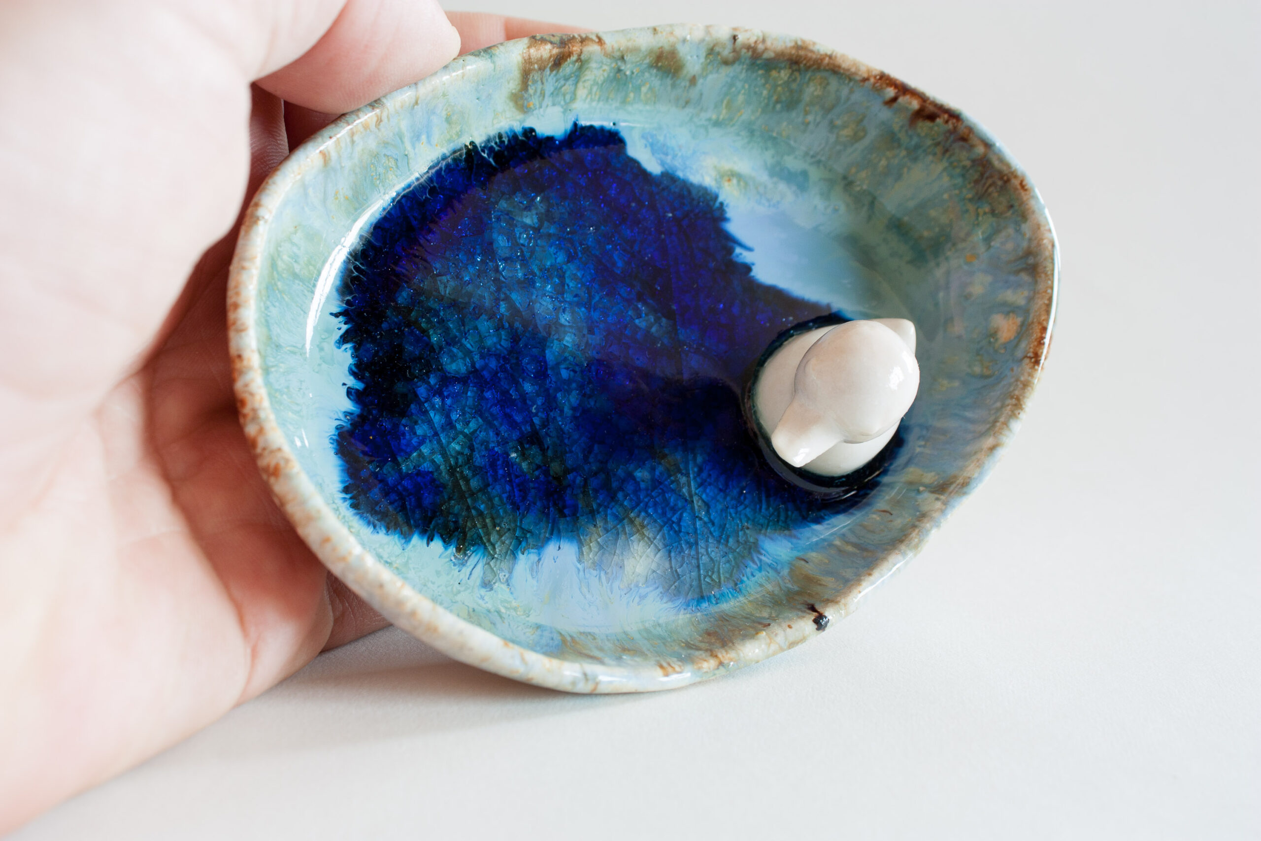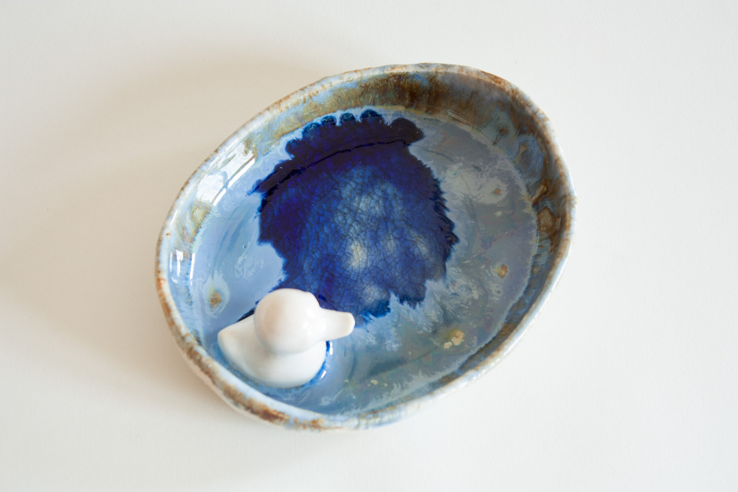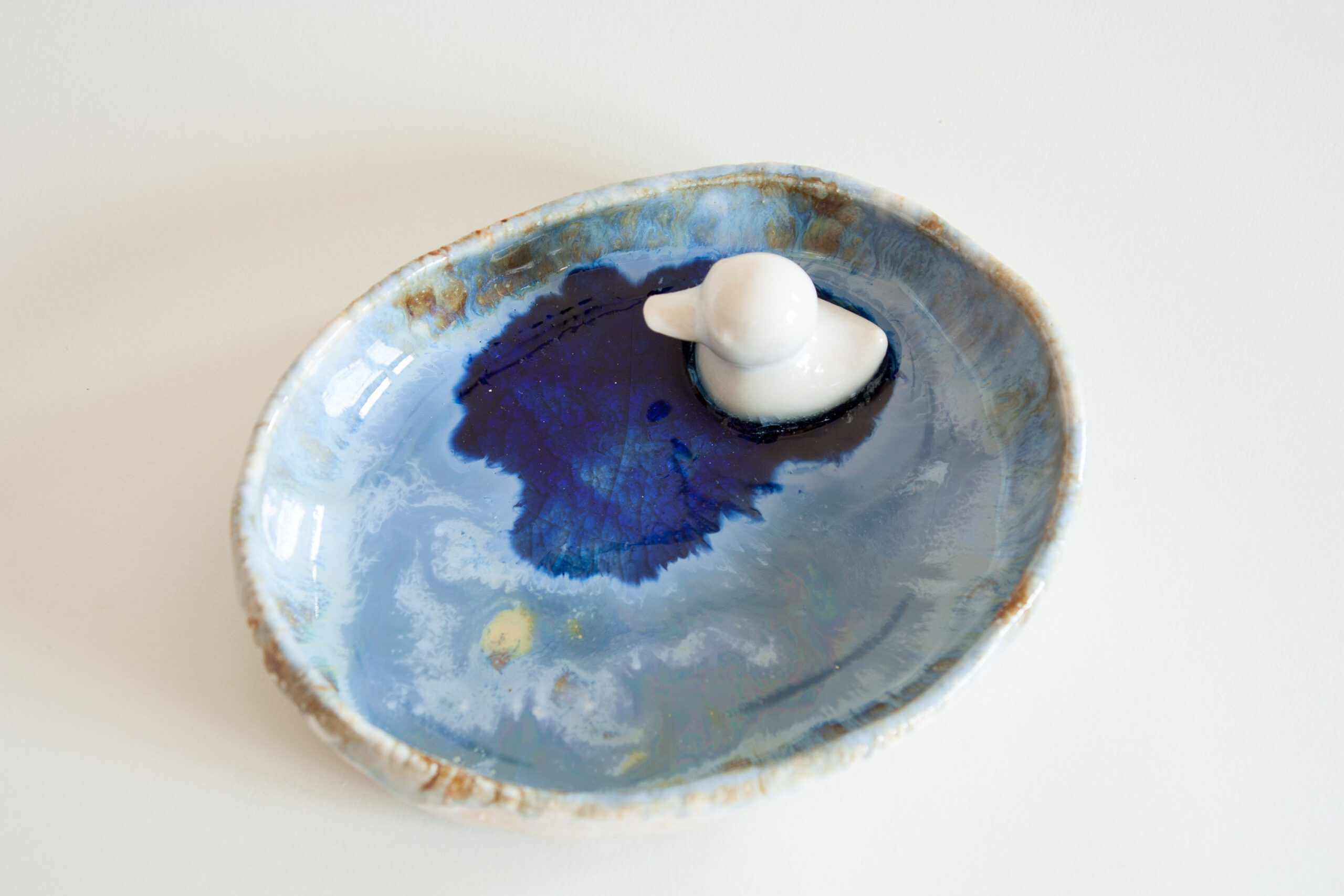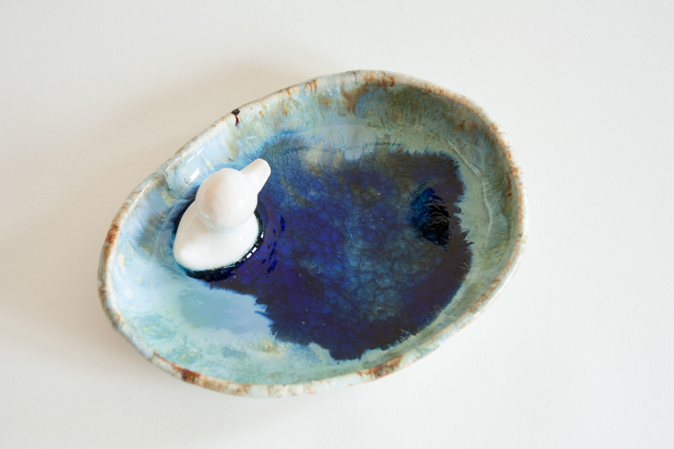 Fabricado en gres y decorado con esmaltes y vidriados en tonos azules, verdes y beis, de gran resistencia. En su interior junto con el esmaltado de la pieza, el efecto del cristal fundido craquelado recuerda a un pequeño estanque por donde el pato está nadando. Es una superficie suave al tacto y no hay ningún peligro de cortarse con el cristal. La pieza se cuece a 1240 ºC en nuestro horno cerámico.