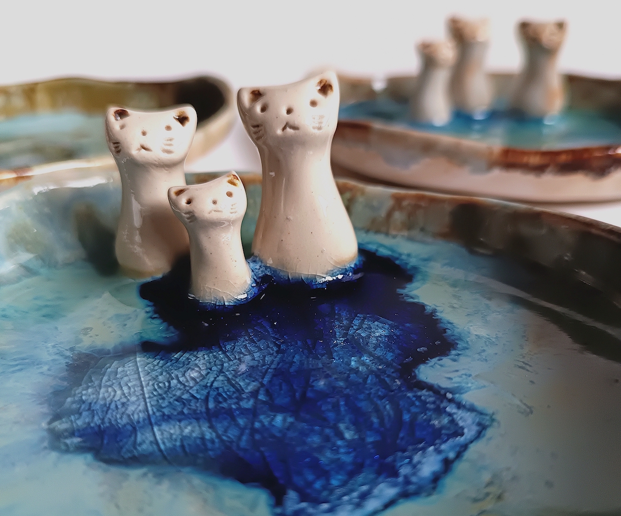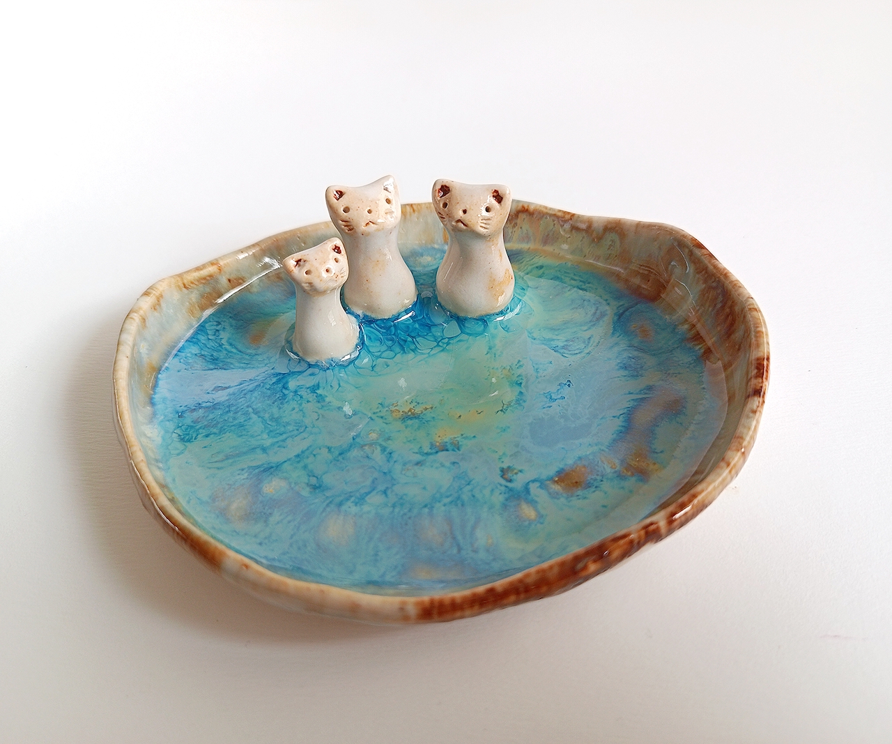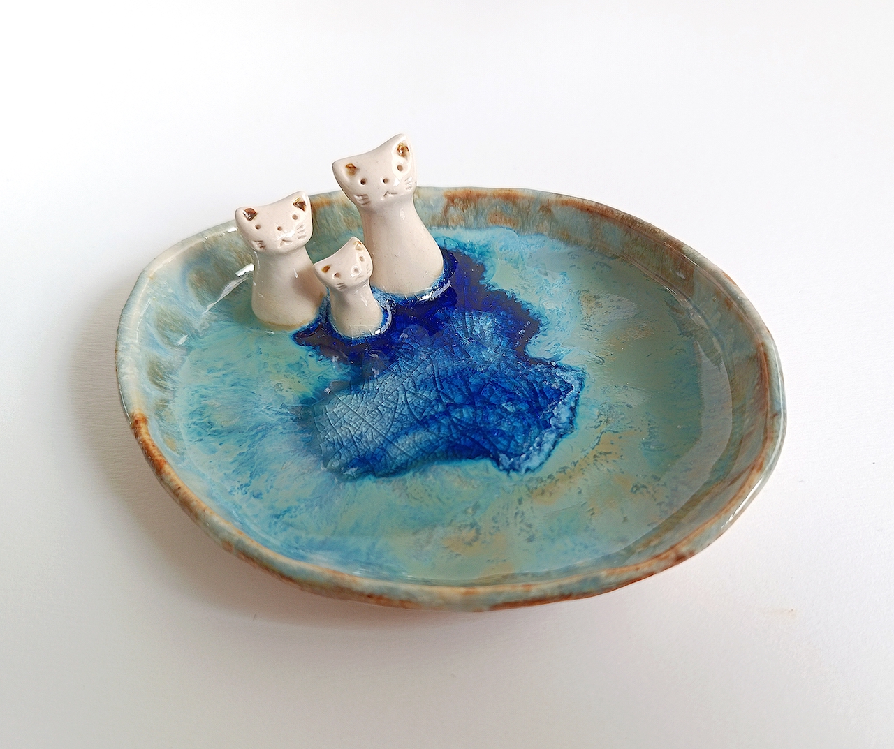 Este pequeño plato o cuenco con pareja de gatos con un pequeño gatito les ayudará a mantener sus joyas en orden y al mismo tiempo decorará cualquier parte de la casa.