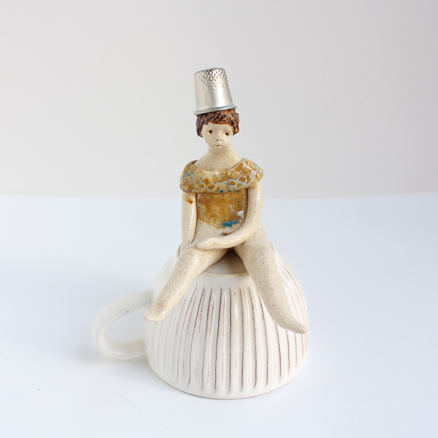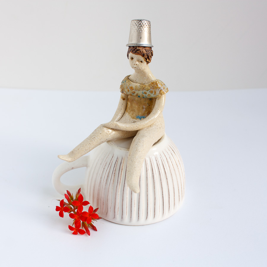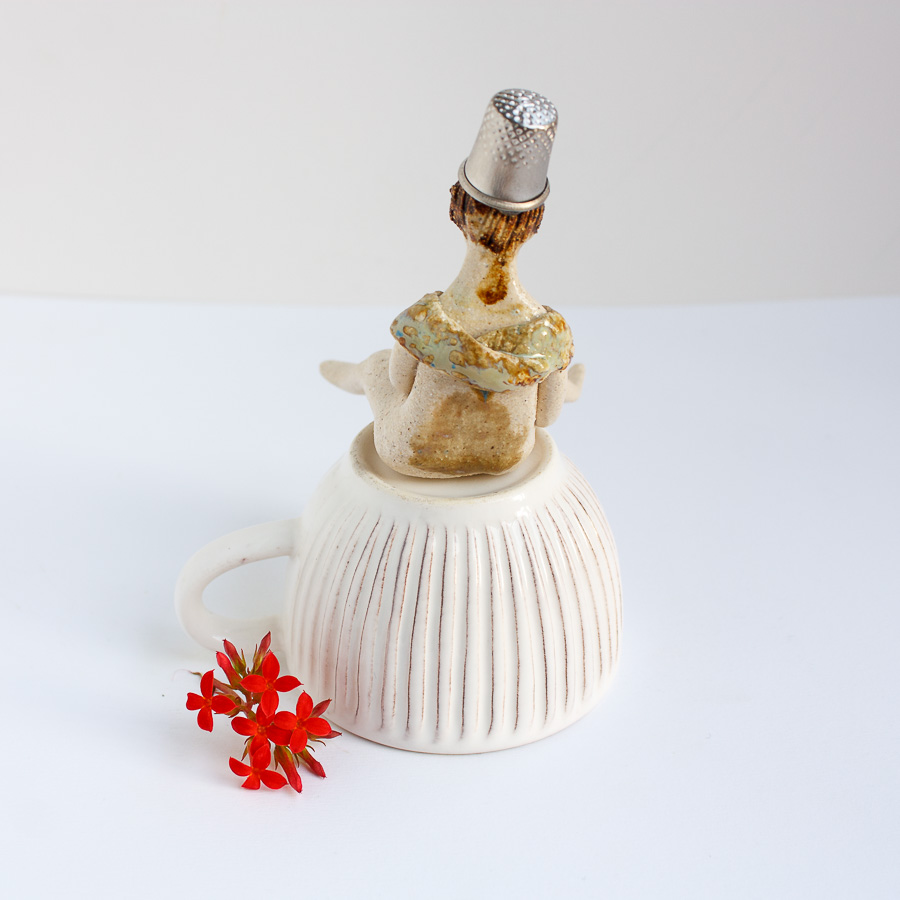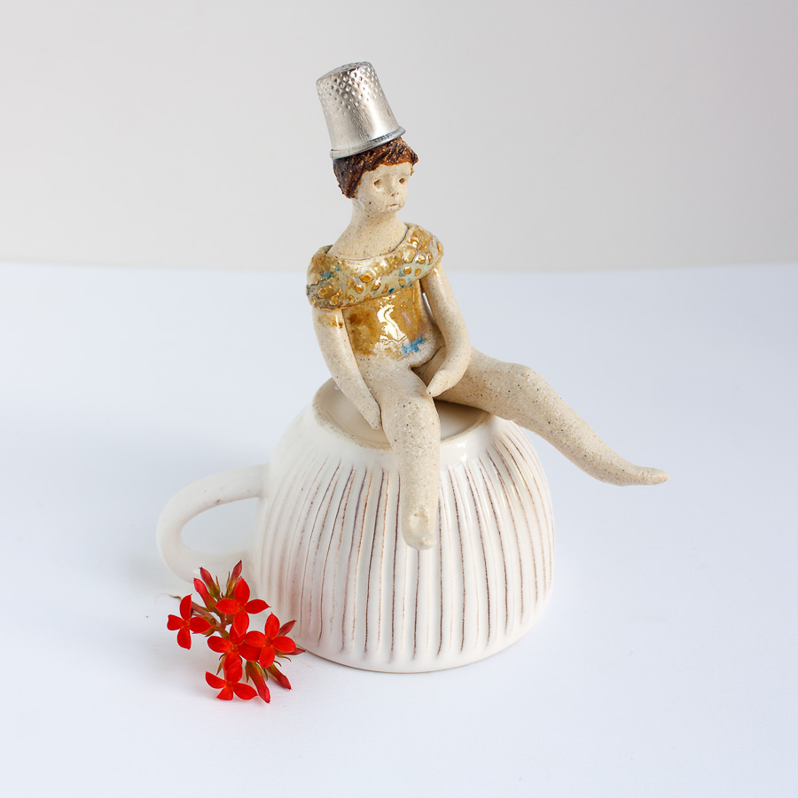 La niña del dedal es una figura modelada a mano en gres y pintada con esmaltes de alta temperatura. Decora tu espacio con esta bonita figura colocándola sobre el borde de una balda de estantería, un libro o cualquier soporte. En las fotografías de estudio puedes verla sobre una taza.