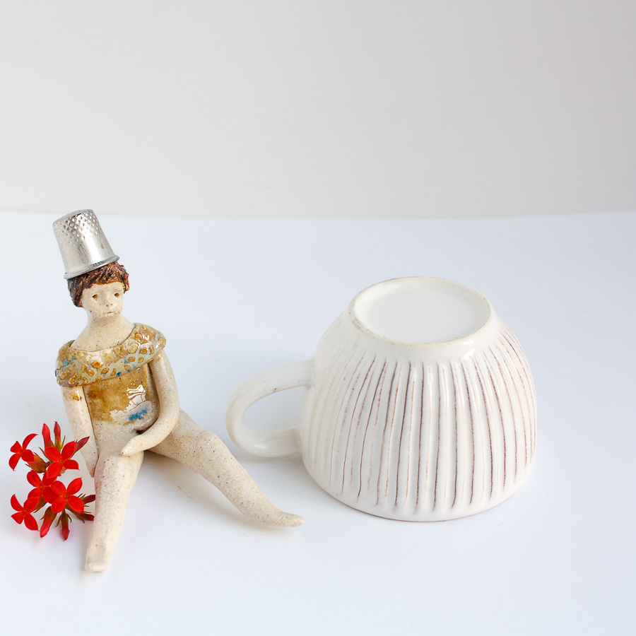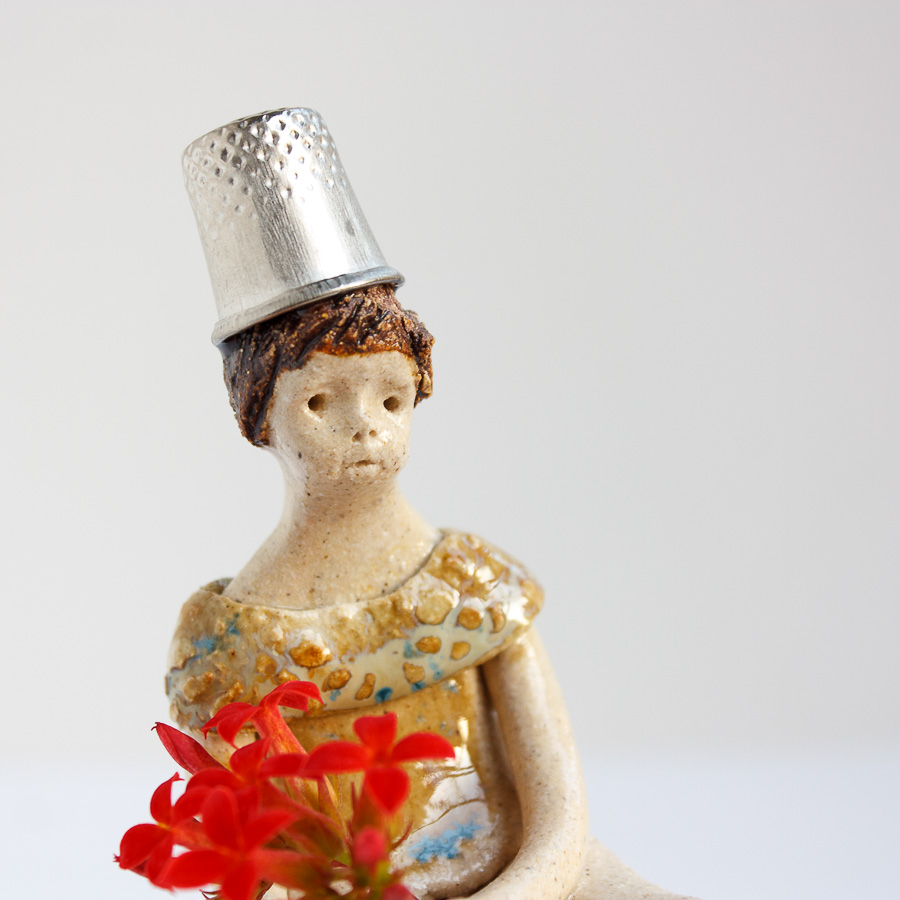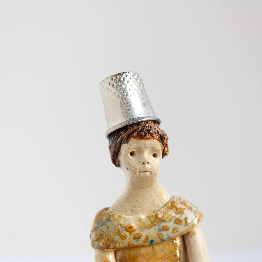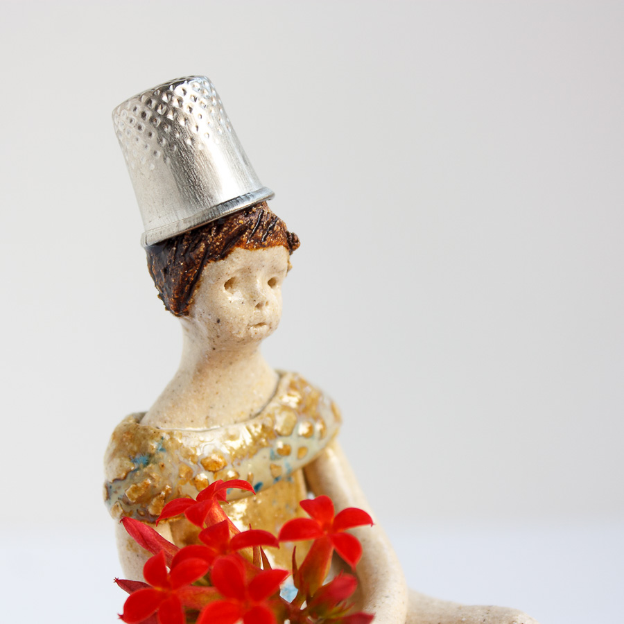 La niña del dedal es una figura modelada a mano en gres y pintada con esmaltes de alta temperatura. Decora tu espacio con esta bonita figura colocándola sobre el borde de una balda de estantería, un libro o cualquier soporte. En las fotografías de estudio puedes verla sobre una taza.