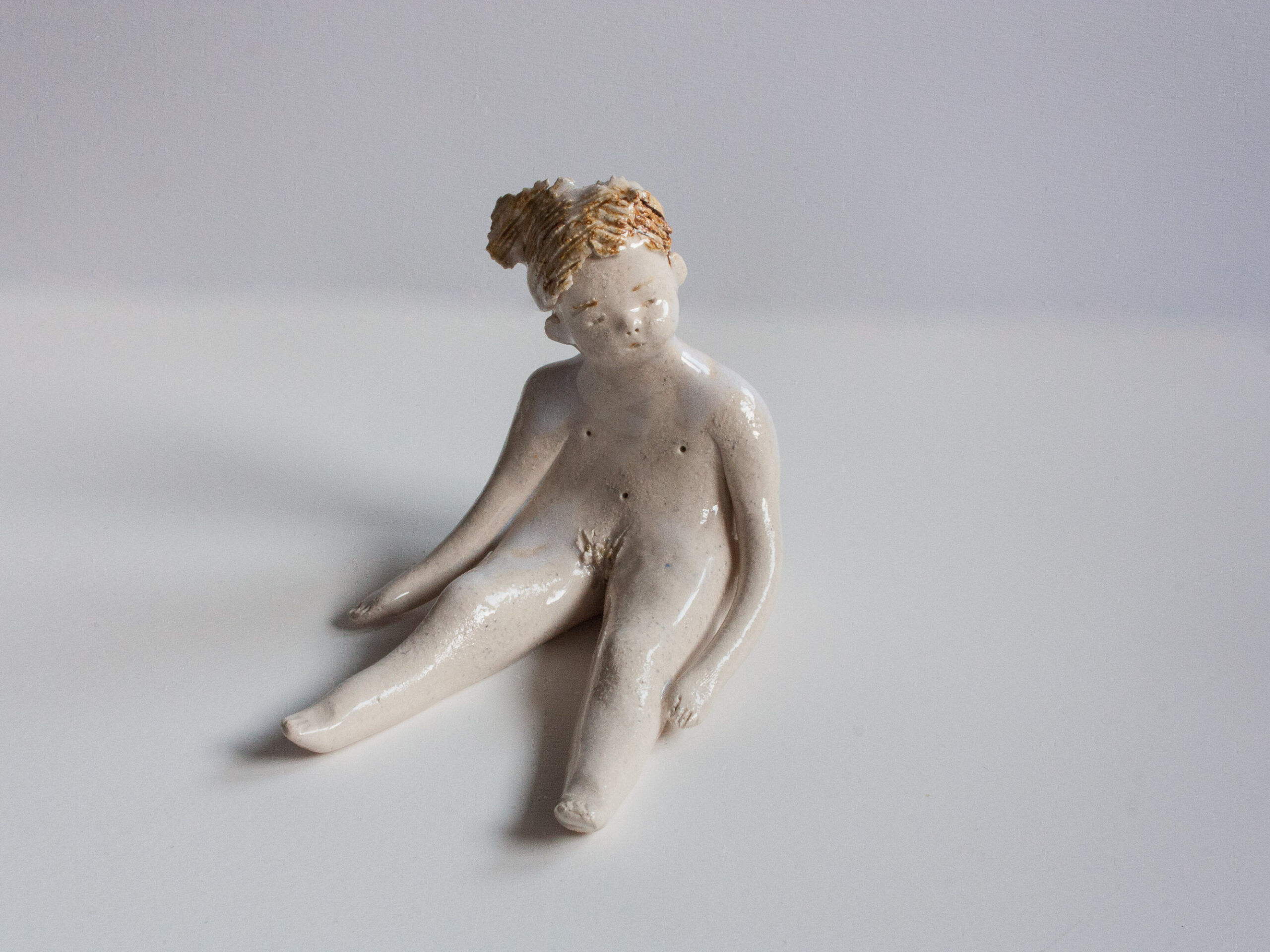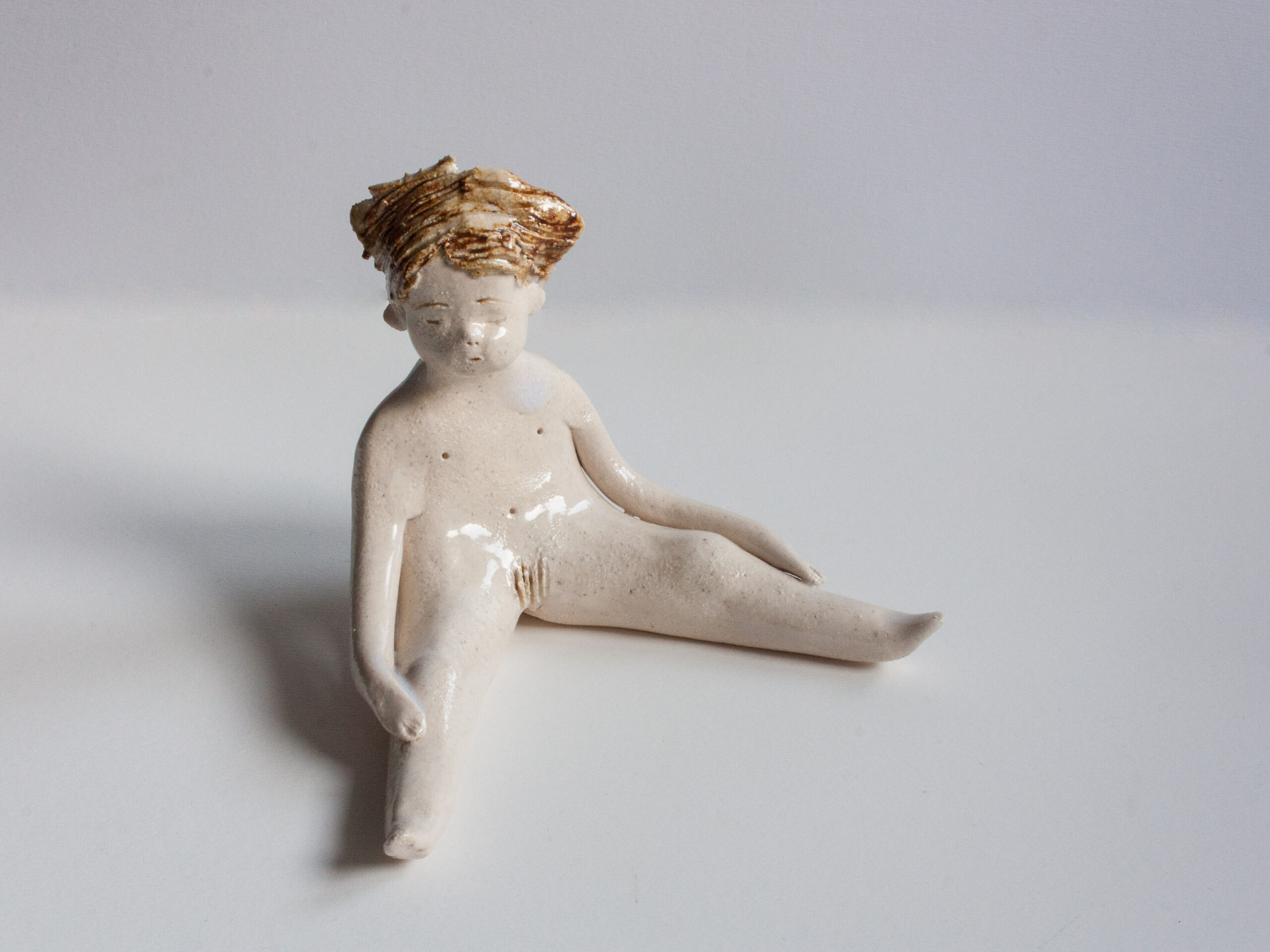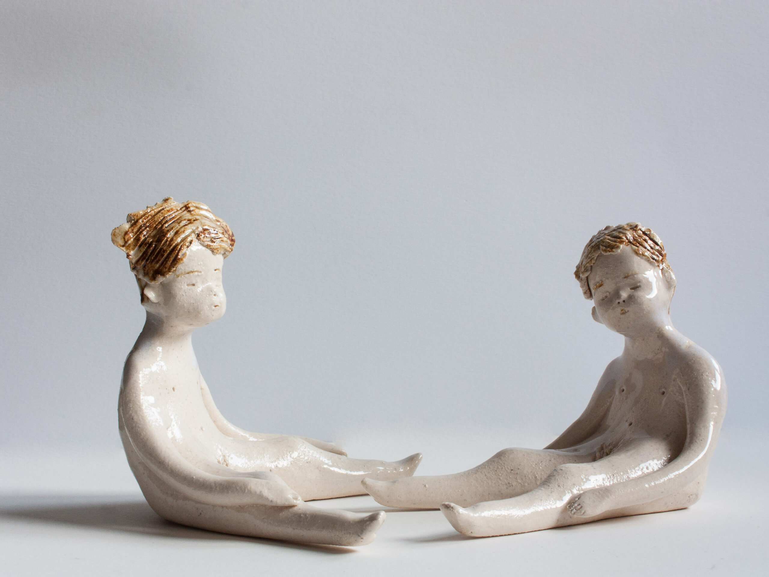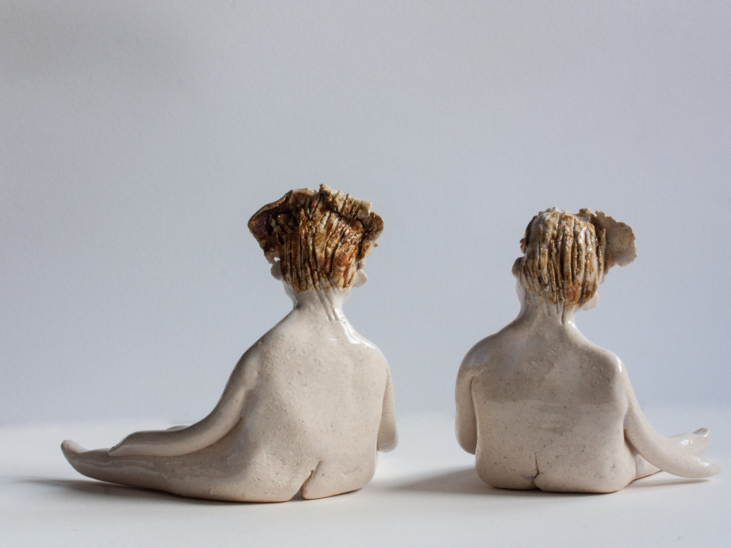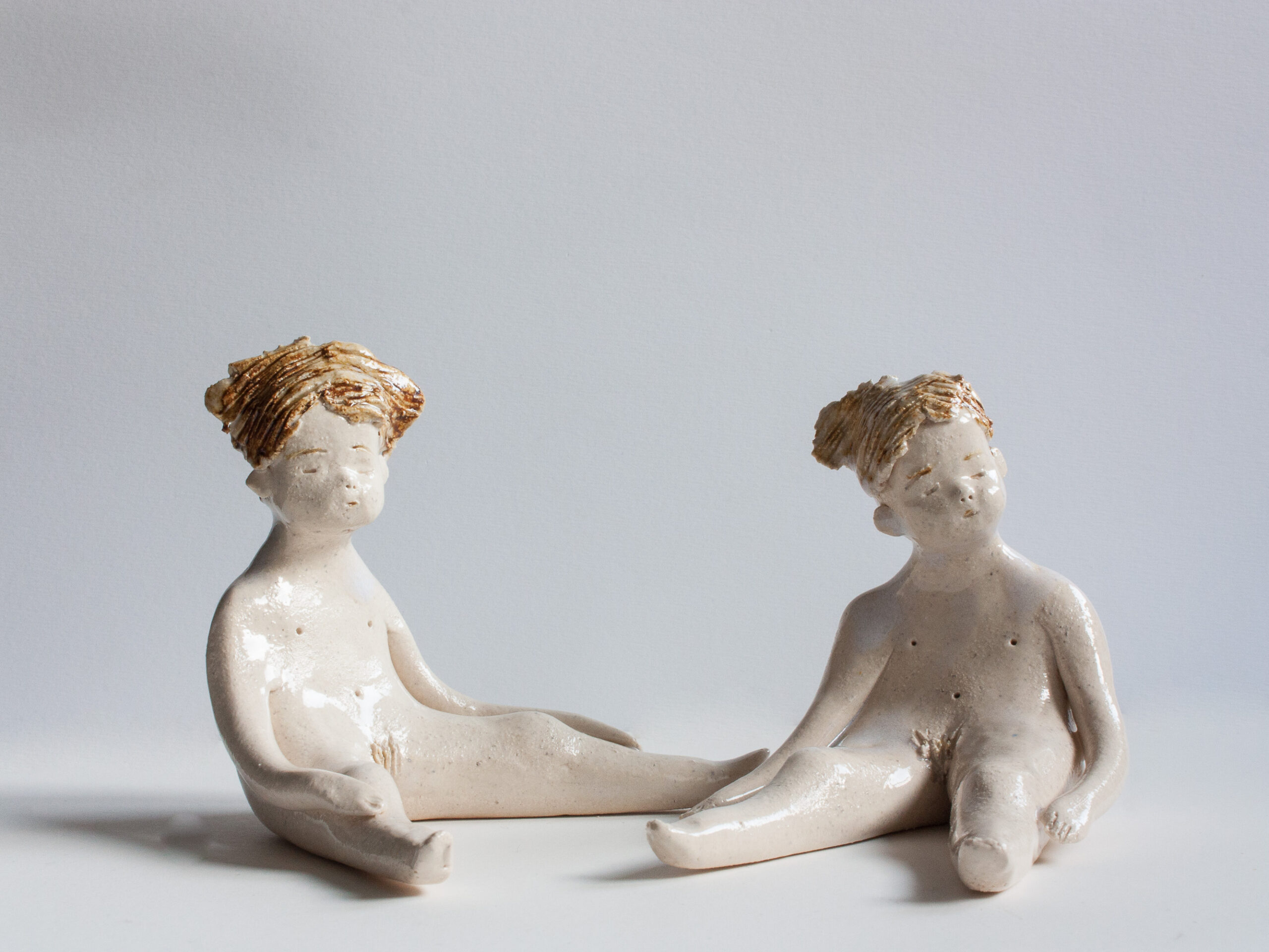 Estas dos preciosas niñas fueron modeladas a mano en cerámica gres y pintadas con esmaltes de alta temperatura de base transparente brillante y oxido de hierro rojo para el pelo. Figuras decorativas que puedes colocar sentadas sobre unos libros, una mesa o cualquier soporte que elijas.