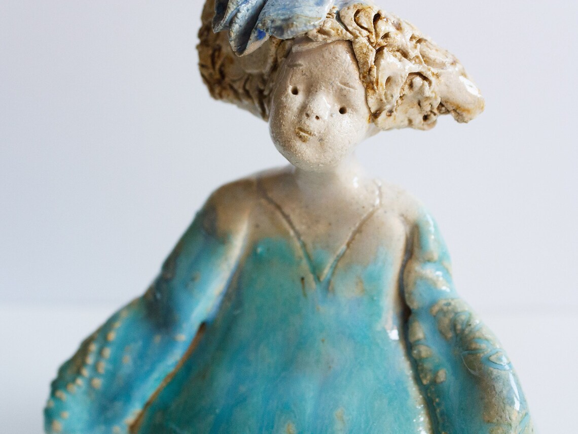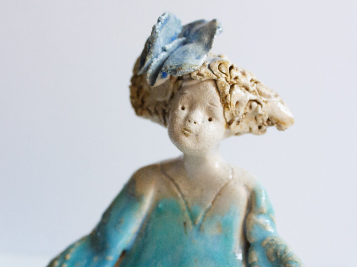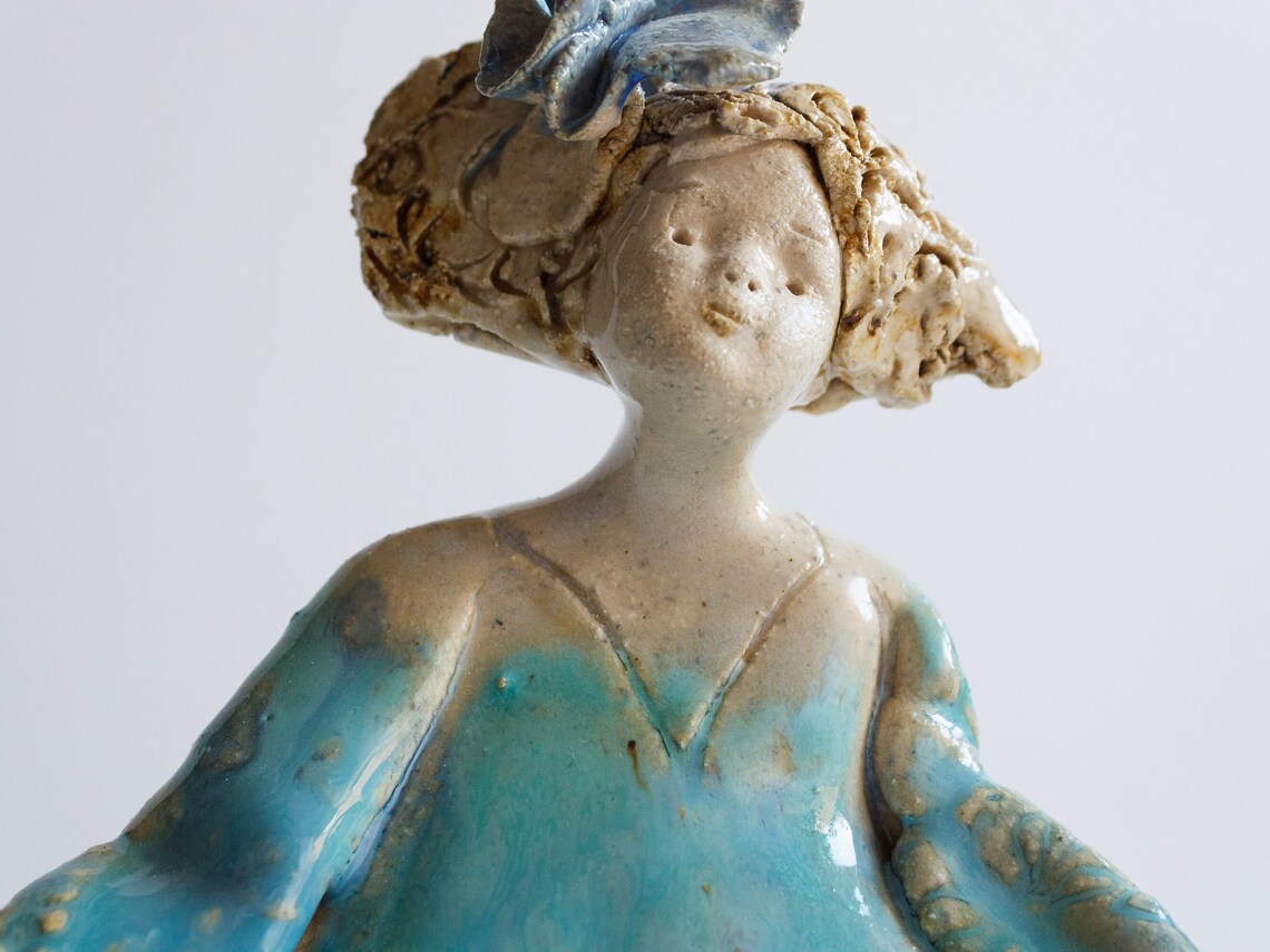 Decorada a pincel con esmaltes de coloraciones turquesas, azul para la flor y óxidos de hierro para el pelo. El color beis característico del gres se puede ver en la cara y otras zonas menos cubiertas por la pincelada de color, quedando esas zonas cubiertas con un esmalte transparente. Es una pieza especial, hermosa y escultórica que llenará el espacio que decore.