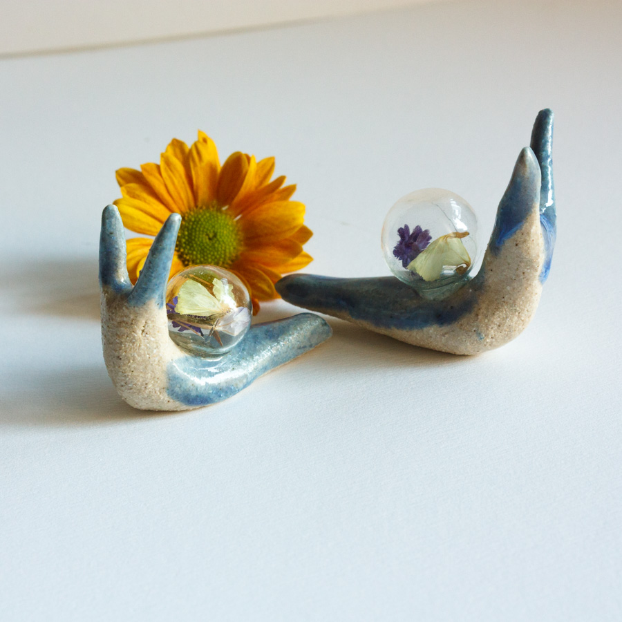 Caracol con concha espiral de cristal transparente y flores secas en su interior. Modelados a mano en gres y pintados con esmaltes de alta temperatura.