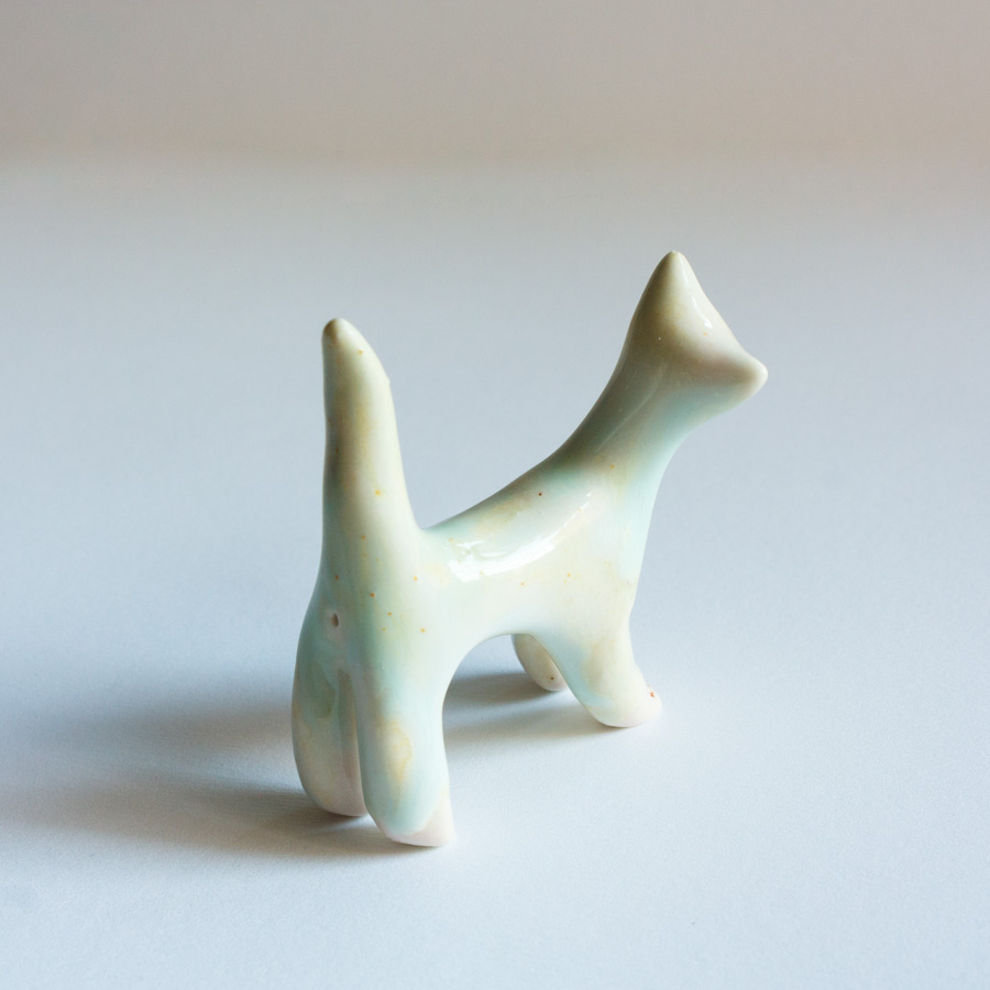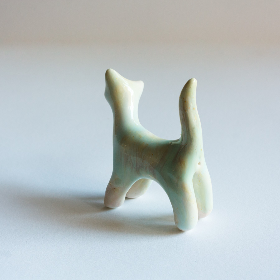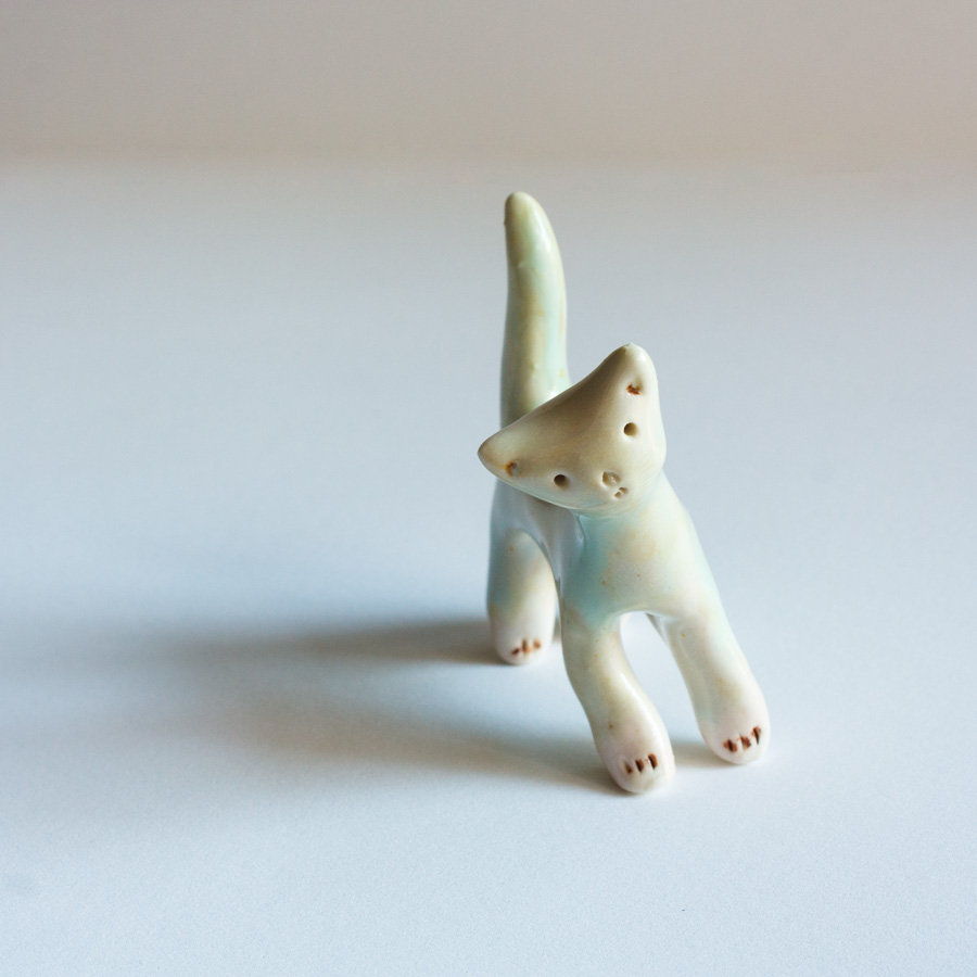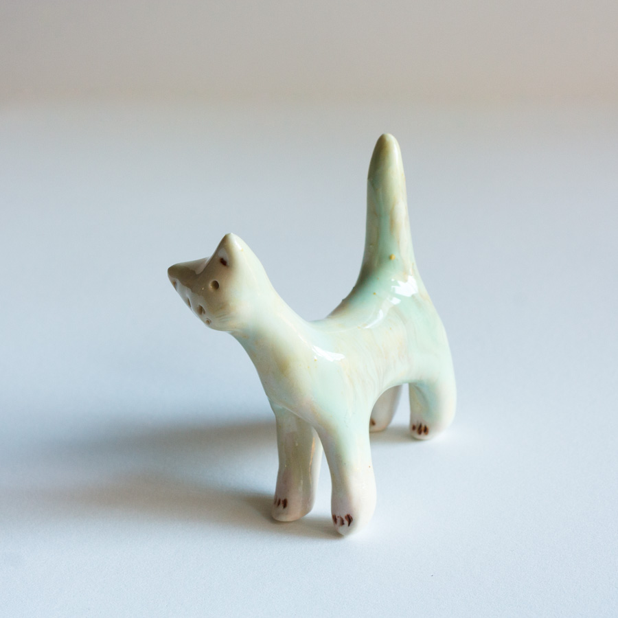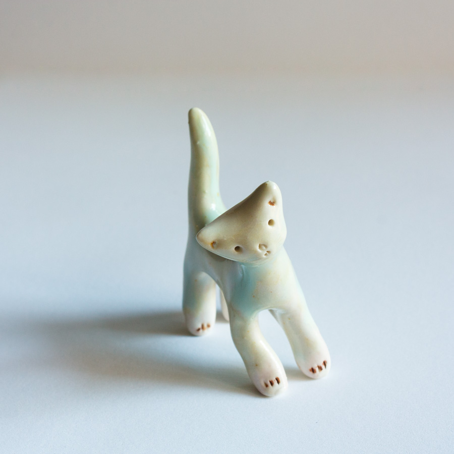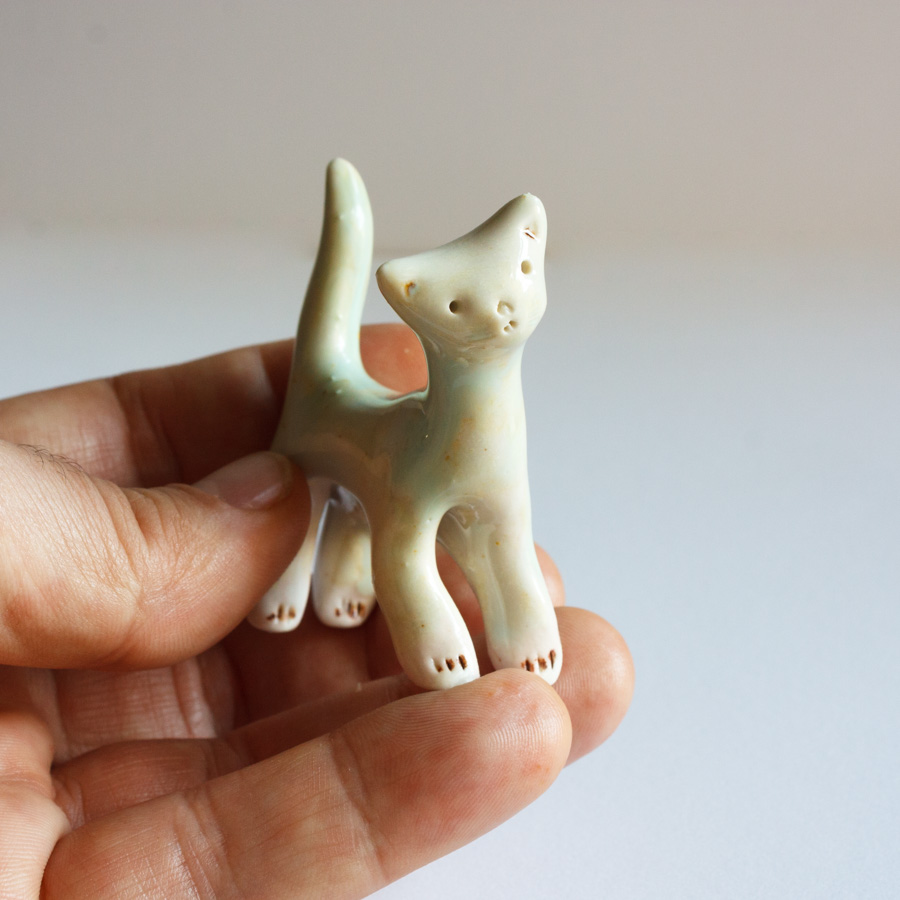 Miniatura de gato de porcelana, modelado y pintado a mano con esmaltes de alta temperatura.