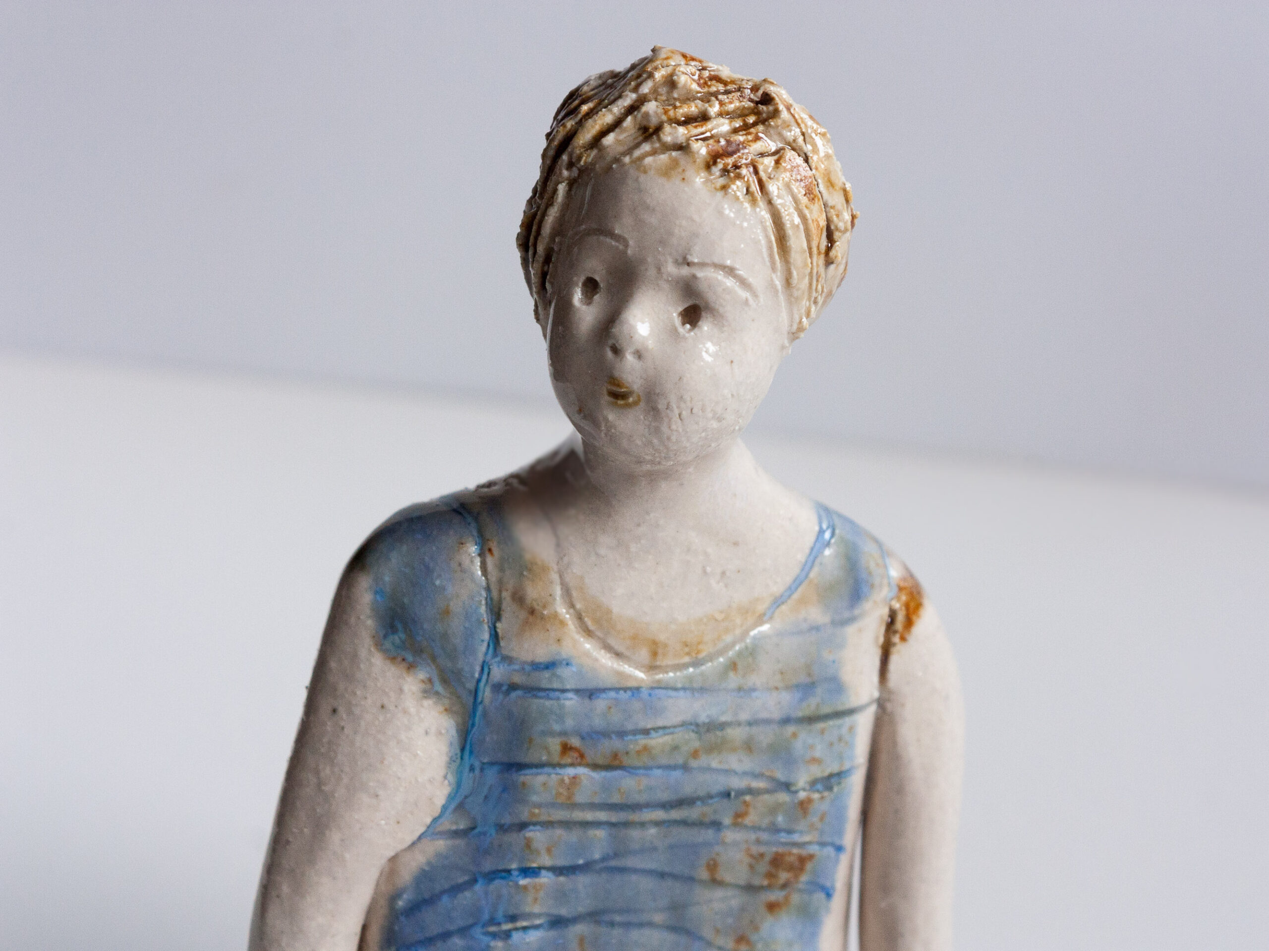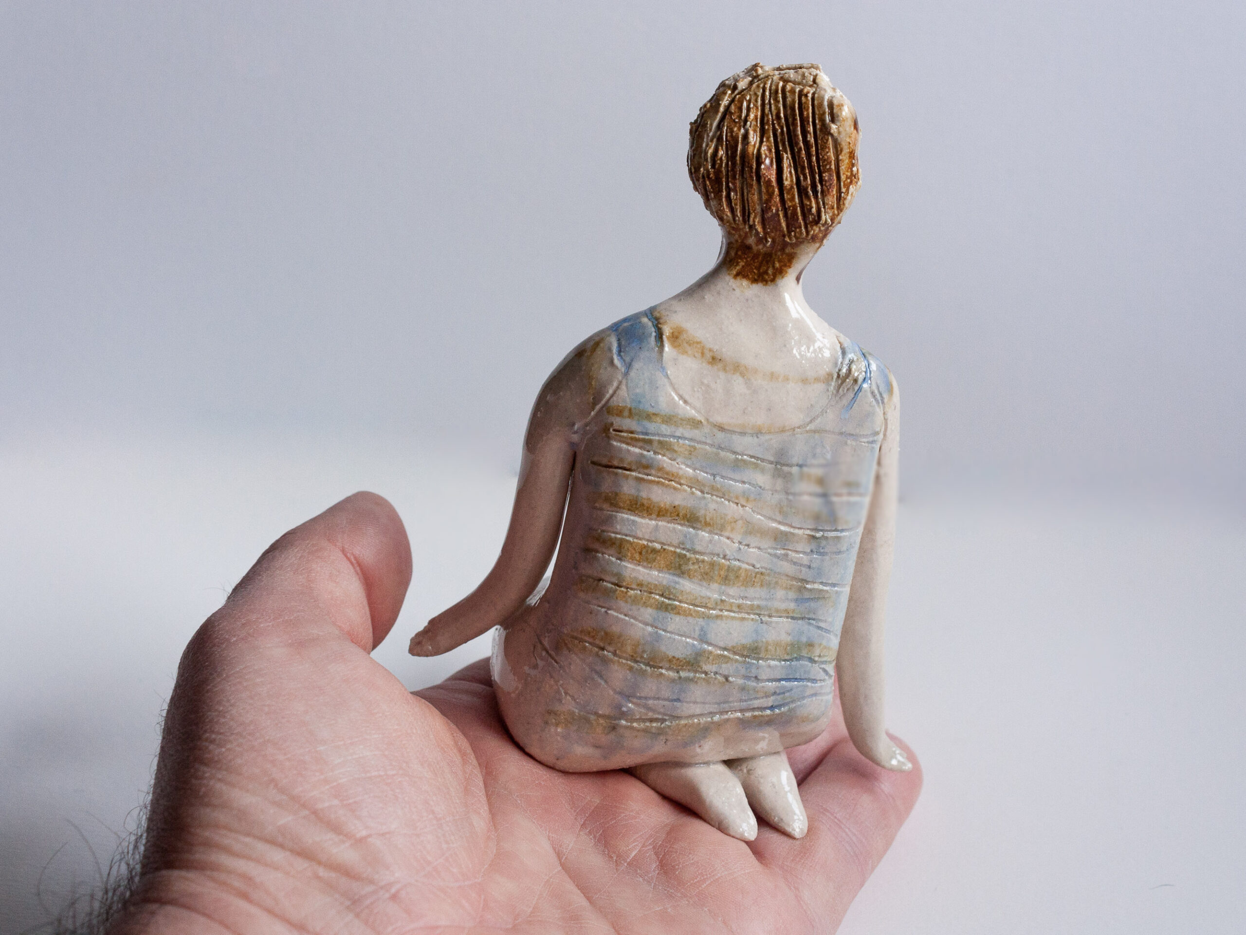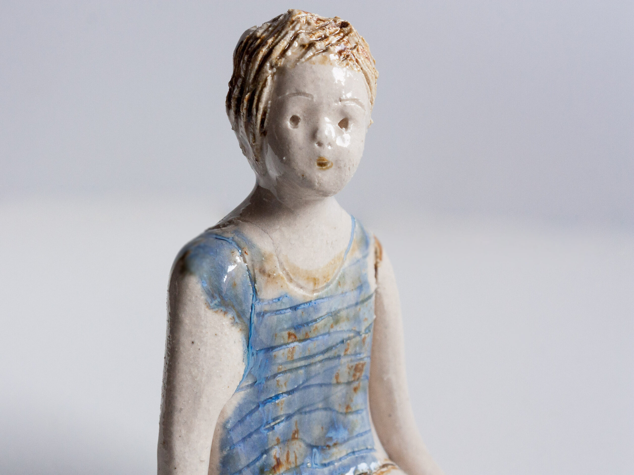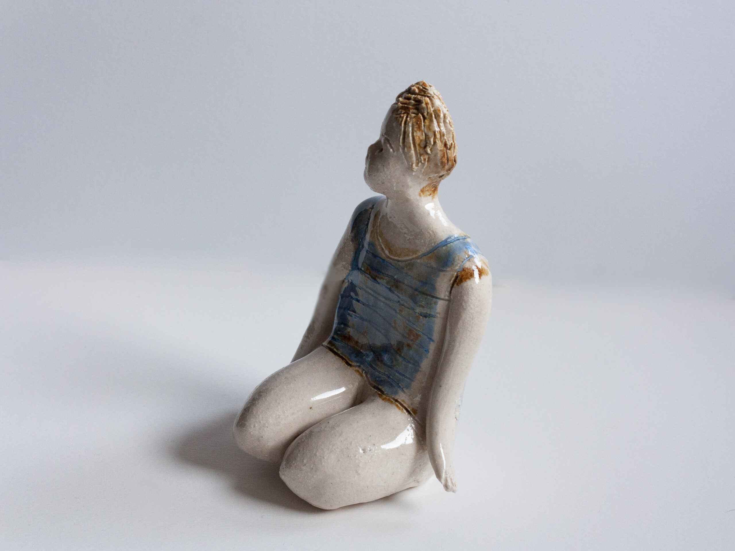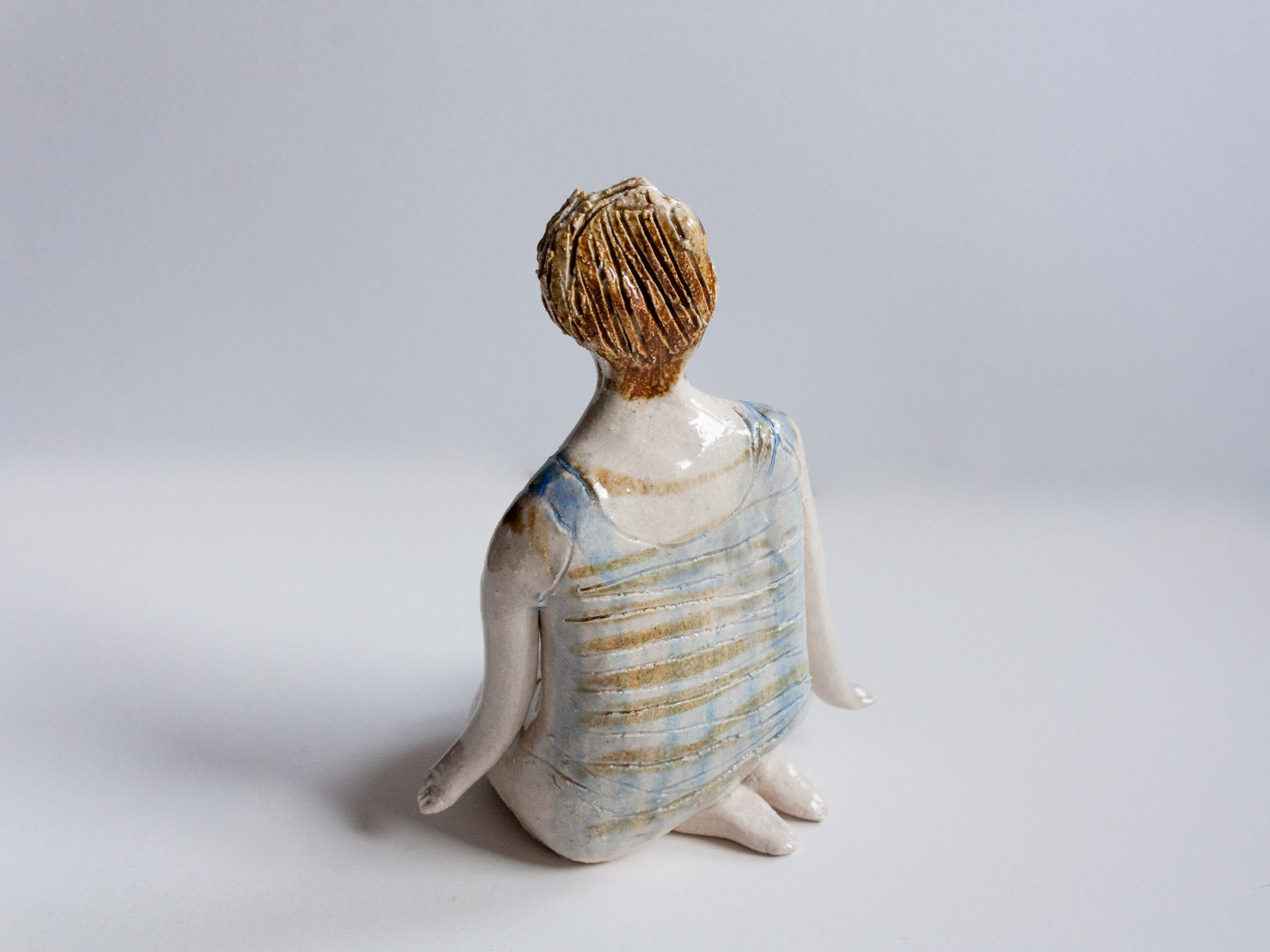 Figura de mujer con camiseta azul de tirantas con rayas horizontales que está sentada sobre sus rodillas en postura relajada. Es una figura modelada a mano en gres y pintada con esmaltes de alta temperatura. Figura decorativa.