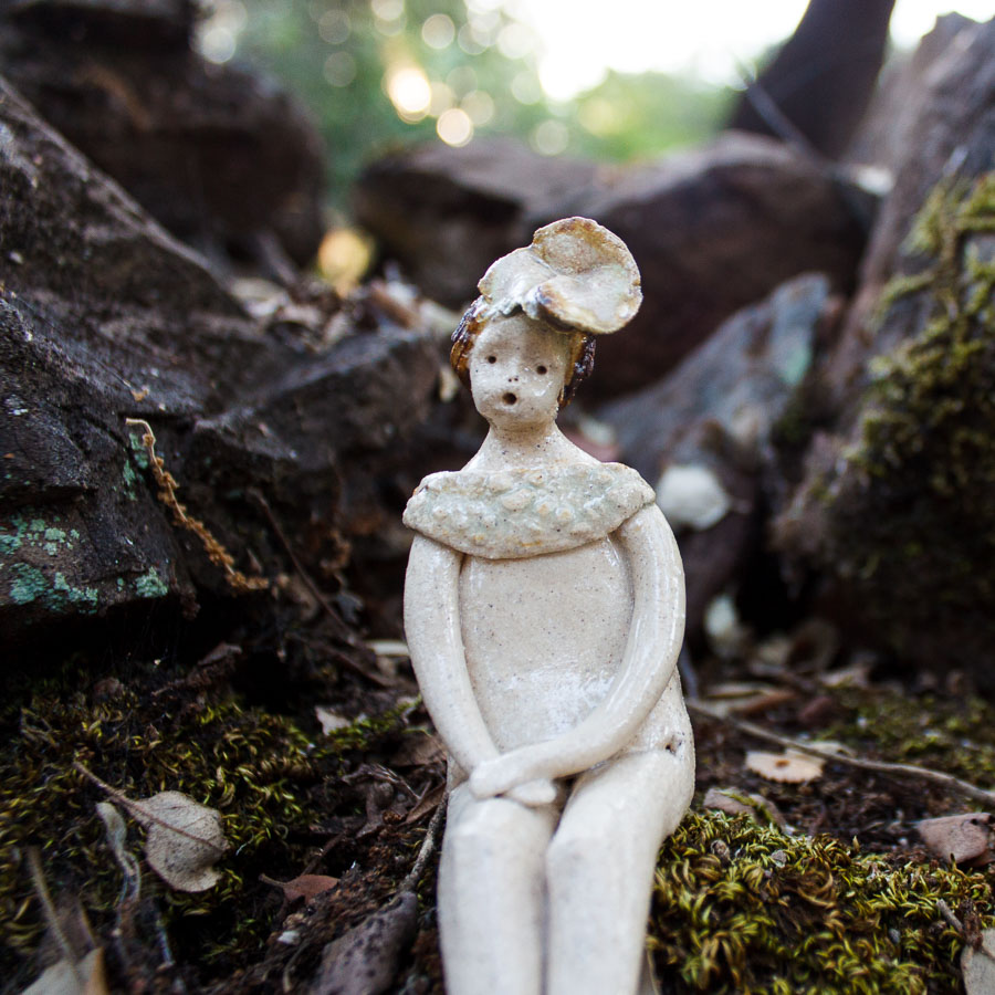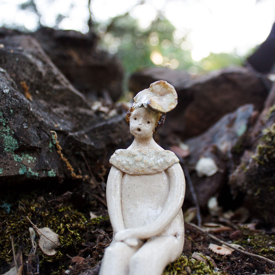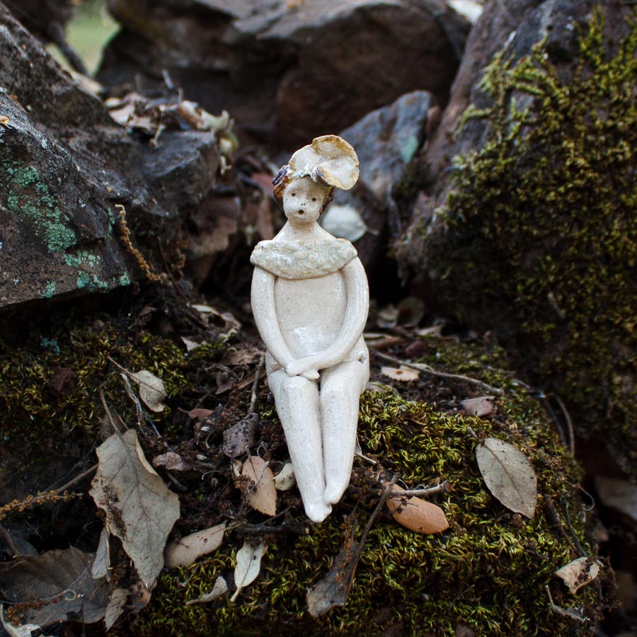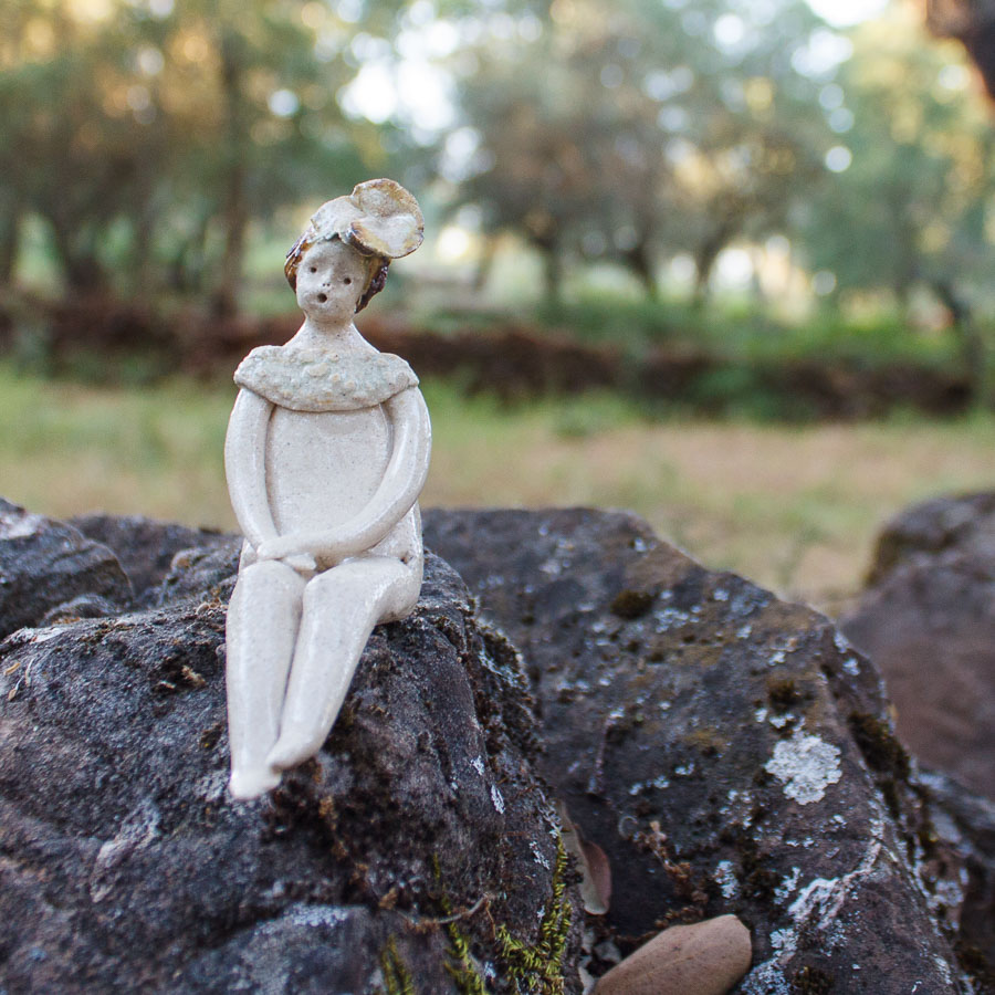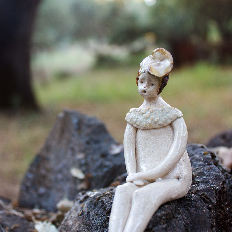 Mujercita es una figura modelada a mano en gres con flor en el pelo. Decora tu espacio con esta bonita figura. Para colocar sentada sobre el borde de una balda de estantería, un libro o cualquier soporte.