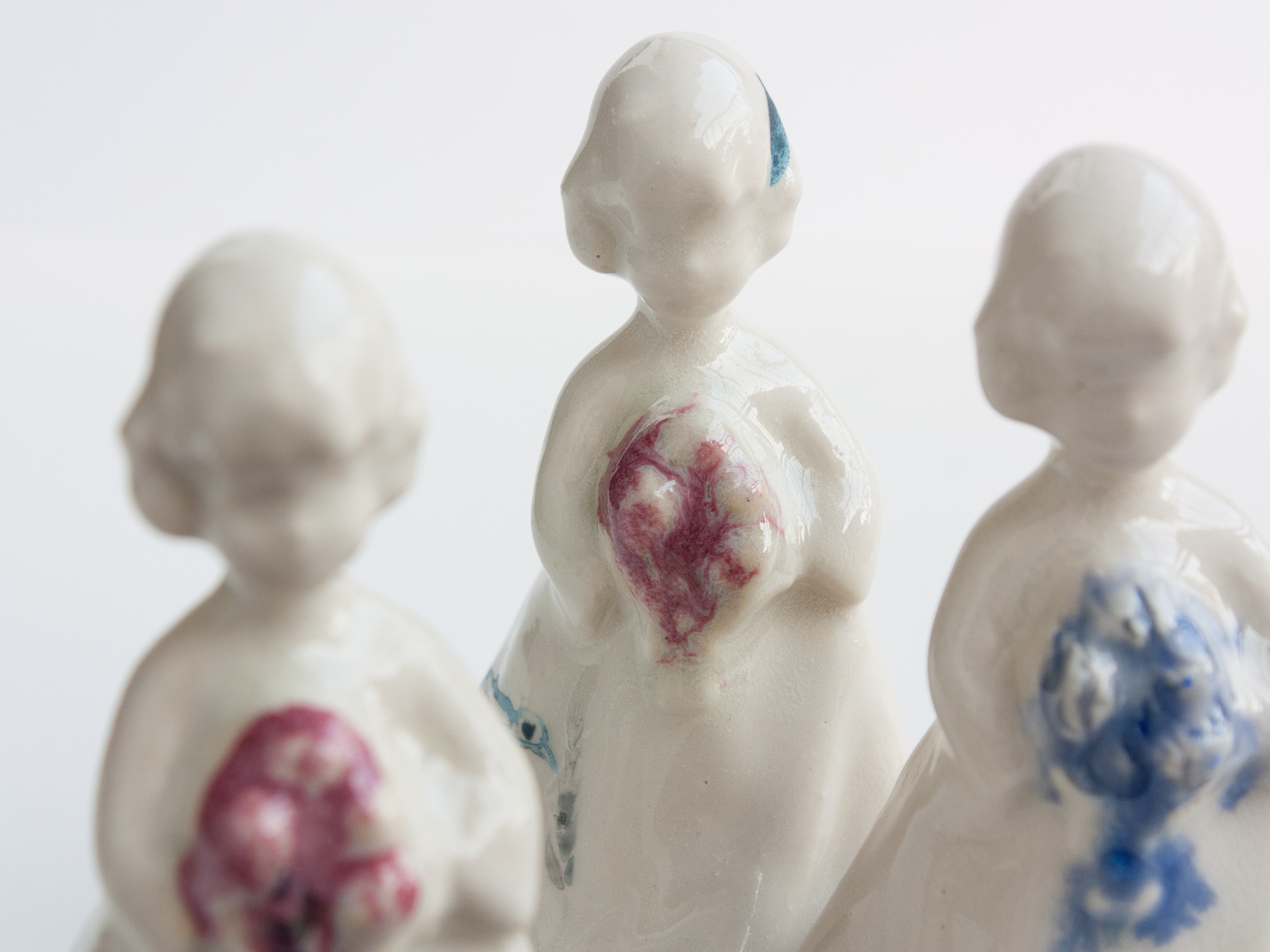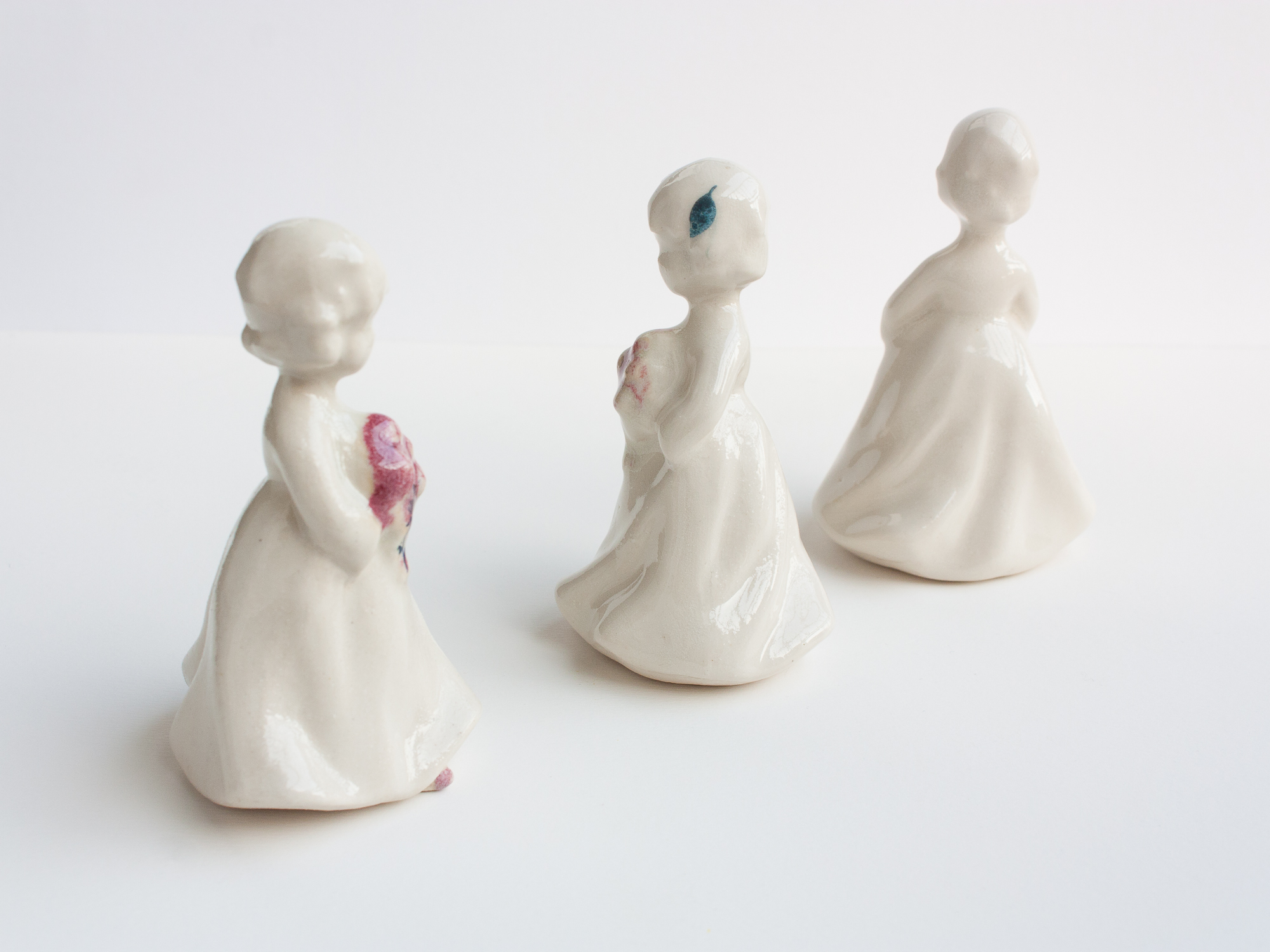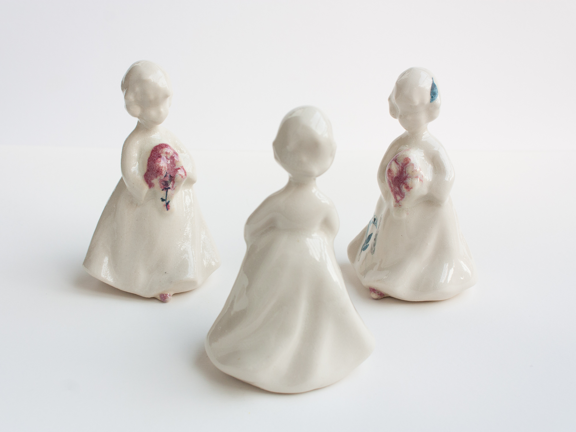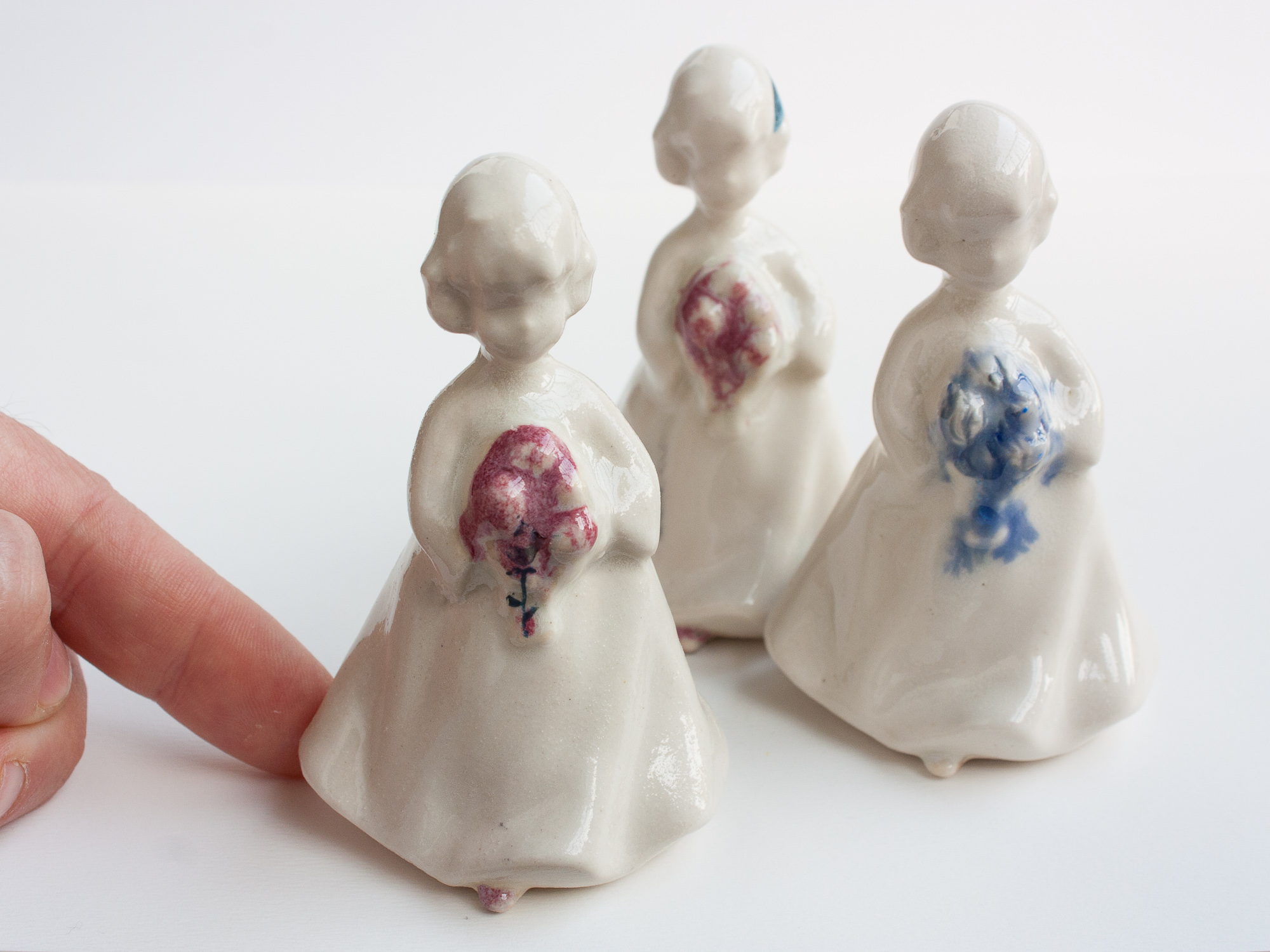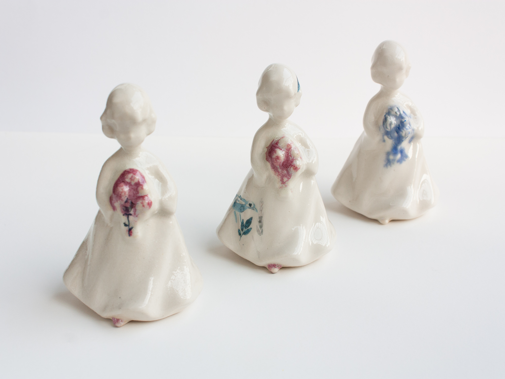 Preciosa figura de niña portando un ramo de flores en sus manos mientras avanza andando y asoma un pie bajo su vestido. La figura está realizada en gres blanco de alta temperatura y esmaltada, y el ramo de flores pintado con esmalte en azul o cereza. Algunas tienen detalles de hojas y pájaros impresos con calcas cerámicos.