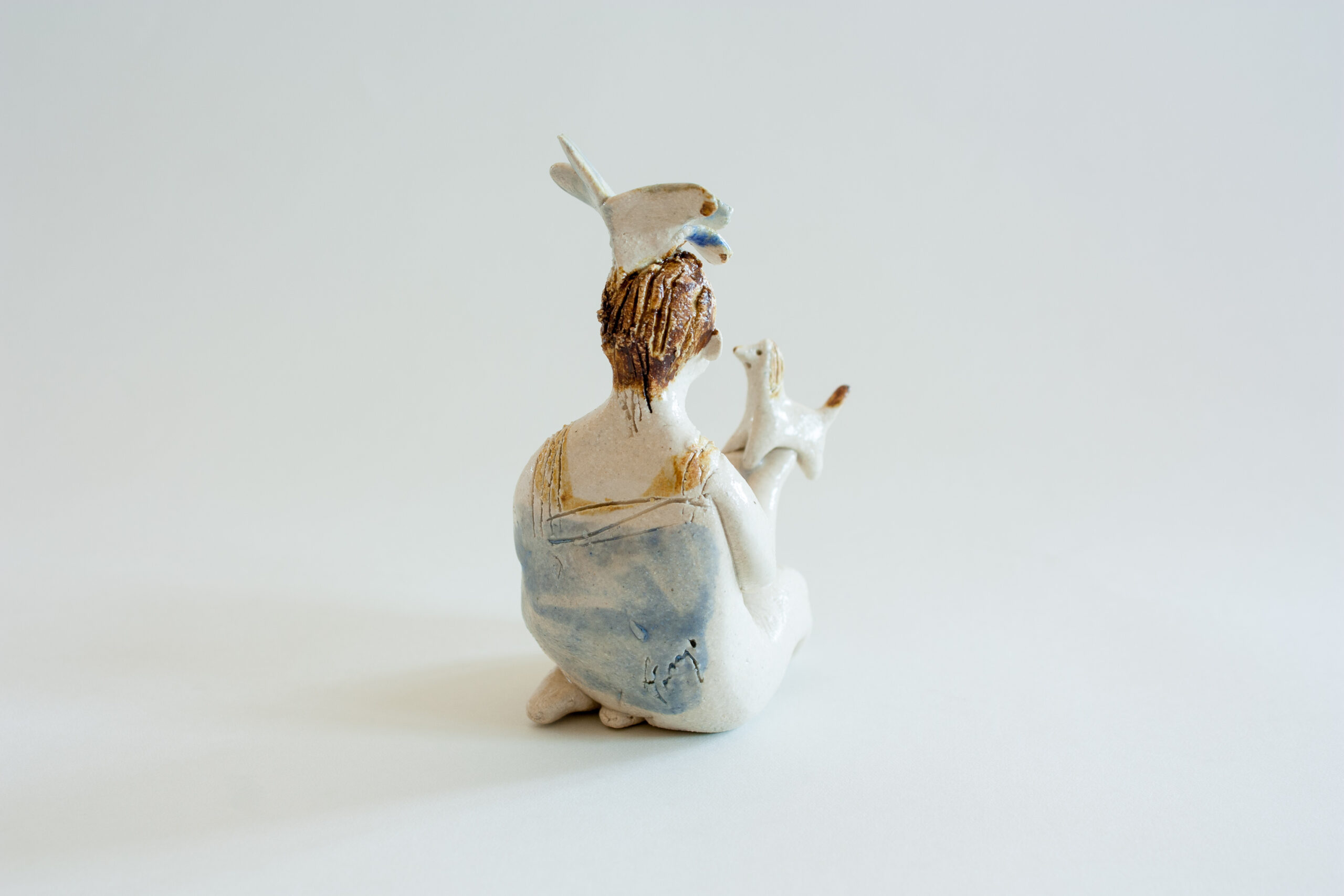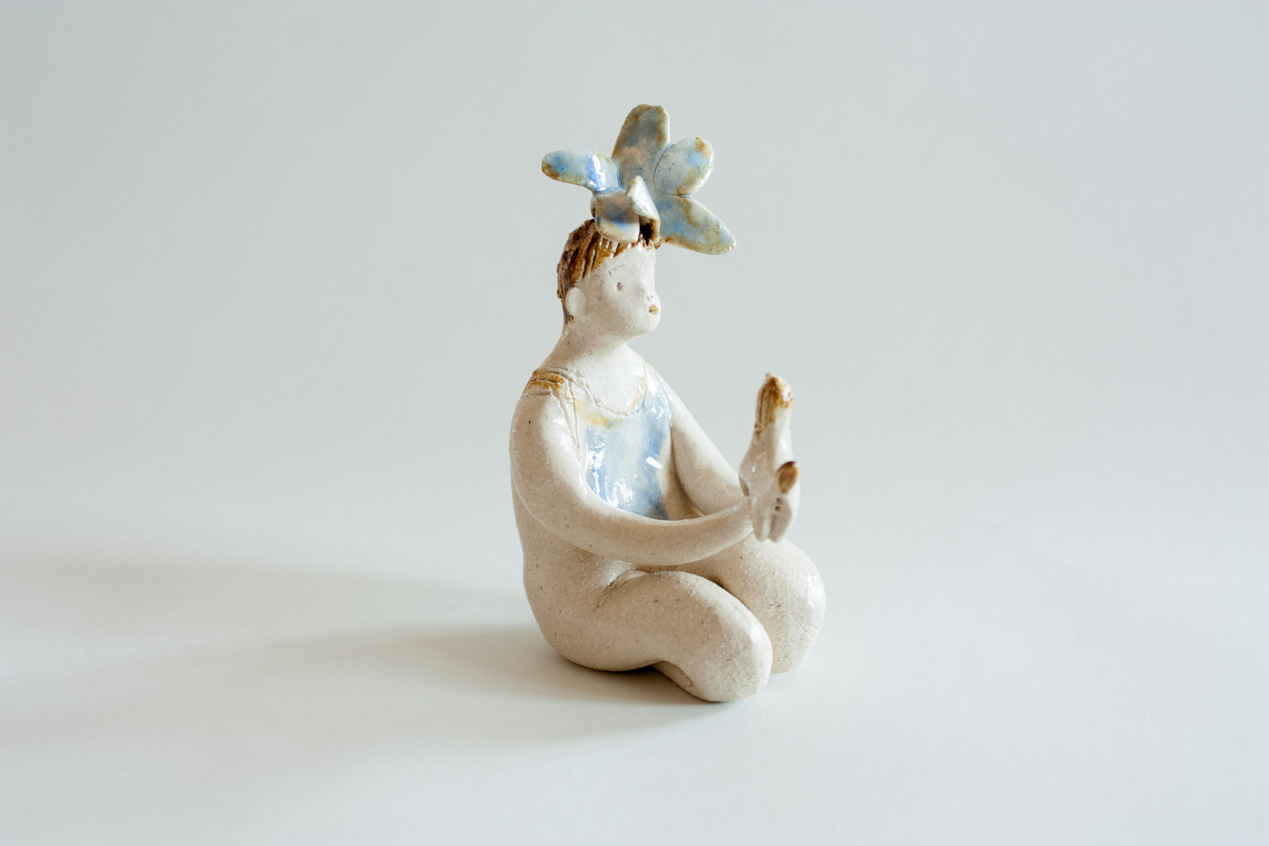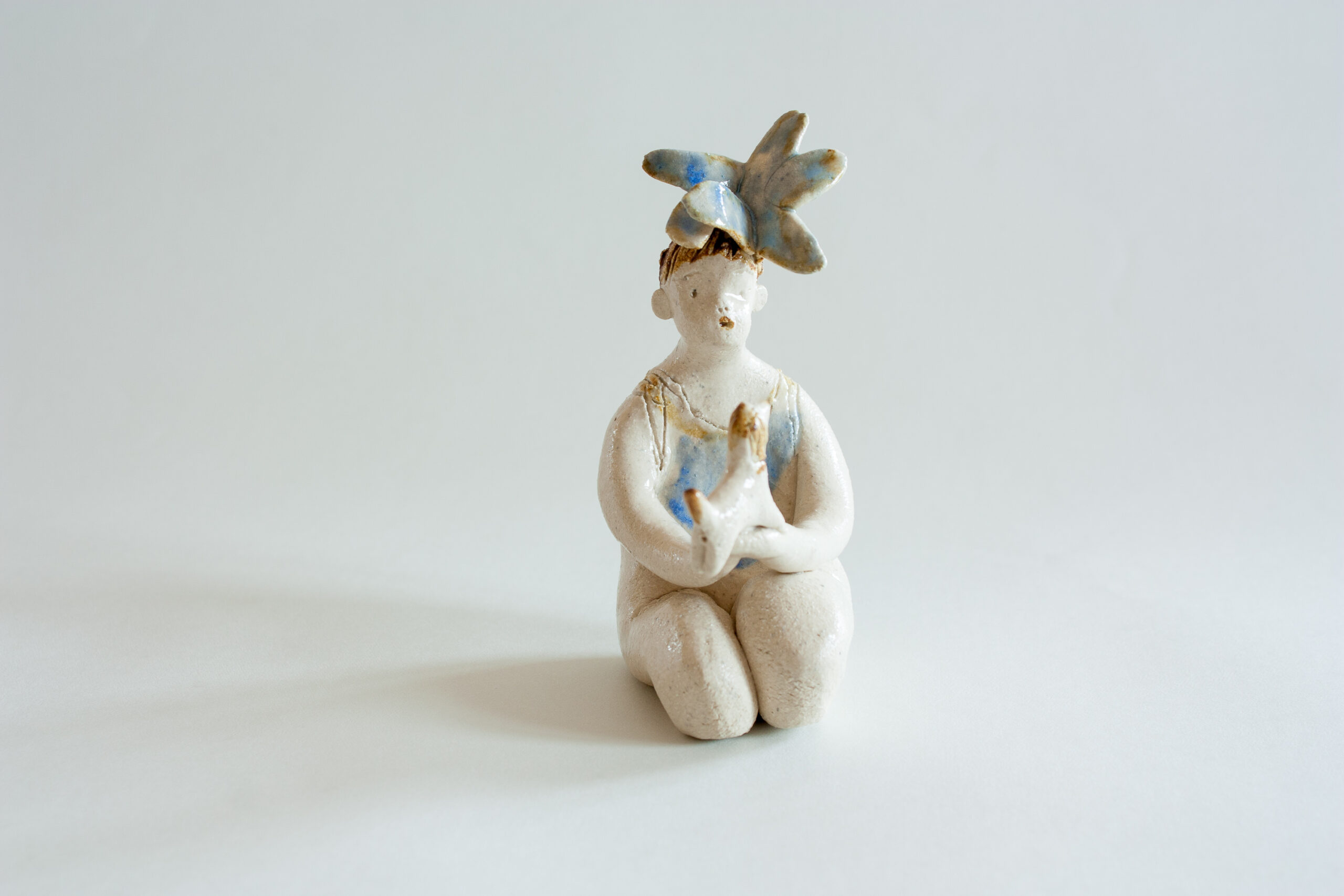 Figura de mujer sentada de rodillas con su querido perrito sujetándolo sobre sus manos. Lleva una flor en el pelo a modo de tocado de color azul y su ropa también es de color azul.