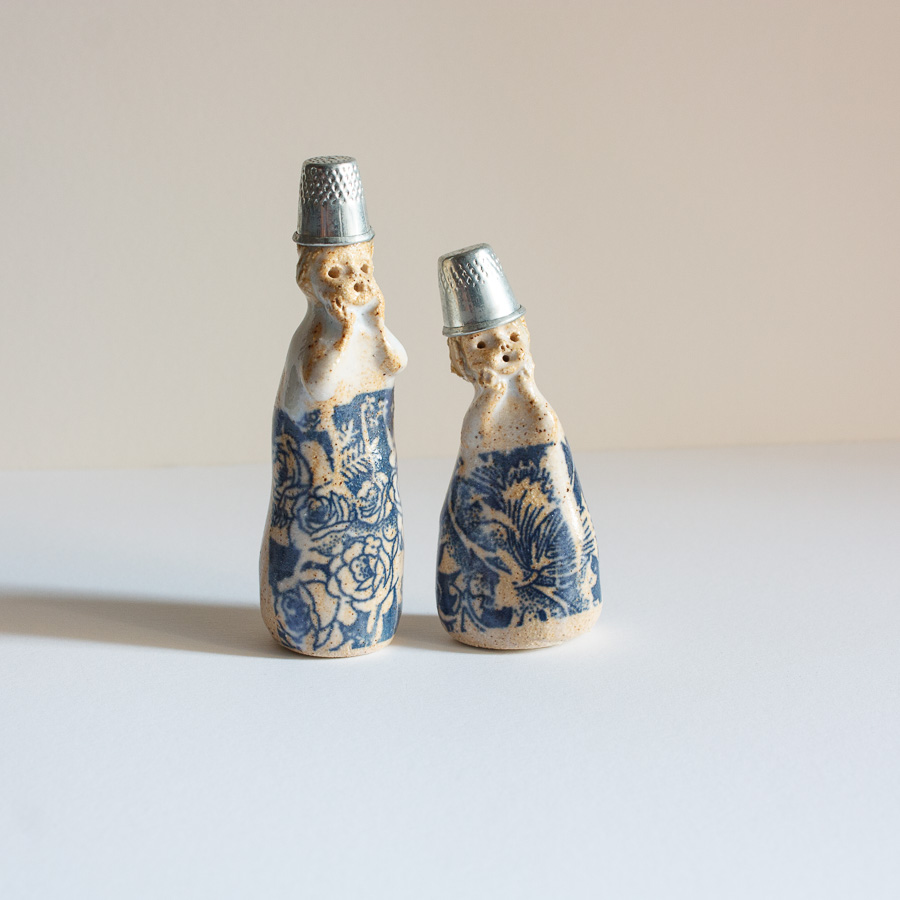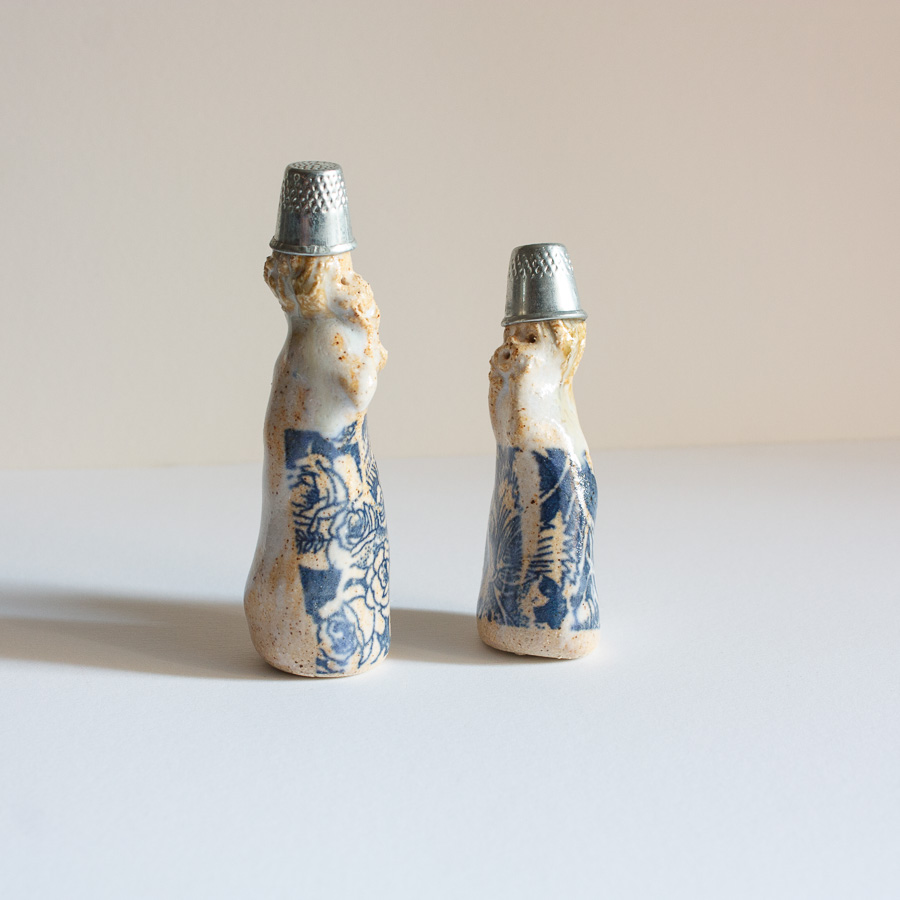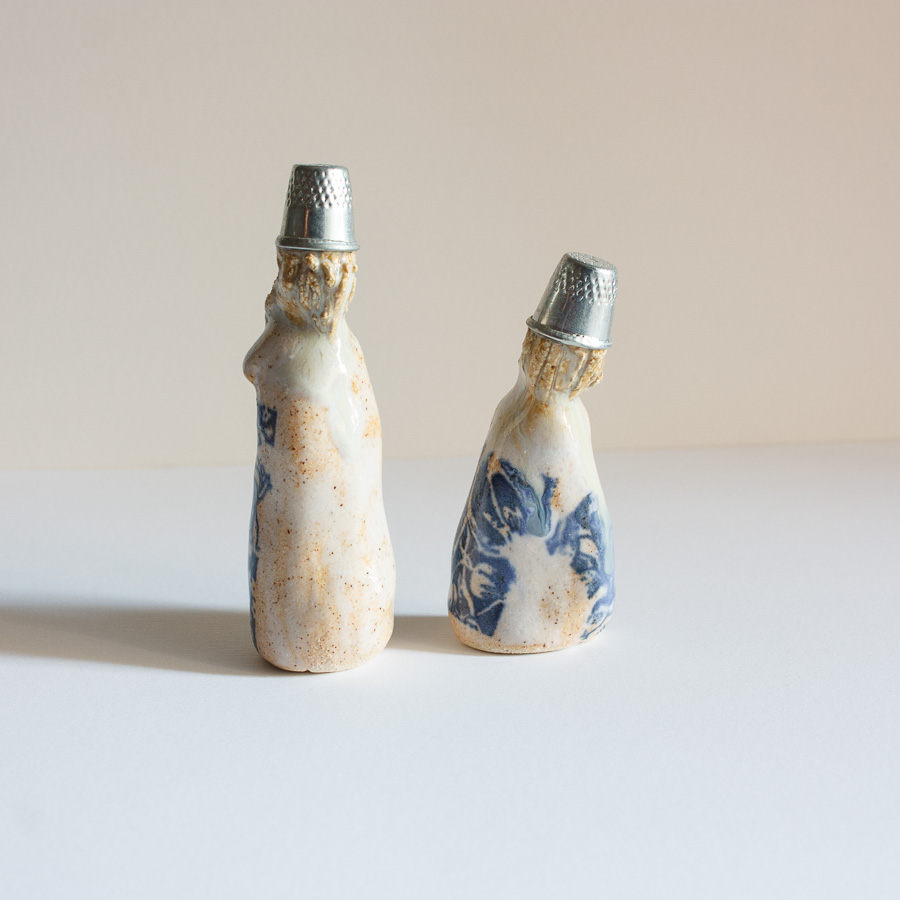 Pareja de niñas con dedal en la cabeza, realizado en gres y decorado con esmaltes de alta temperatura.