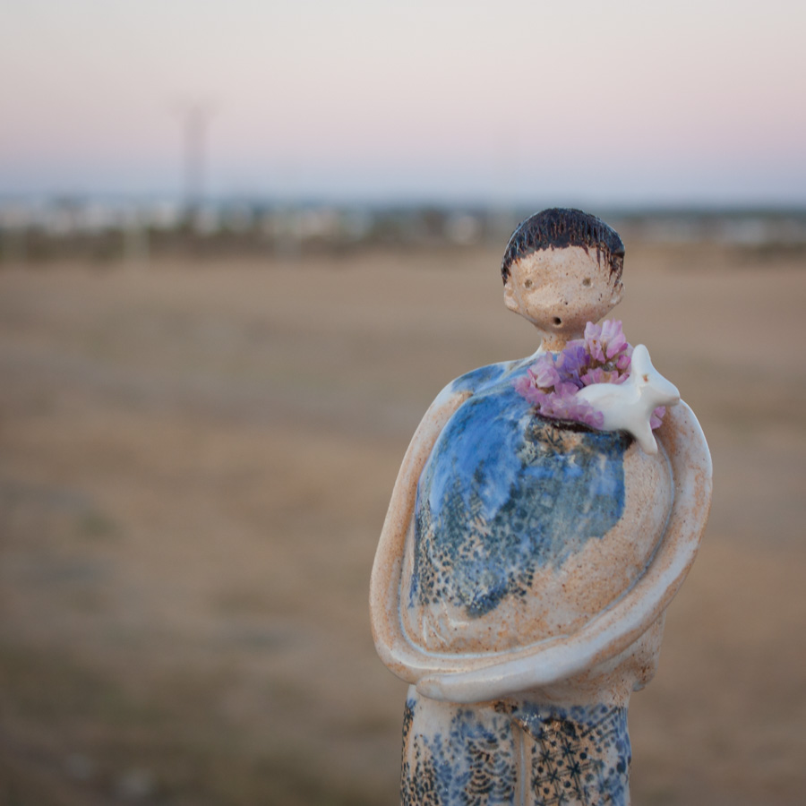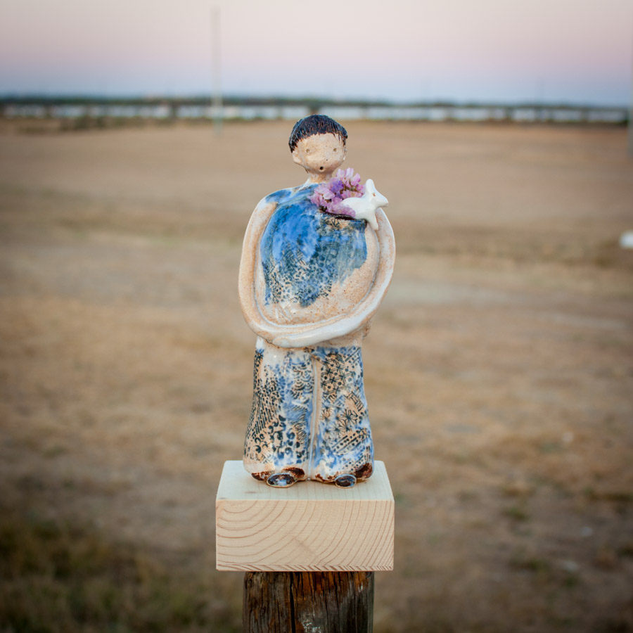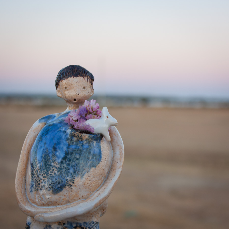 Figura de niño con conejito. Puedes colocar flores en un agujero que tiene en la solapa. La figura va sobre un taco de madera que hace las veces de soporte.