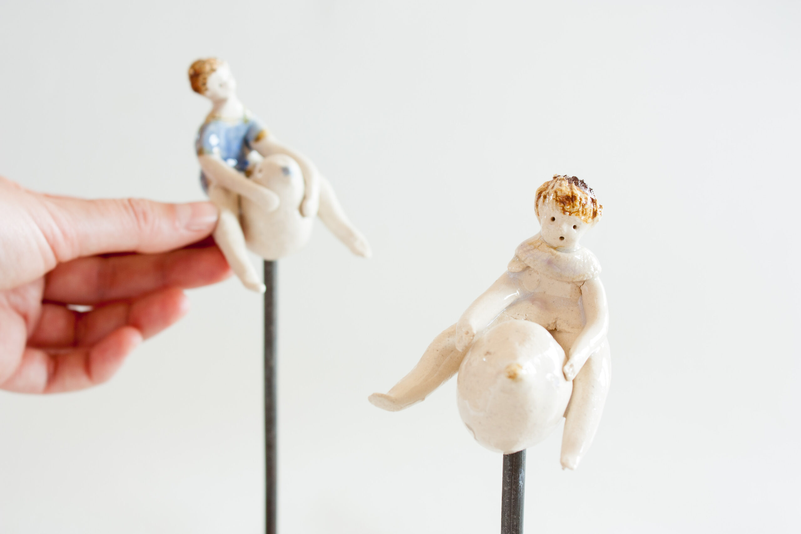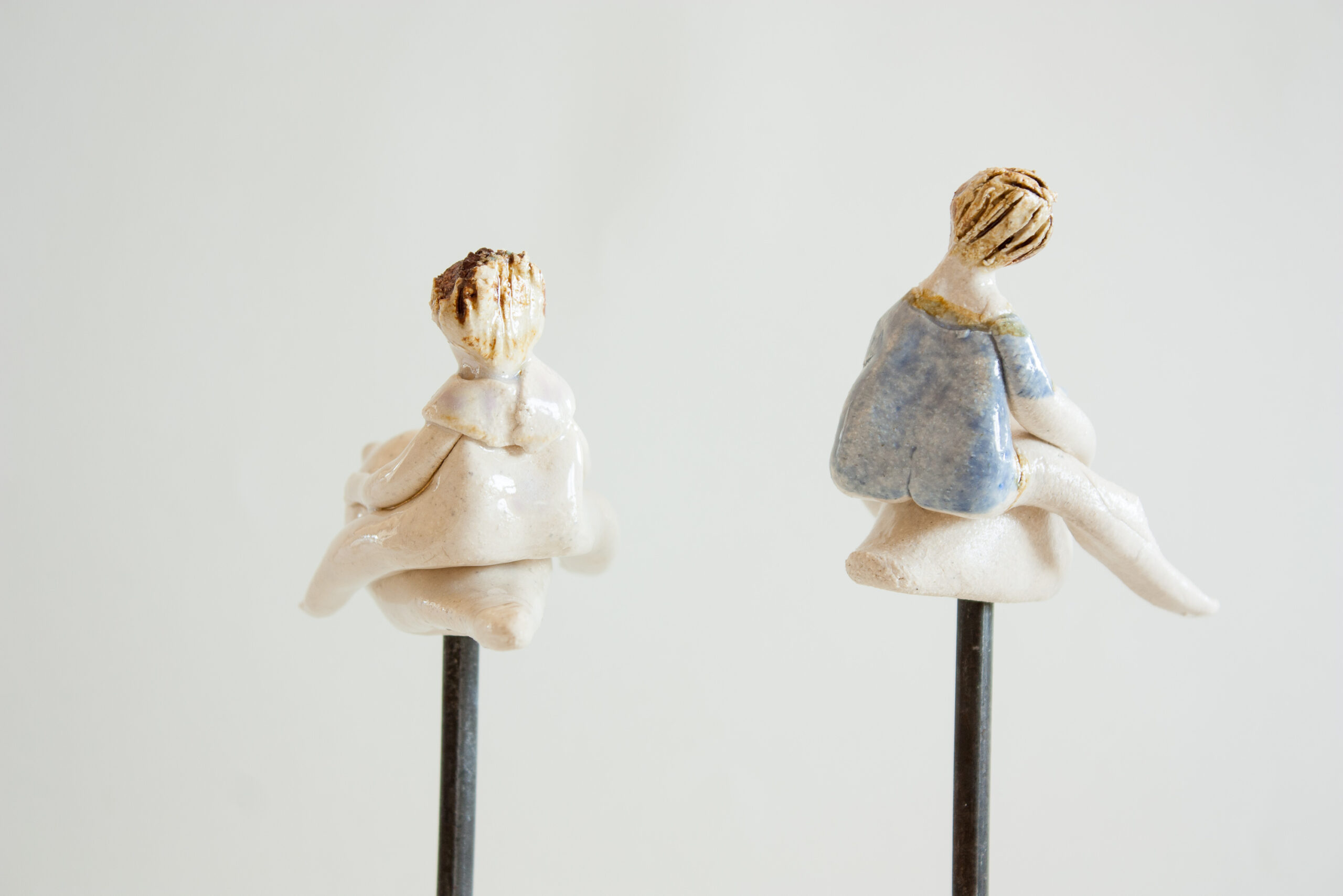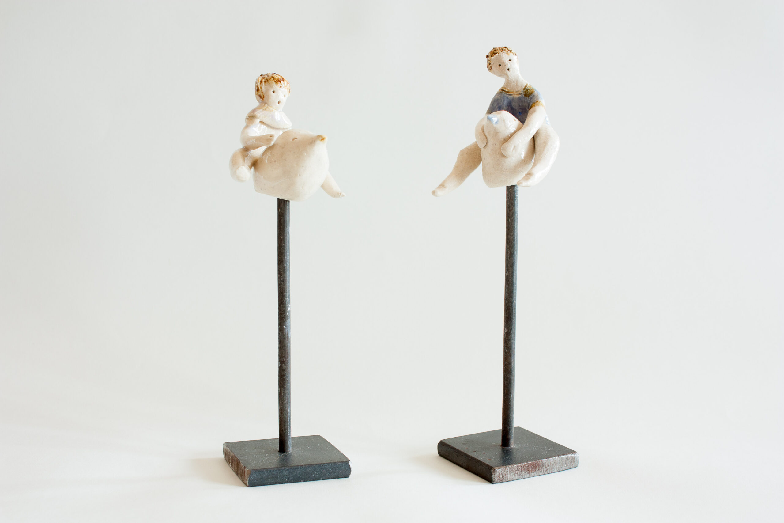Cada una de las piezas consta de la figura de cerámica del niño o niña sobre un pajarillo (ambas van unidas y son piezas únicas modeladas a mano) y un soporte de hierro donde puedes colocarlo de diferentes maneras, con distintos ángulos de inclinación para darle diversas sensaciones de vuelo. Aunque tiene estabilidad, es aconsejable situar la pieza en una estancia segura de la casa para evitar golpearla y que pueda caer.