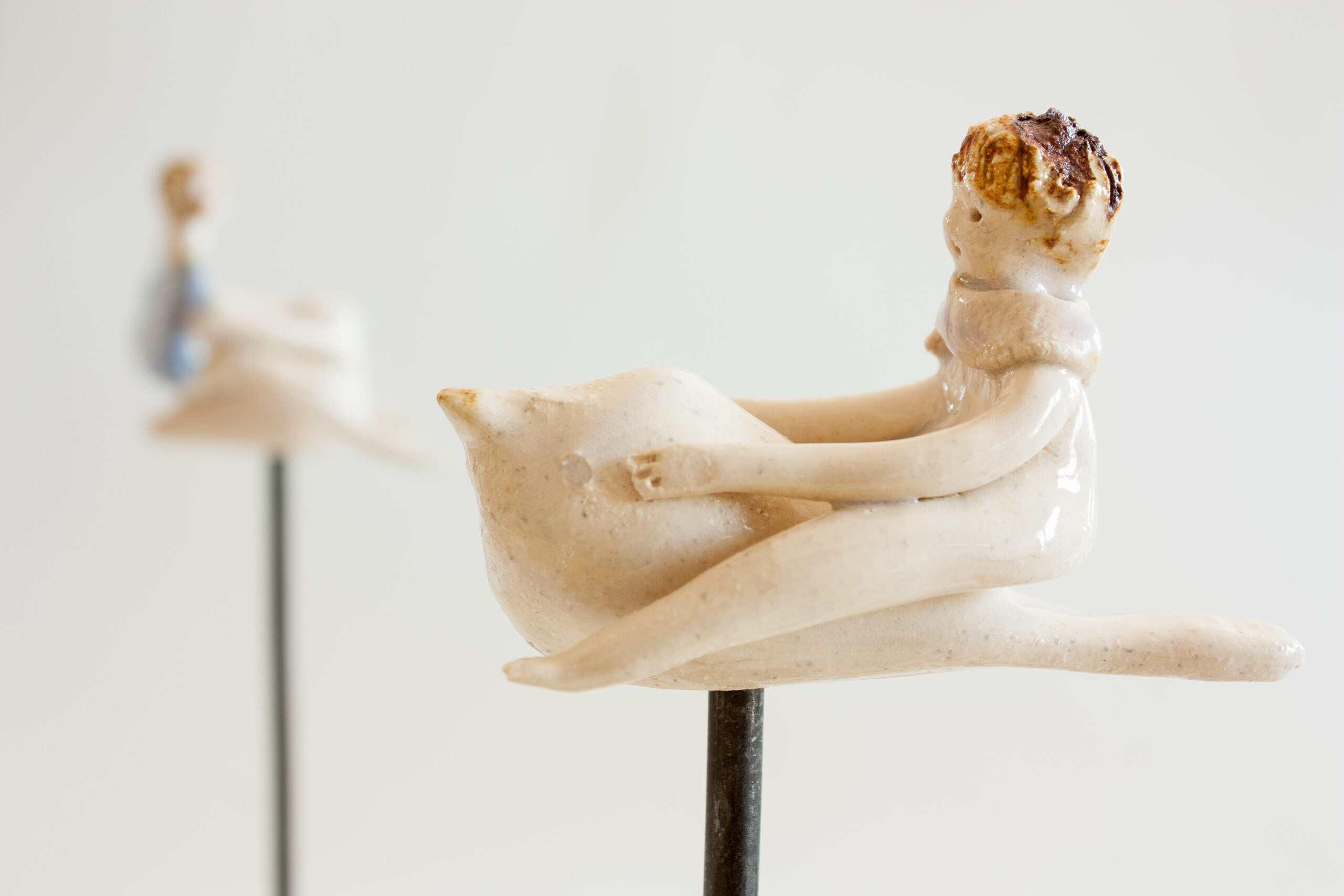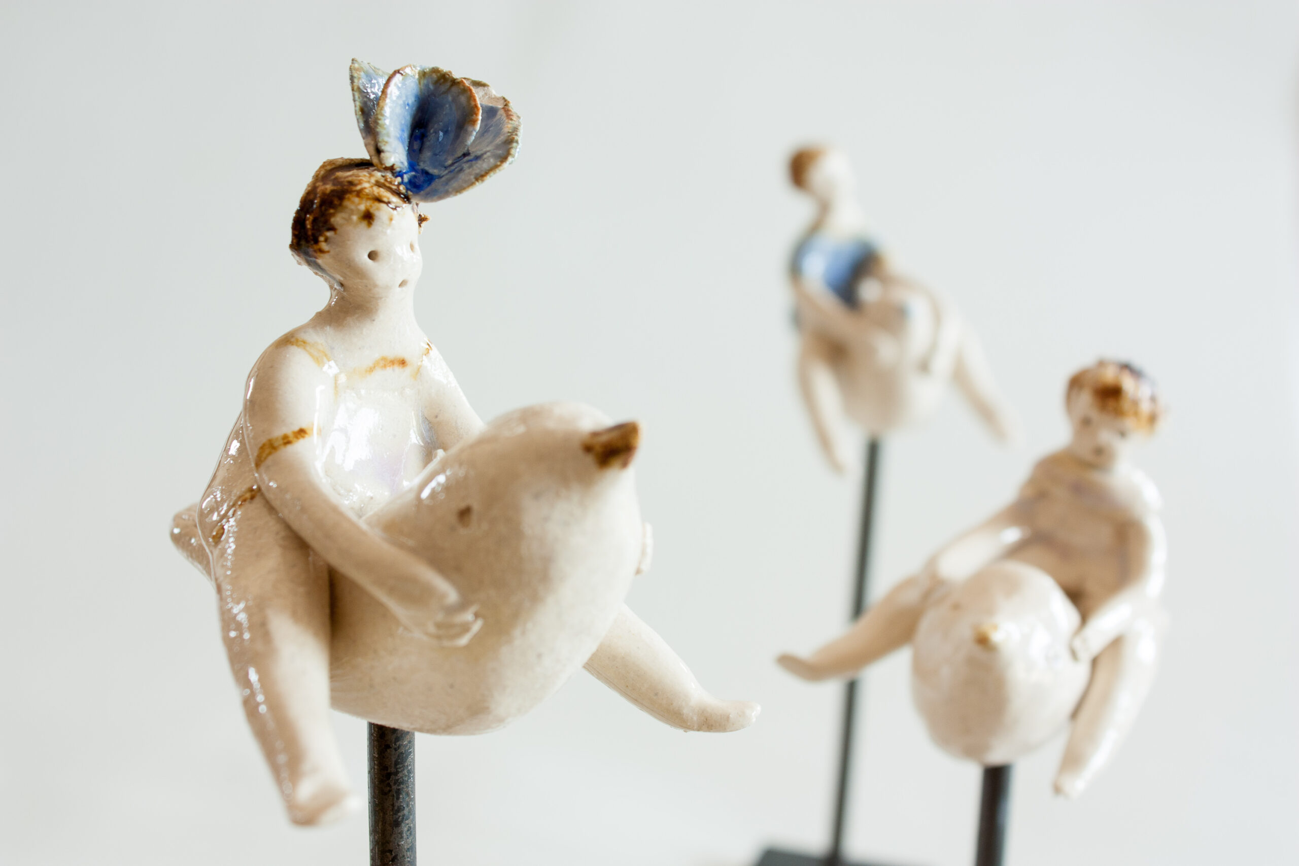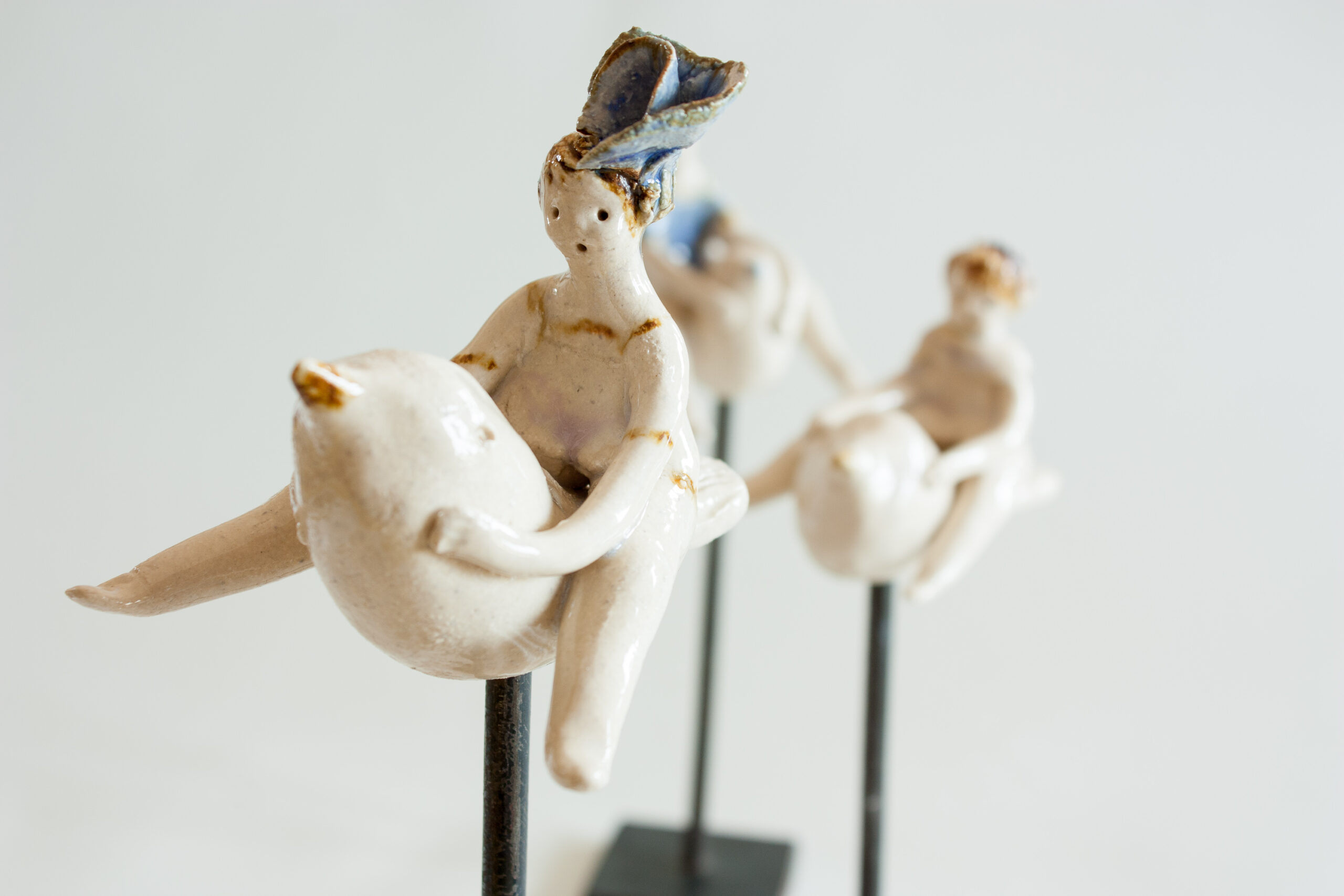 Cada una de las piezas consta de la figura de cerámica del niño o niña sobre un pajarillo (ambas van unidas y son piezas únicas modeladas a mano) y un soporte de hierro donde puedes colocarlo de diferentes maneras, con distintos ángulos de inclinación para darle diversas sensaciones de vuelo. Aunque tiene estabilidad, es aconsejable situar la pieza en una estancia segura de la casa para evitar golpearla y que pueda caer.