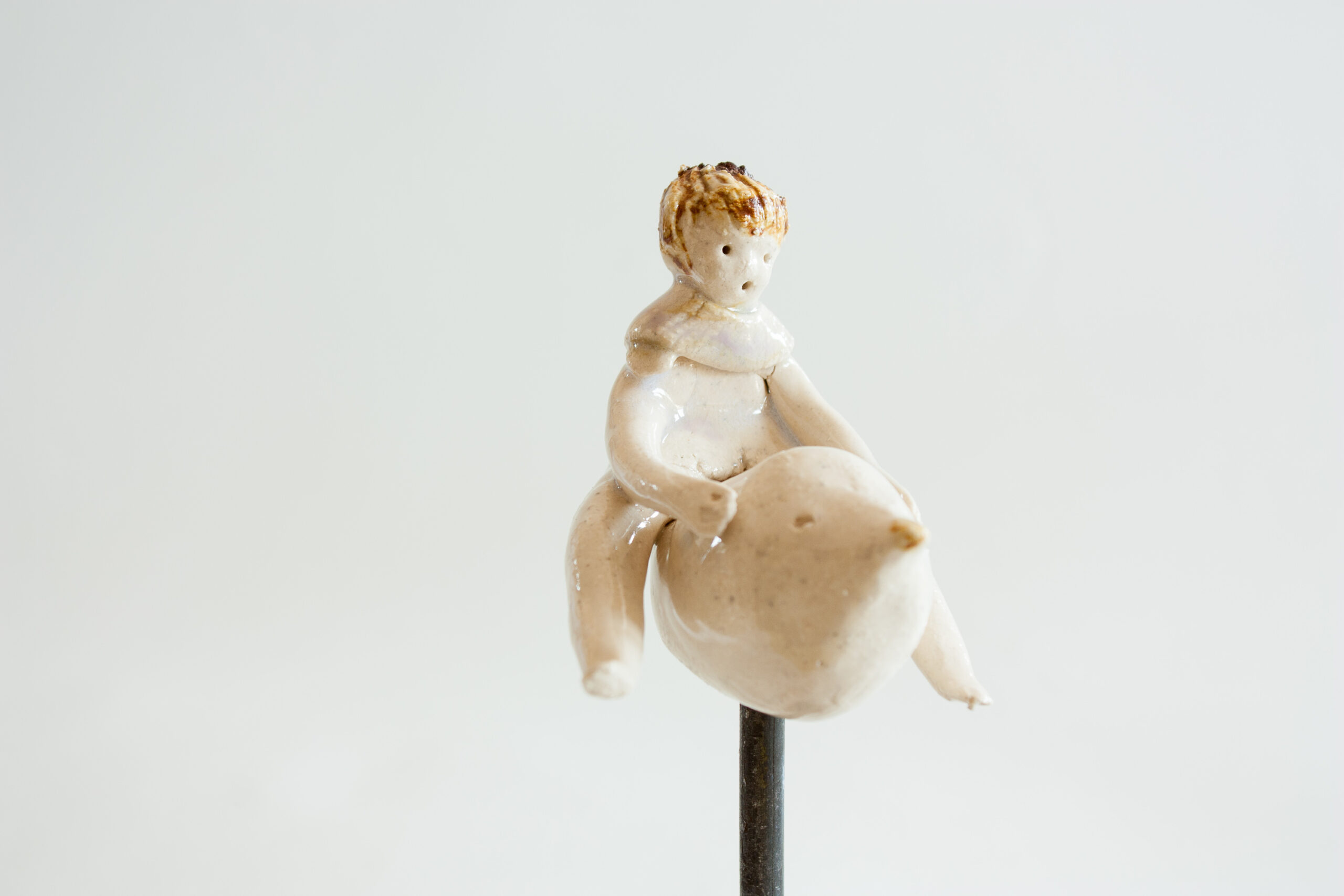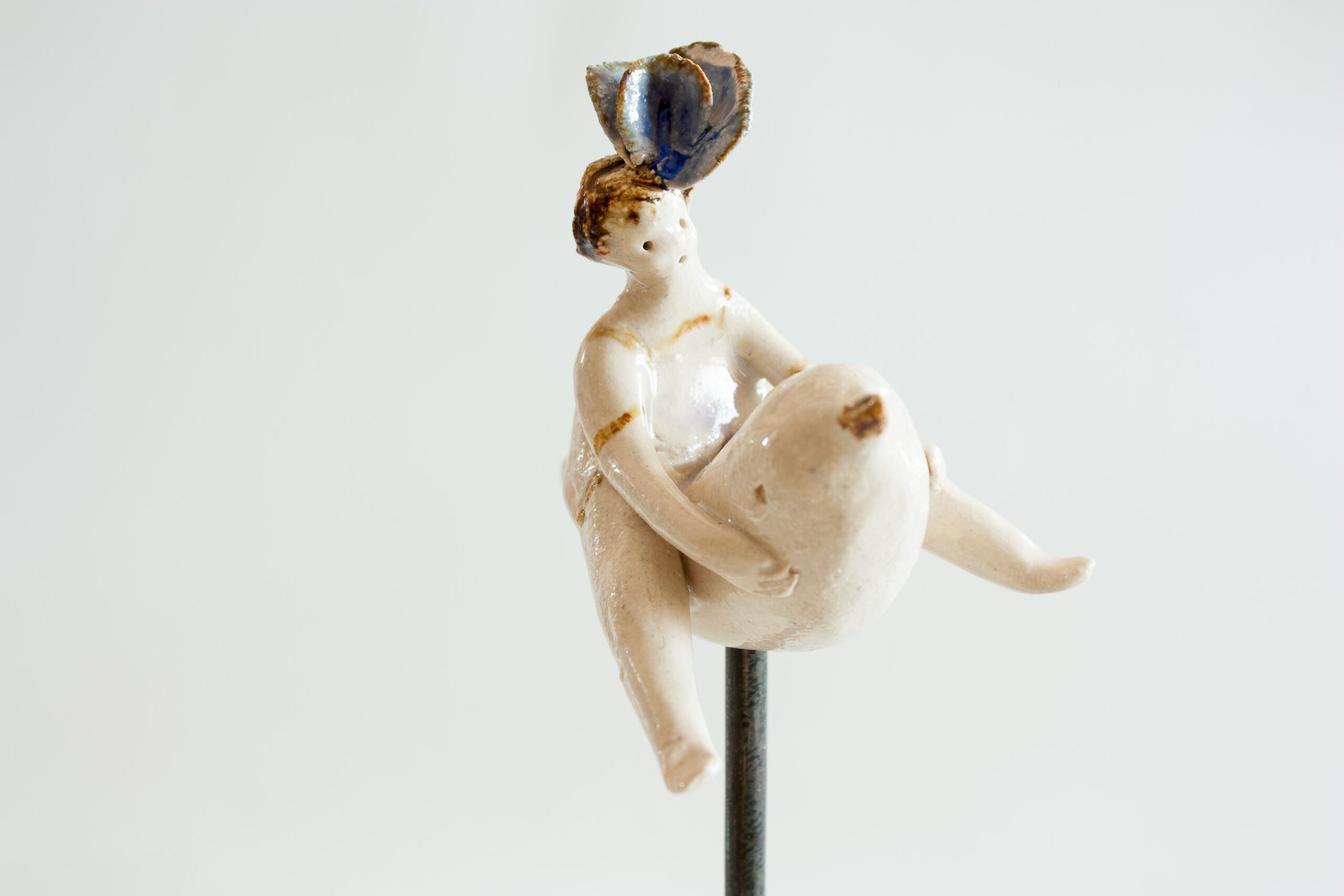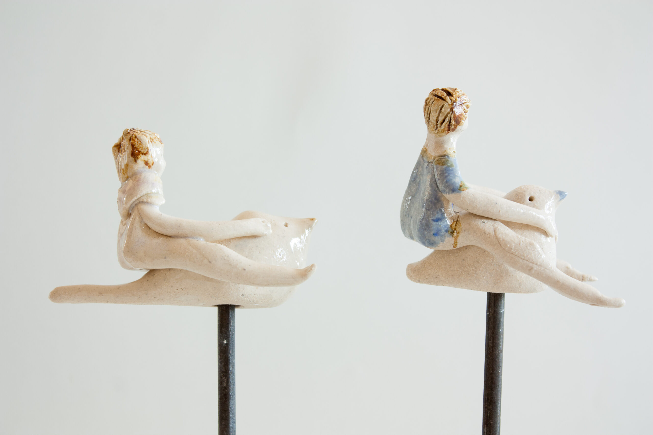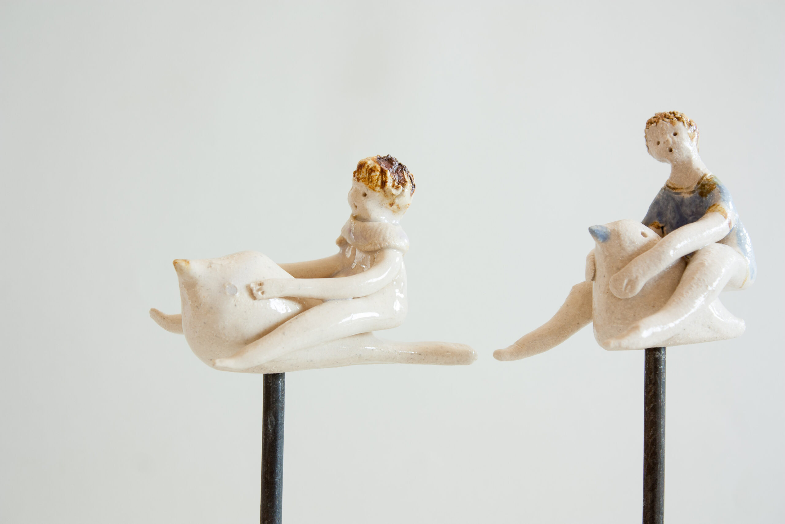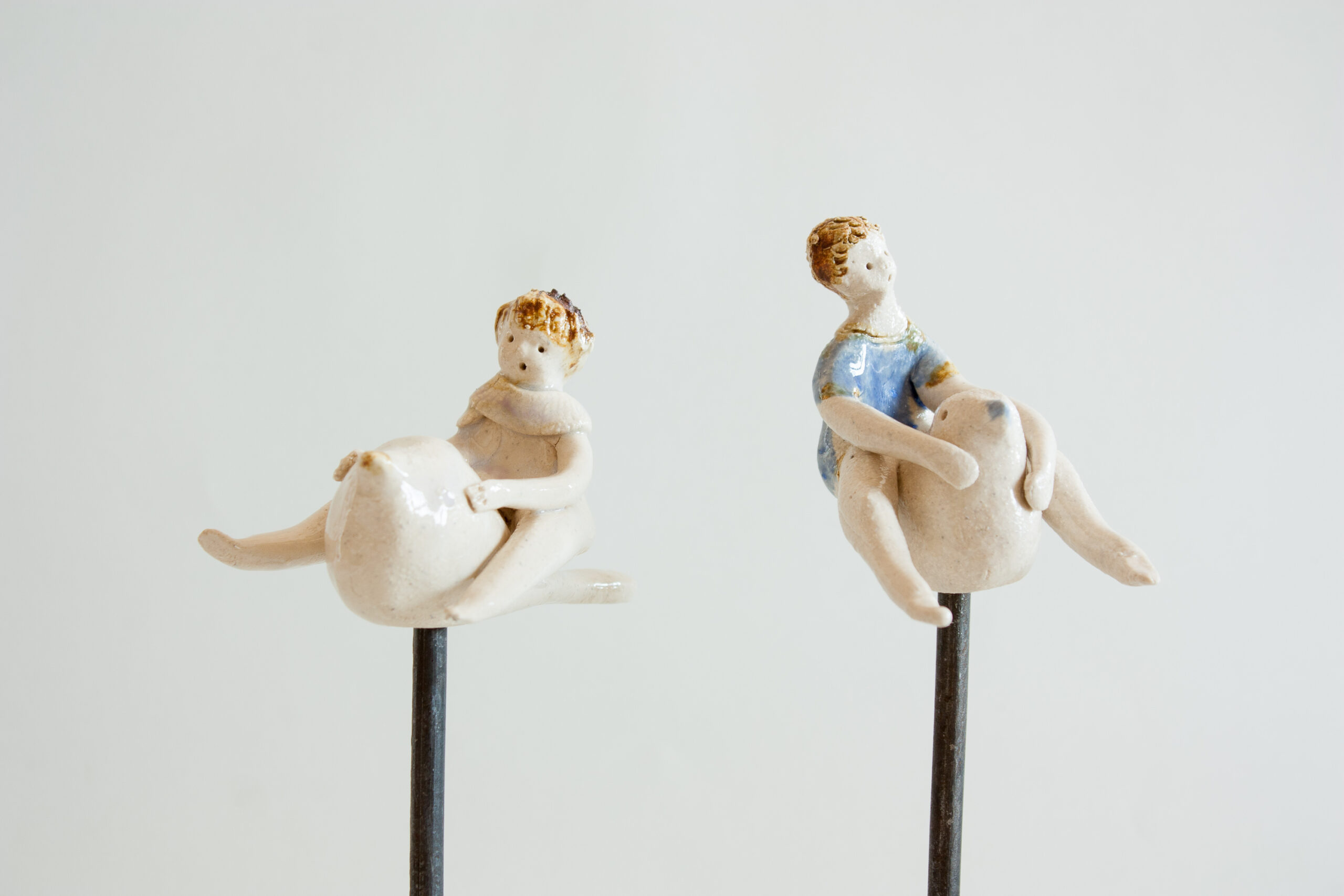 Figura de niño o niña montando sobre un pajarito sobre soporte de hierro realizado en gres y decorado con esmaltes de alta temperatura 1240ºC. Estás lindas esculturas invitan a soñar, a imaginar la fantasía que todos tenemos desde muy pequeños de volar libres como un pájaro.