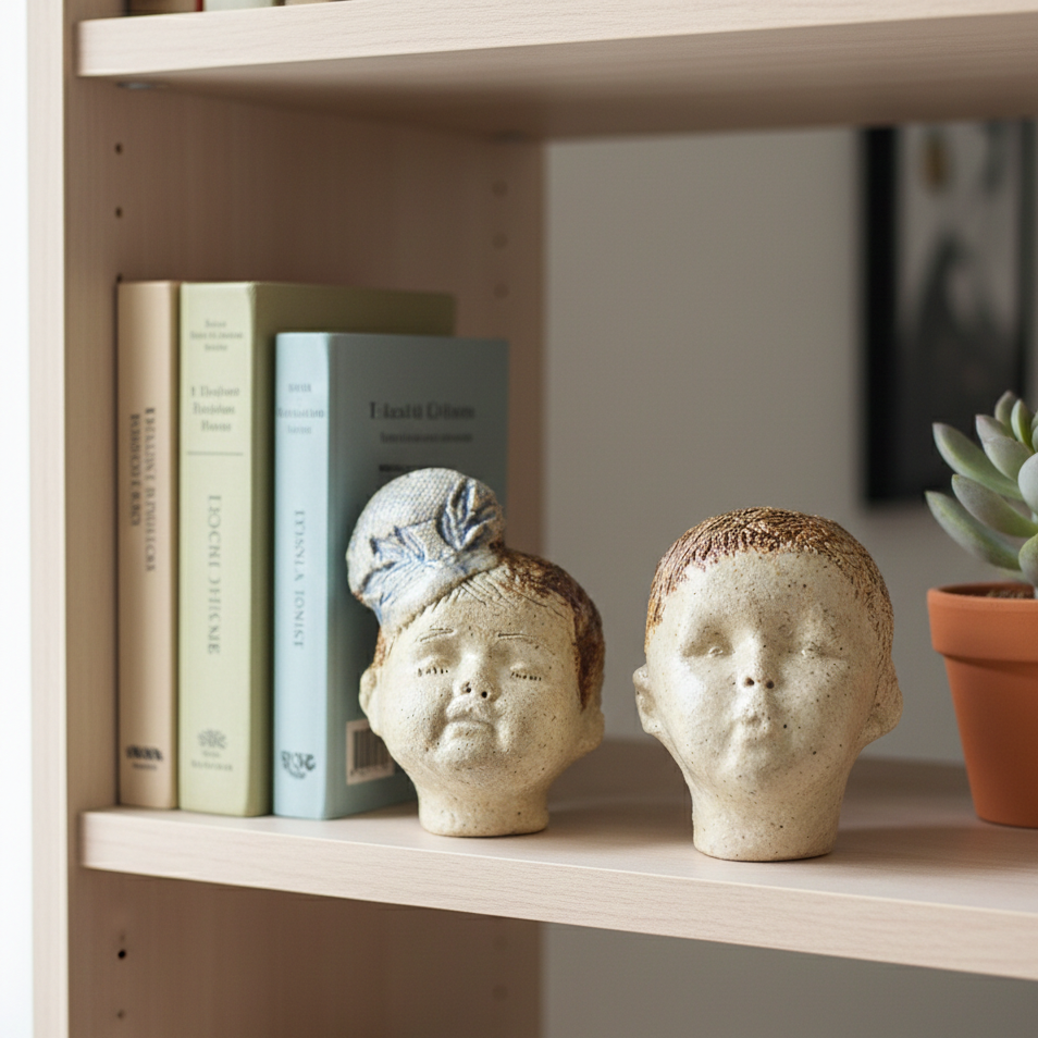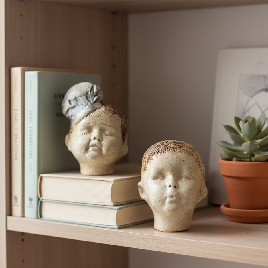 Pareja de cabecitas. Realizadas en gres y decoradas con esmaltes de alta temperatura. El precio indicado corresponde a la pareja (dos piezas).