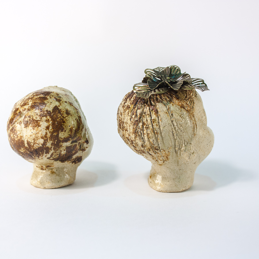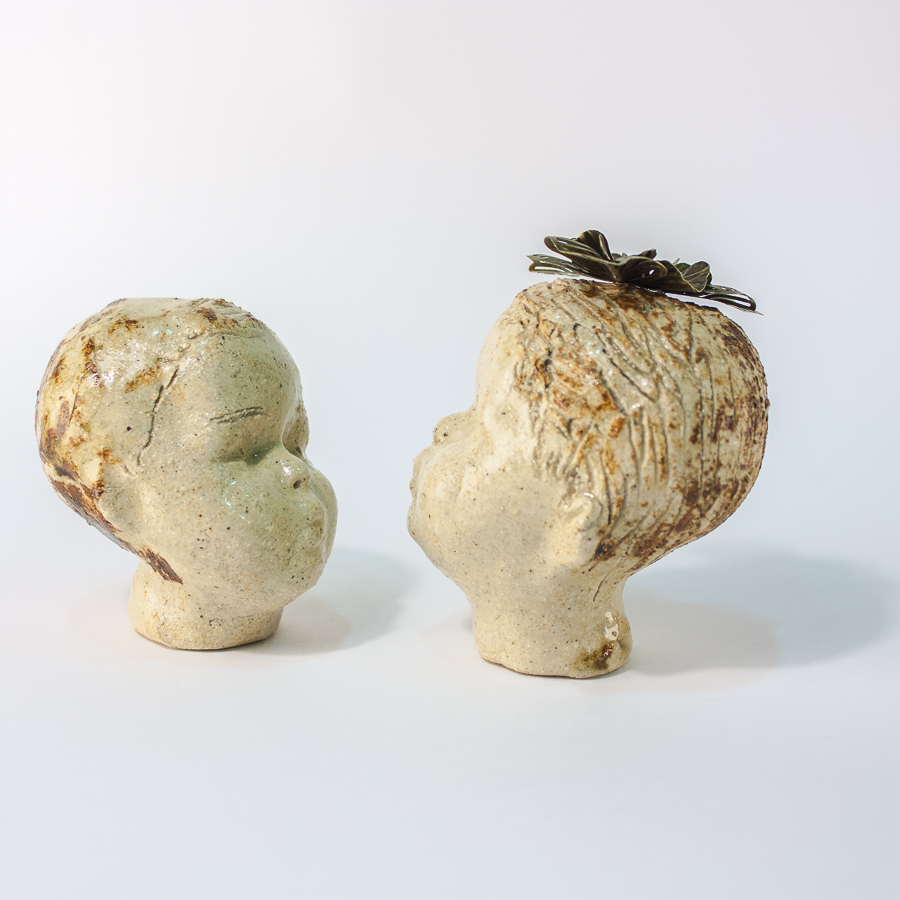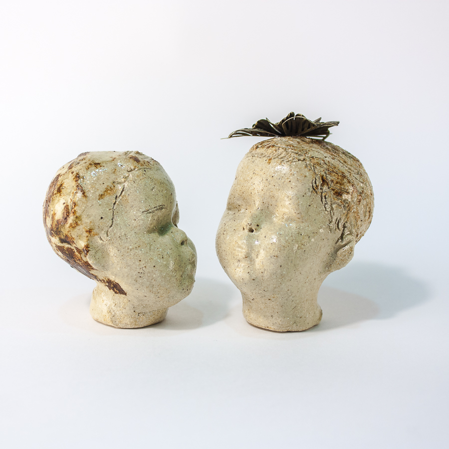 Pareja de cabecitas de niño y niña. Realizadas en gres y decoradas con esmaltes de alta temperatura. El precio indicado corresponde a la pareja (dos cabezas).