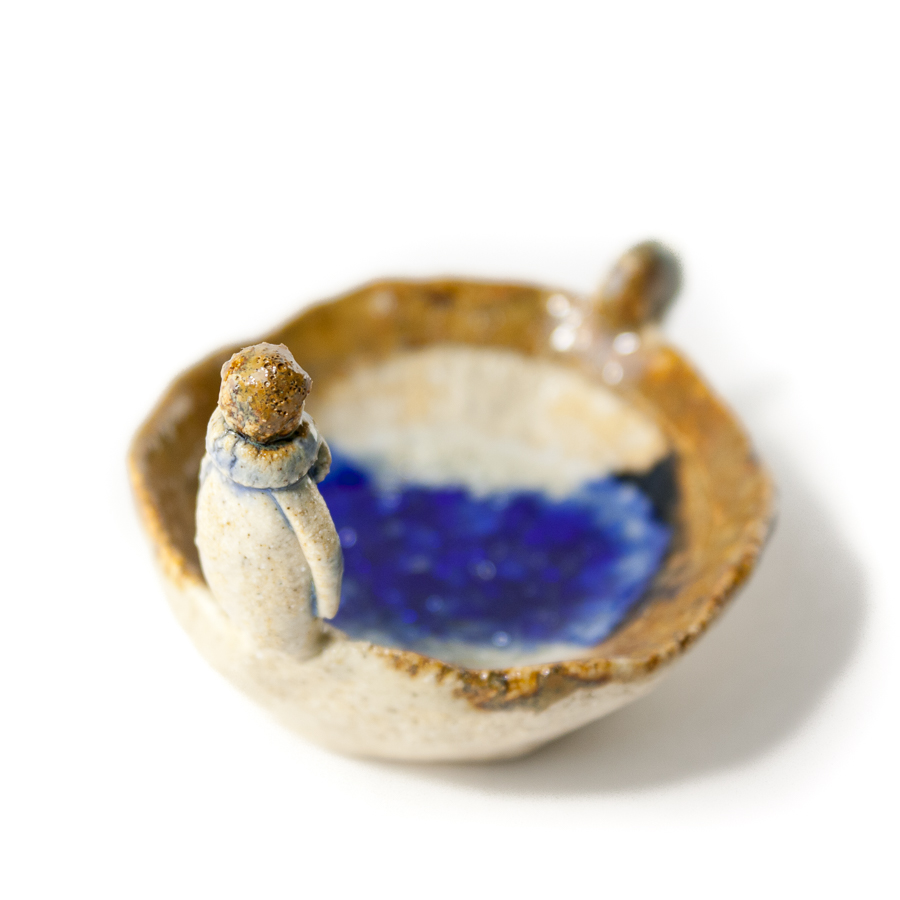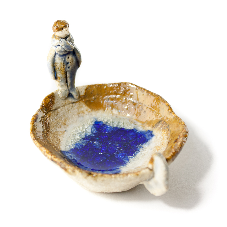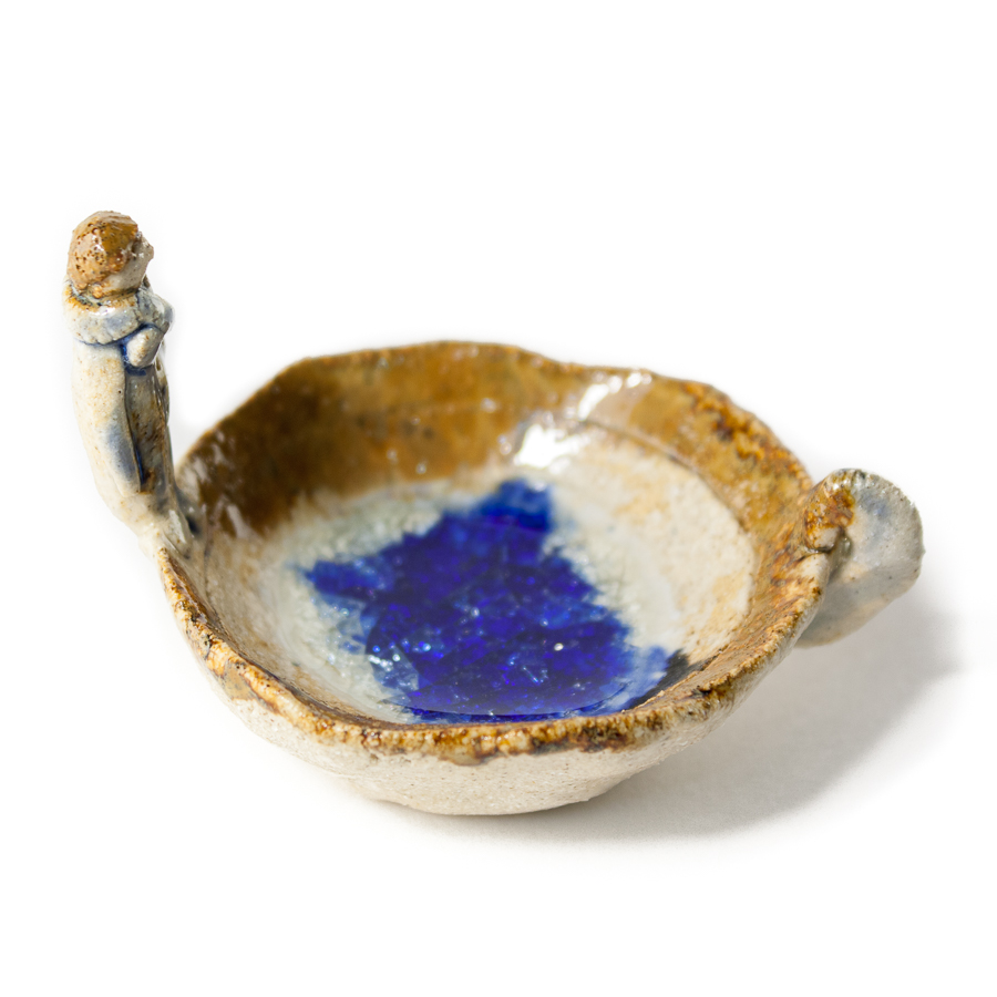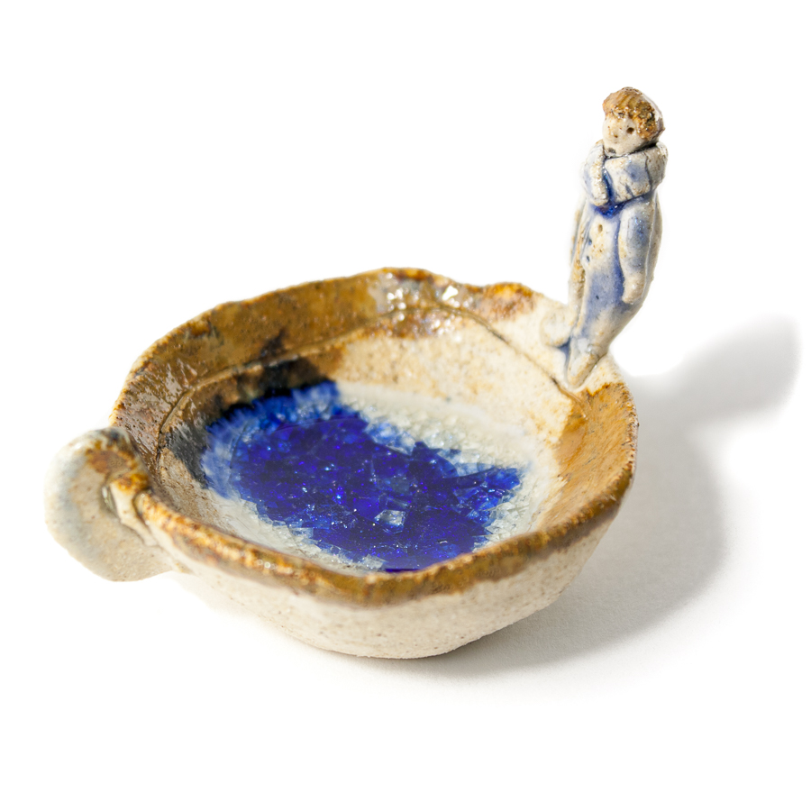 Cuenco con niño que pasea por el borde. Realizado en gres y decorado con esmaltes de alta temperatura en tonos beige, ocre, transparente y cristal fundido azul.