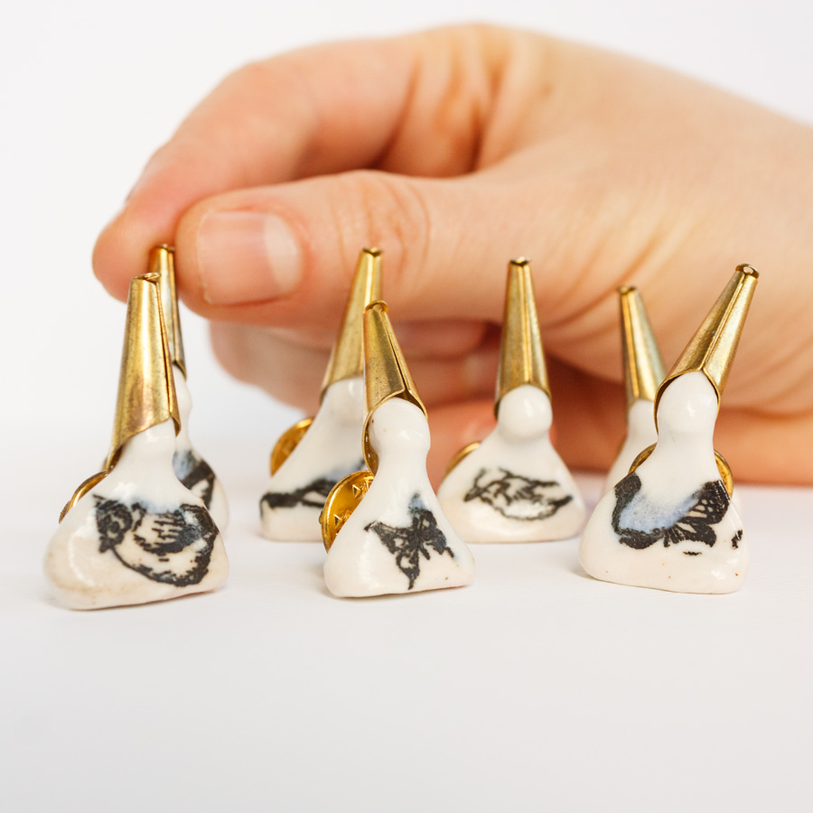 Pin cucurucho de porcelana serigrafiada y esmaltada. Precio por unidad.