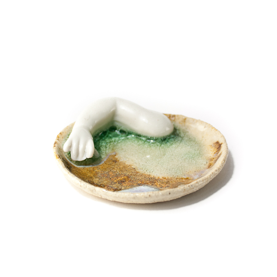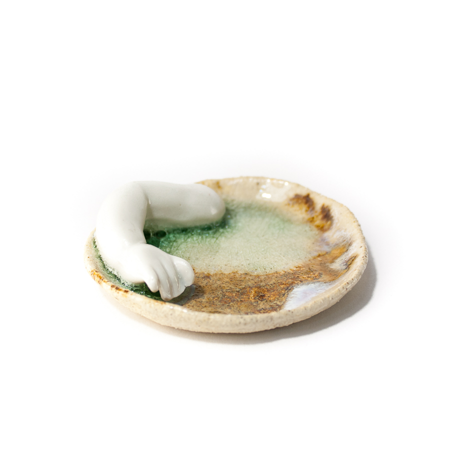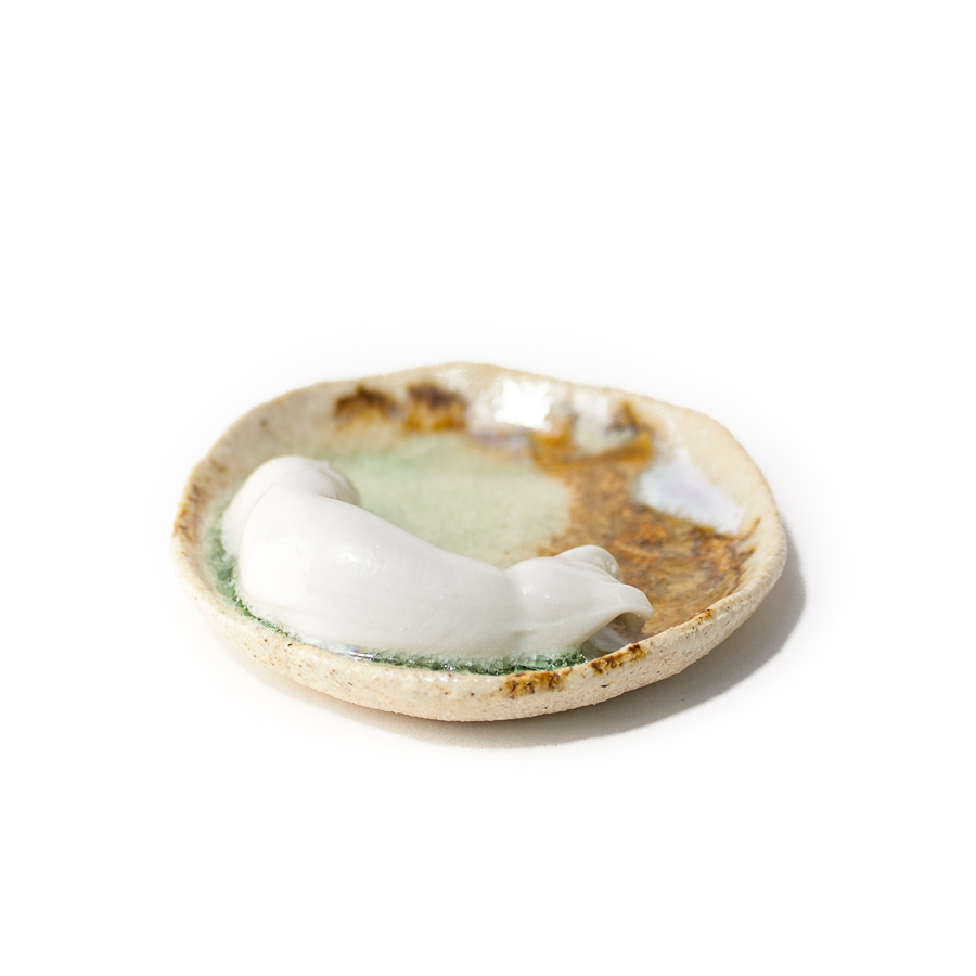 Plato con bracito. Realizado en gres y porcelana. Decorado con esmaltes de alta temperatura en tonos beige, ocre, transparente y cristal fundido verde claro. Ideal para depositar, anillos, pendientes o como objeto decorativo.