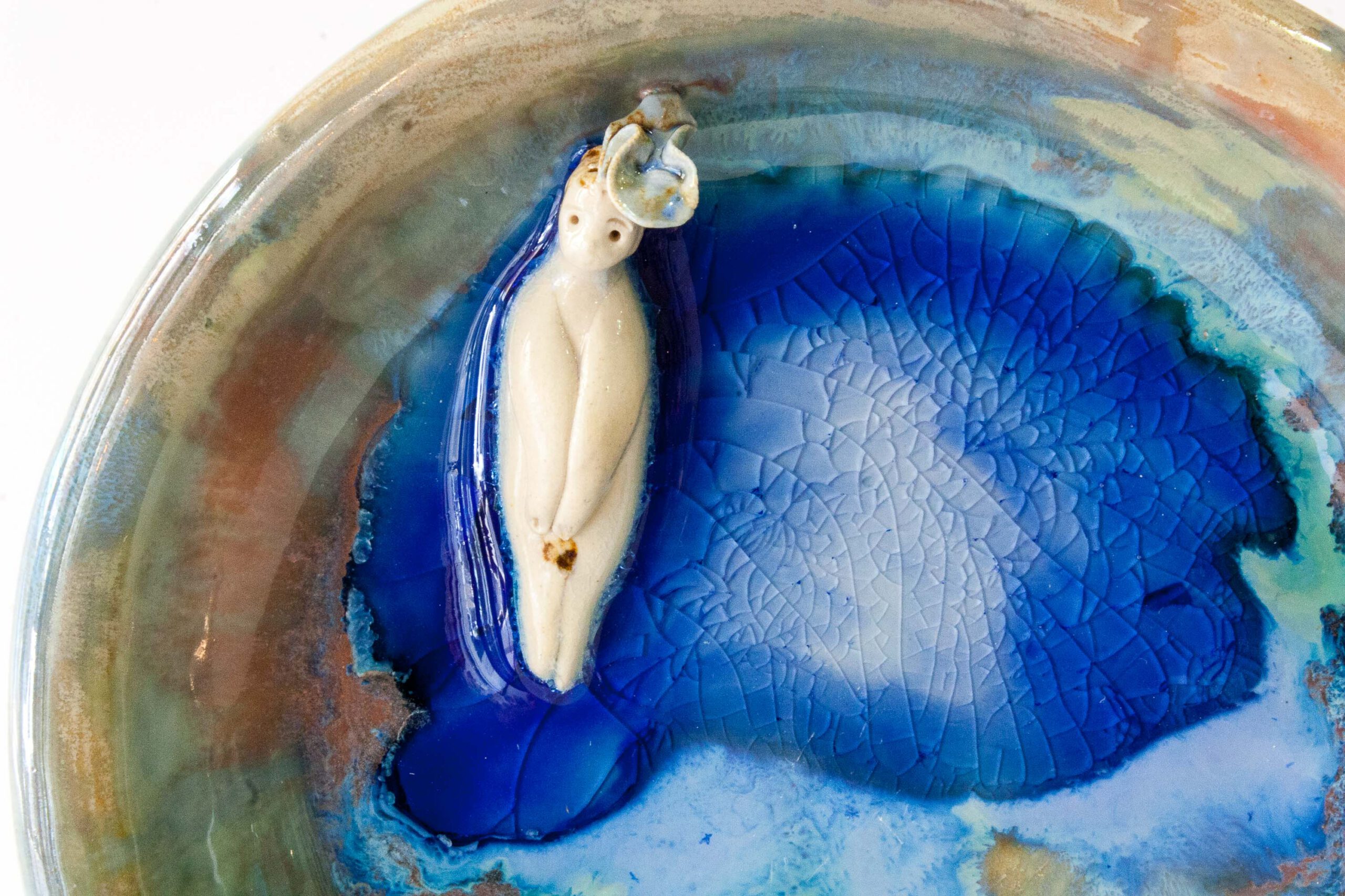 Hombre pájaro sentado sobre cuenco de gres