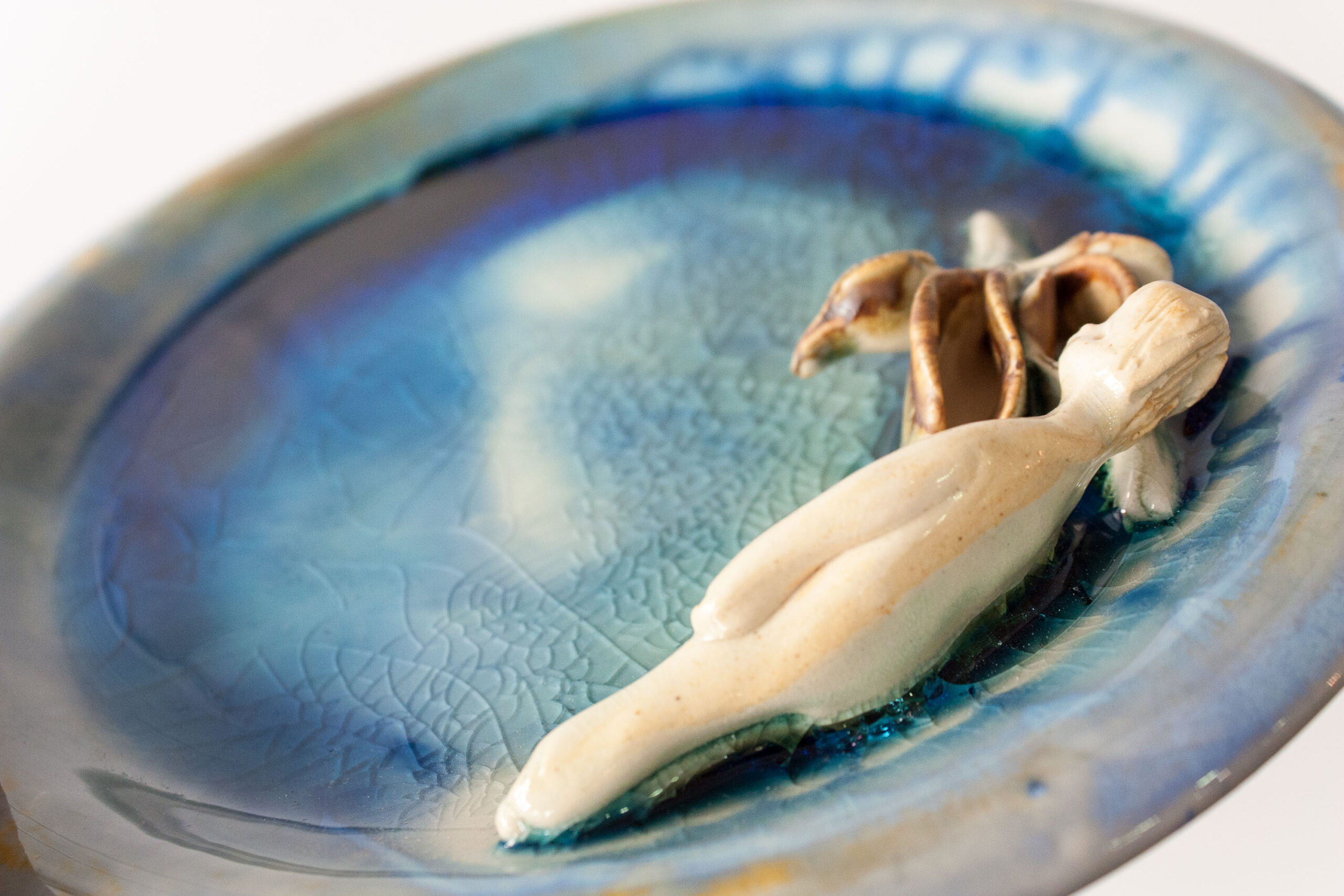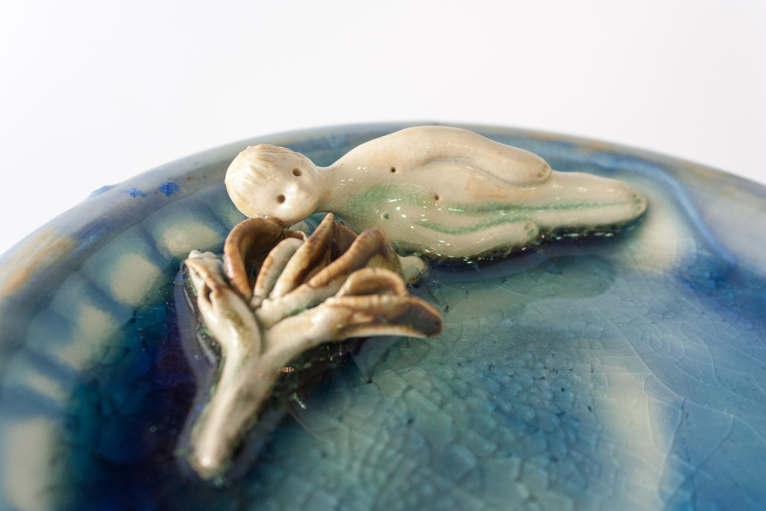 Plato decorativo de cerámica gres con figuras en relieve de un niño y una rama, para colgar en la pared o poner sobre soporte de platos. También puedes colocarlo sobre una mesa para depositar tus joyas.