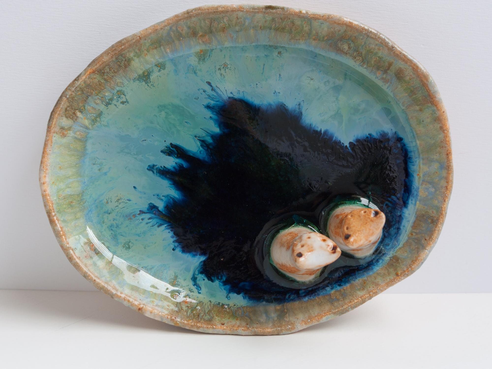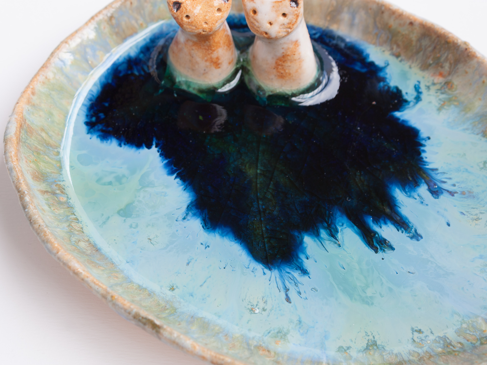 Fabricado en gres y decorado con esmaltes y vidriados en tonos azules y beis, de gran resistencia. La pieza se cuece a 1240 ºC en nuestro horno cerámico.