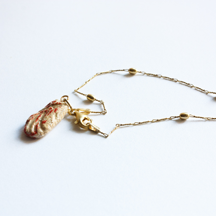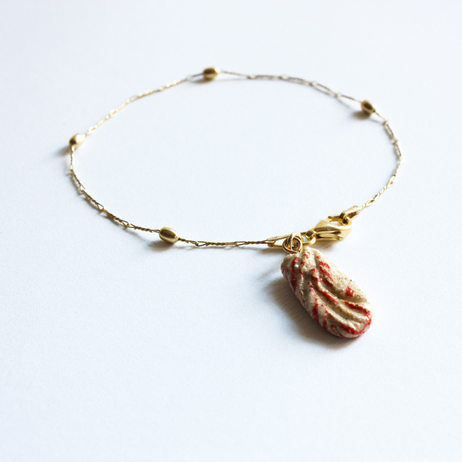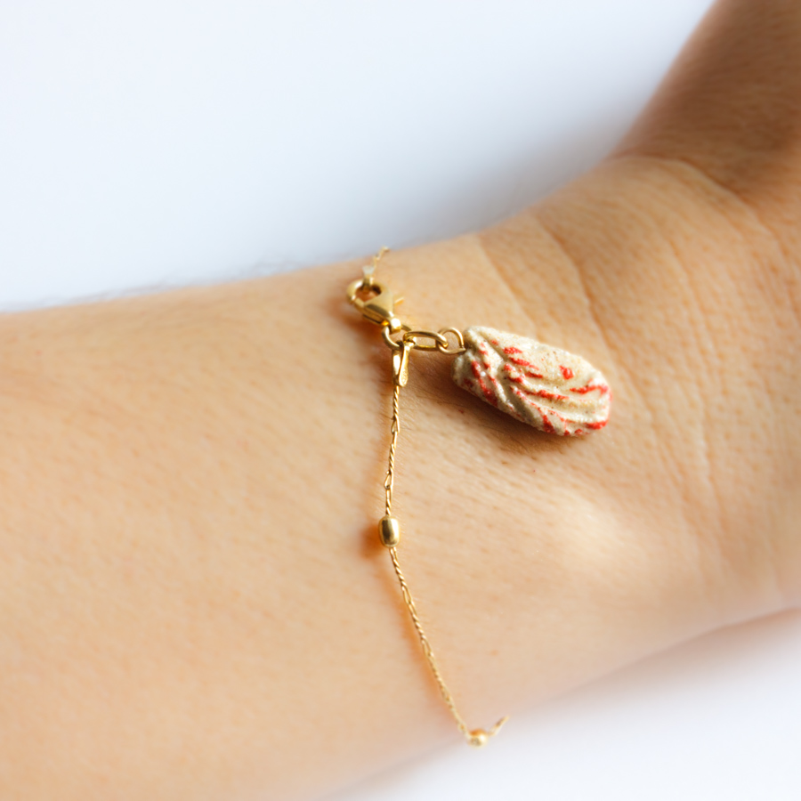 Pulsera de plata chapada en oro con lágrima modelada a mano en gres serigrafiada y esmaltada.