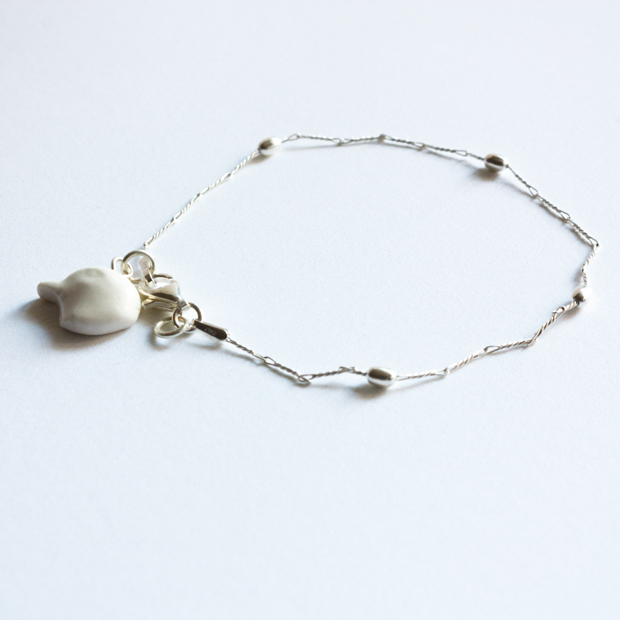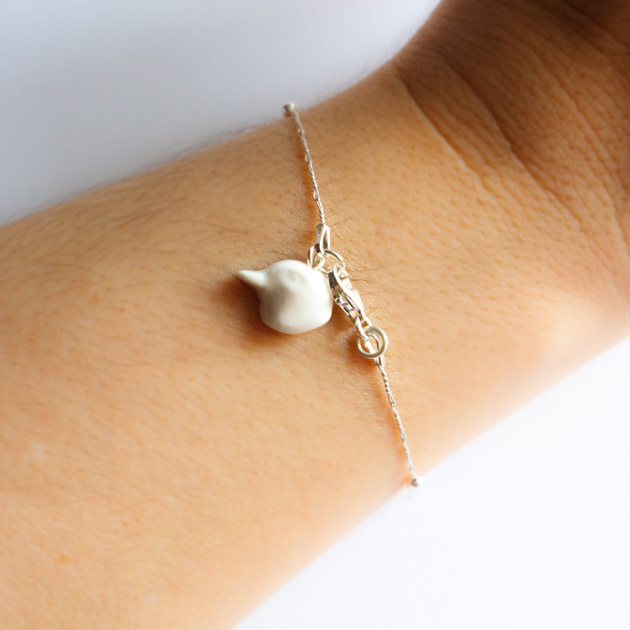 Pulsera de plata con cabeza de pajarito en porcelana esmaltado transparente.